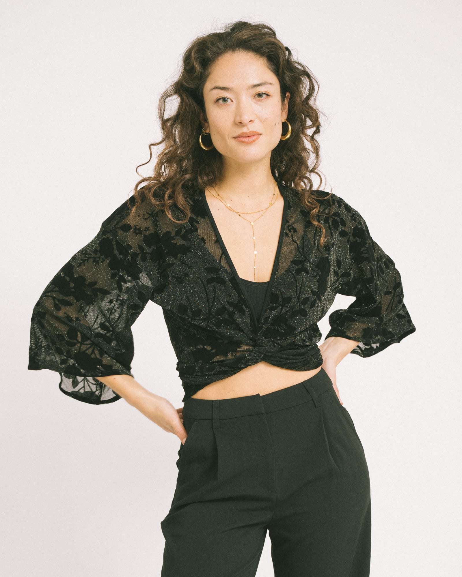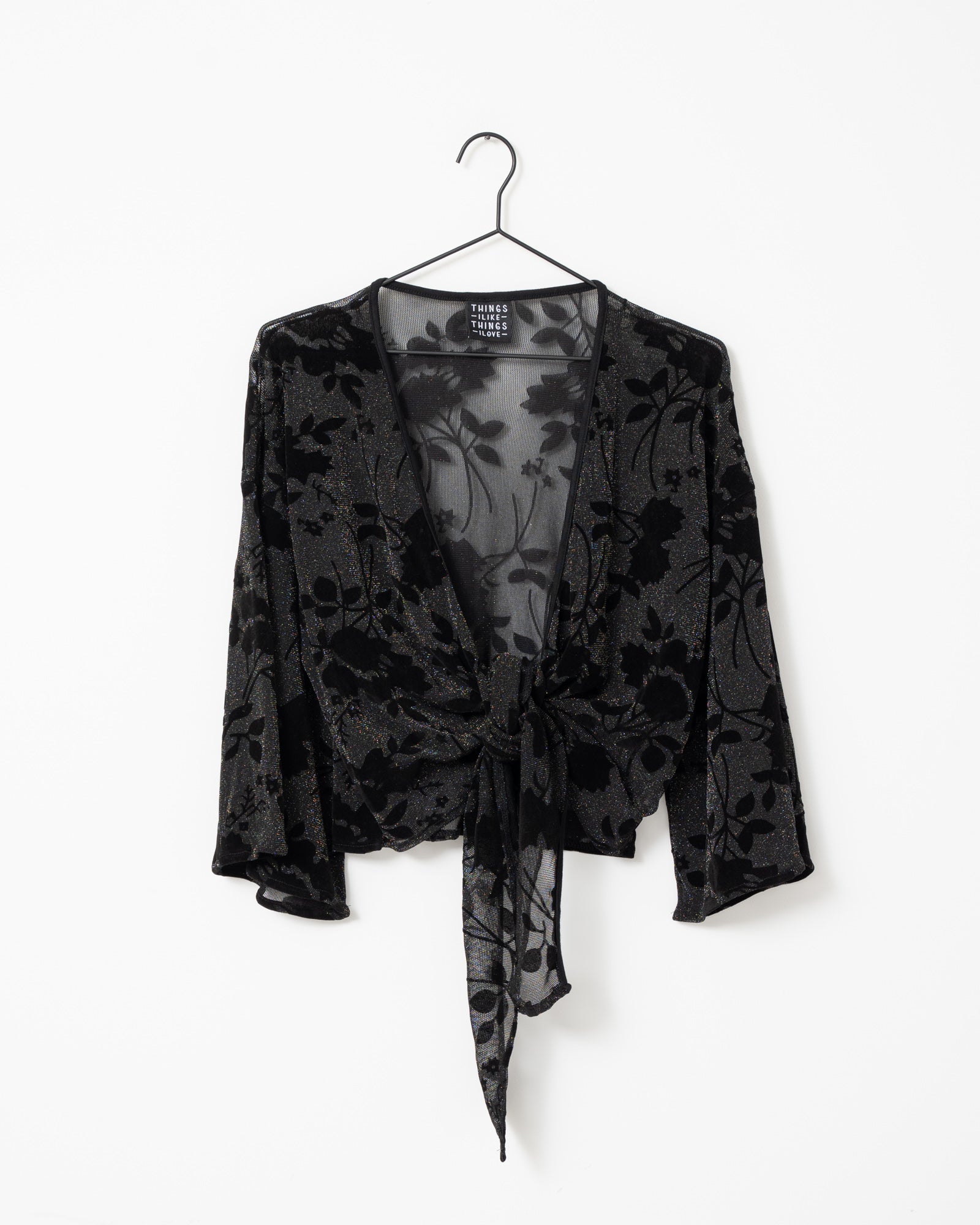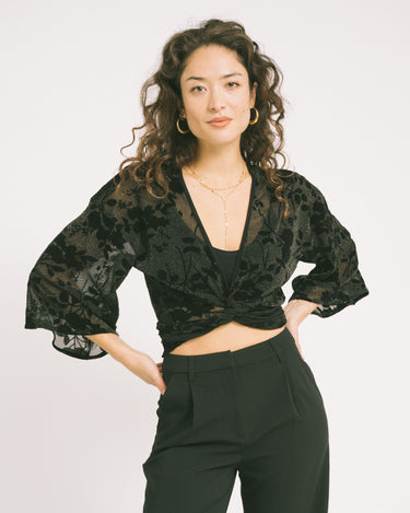 Dieses Wickeloberteil aus glitzerndem Samt hat verspielte, ausgestellte Ärmel. Es lässt sich auf zwei Arten tragen: vorne binden für eine kürzere, verspielte Passform oder hinten für einen etwas dezenteren Look.