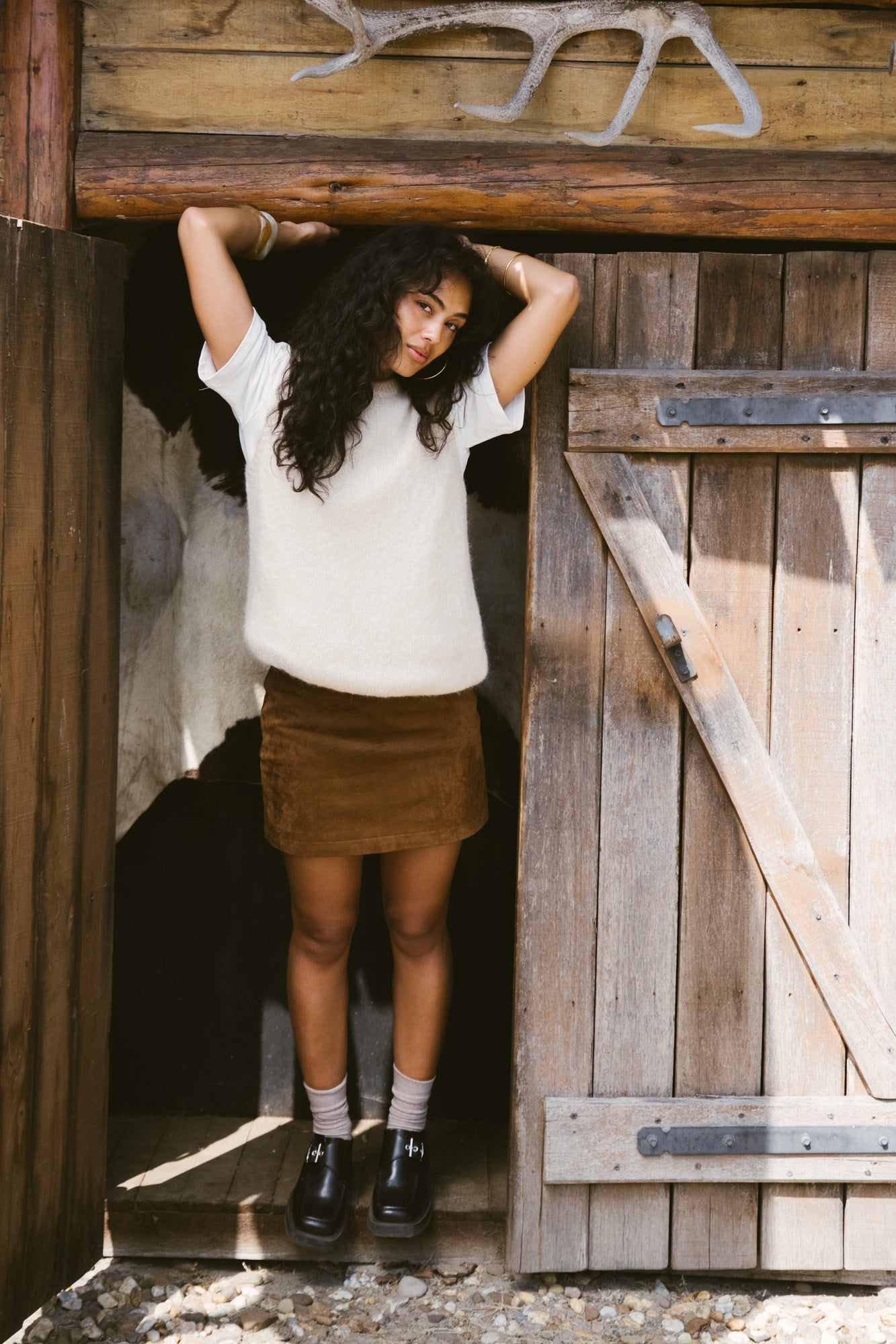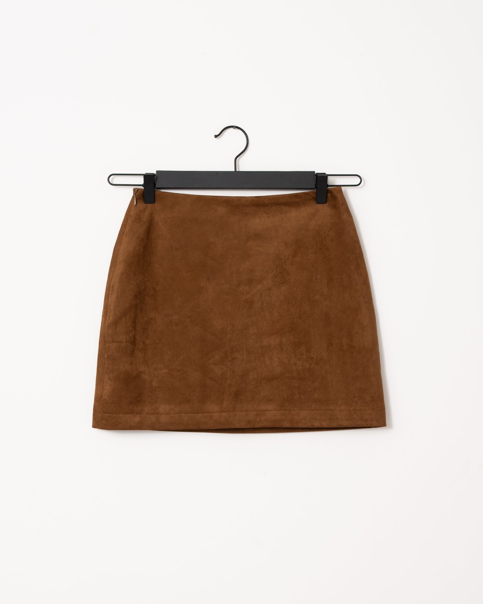 Dieser Minirock in Wildlederoptik in Cognac ist Ihr neuer Begleiter für jeden Anlass. Kombinieren Sie ihn mit klobigen Boots oder klassisch mit Bluse und Heels. Der weiche Stoff und die zeitlose Farbe machen ihn unendlich vielseitig.