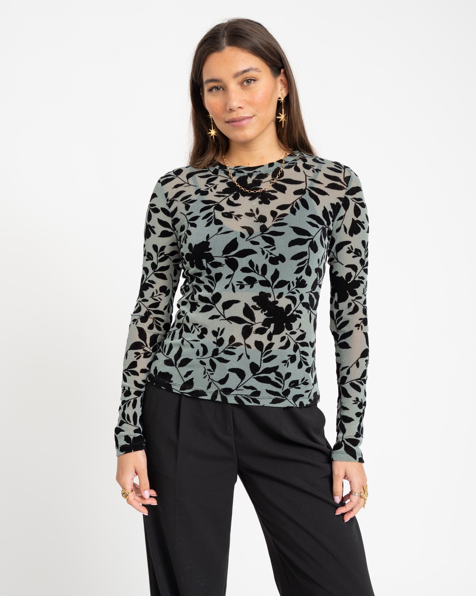 Deze glitter mesh top met velvet bloemenprint tilt elke outfit moeiteloos naar een hoger niveau. Combineer ‘m met een bralette voor een avondje uit of draag ‘m casual onder een blazer voor een chique touch.