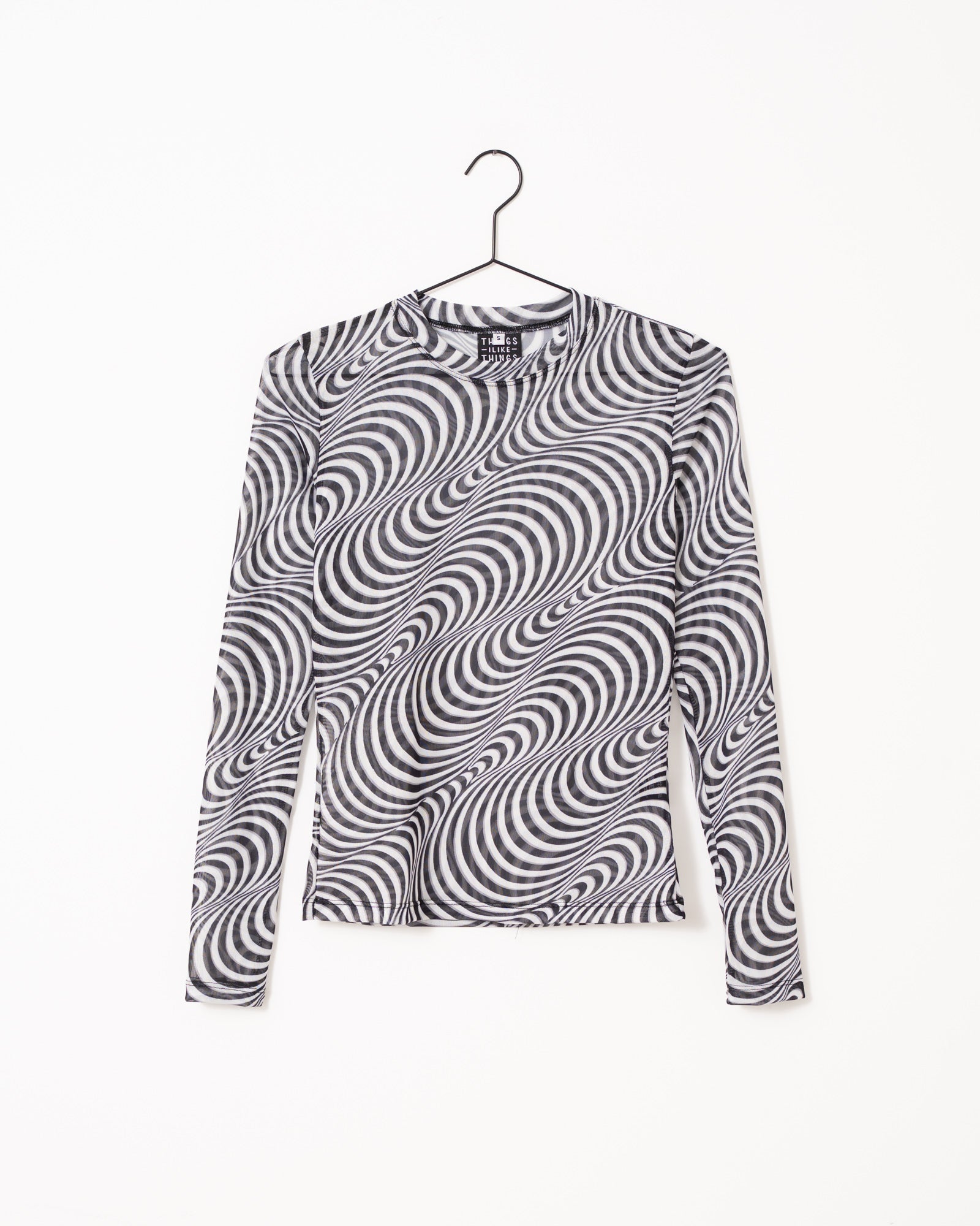 Das Tanina Longsleeve Swirl Black ist ein Mesh-Top mit verspieltem Wirbelmuster. Tragen Sie es mit einem Bralette.