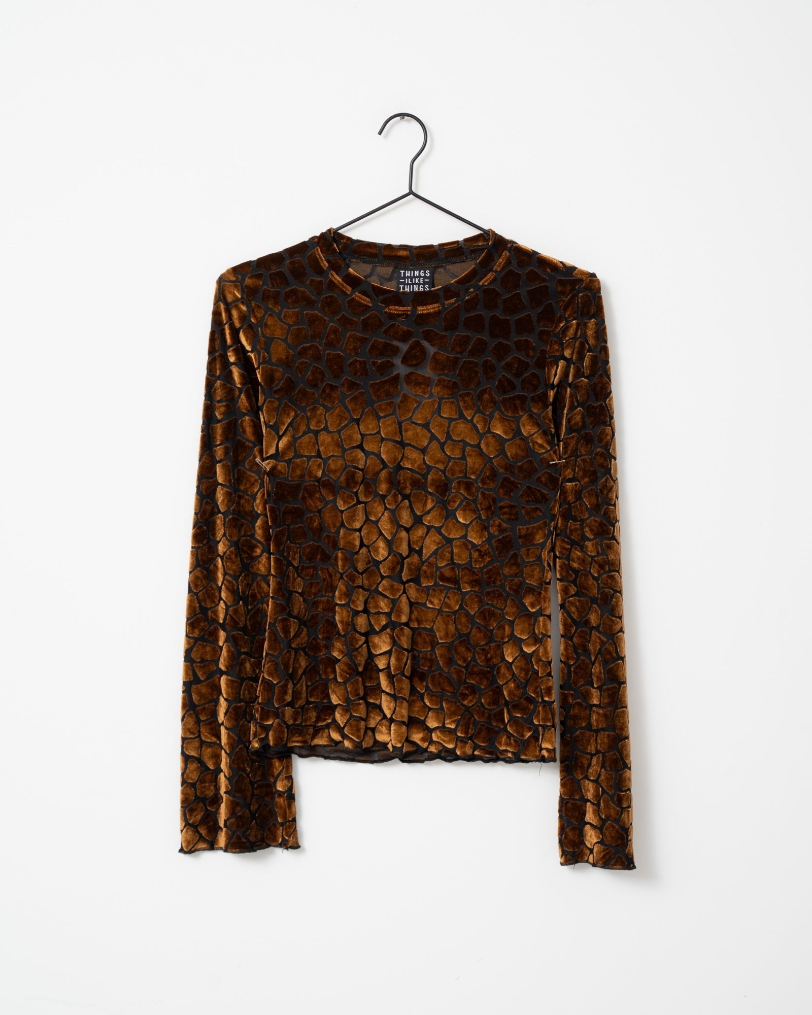 Glänzendes goldenes Top mit ausgestellten Ärmeln und glänzendem Aufdruck.