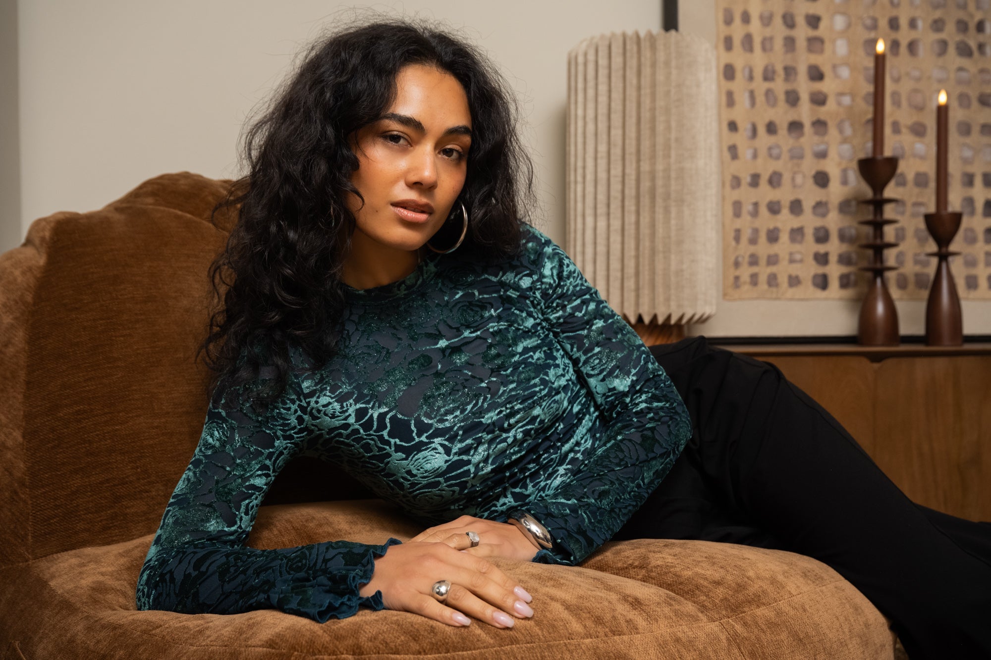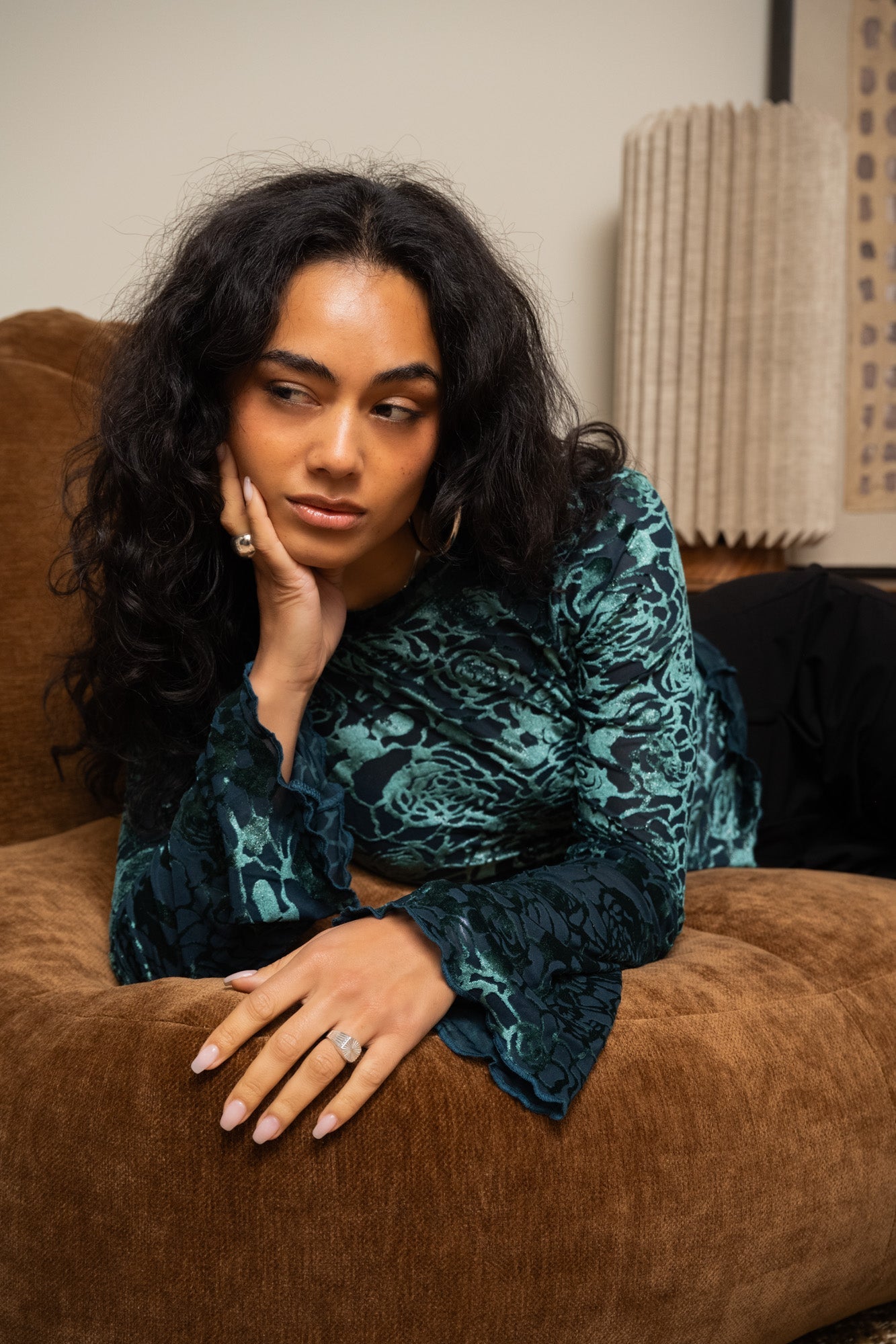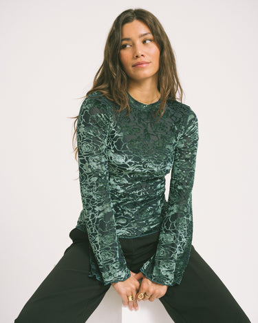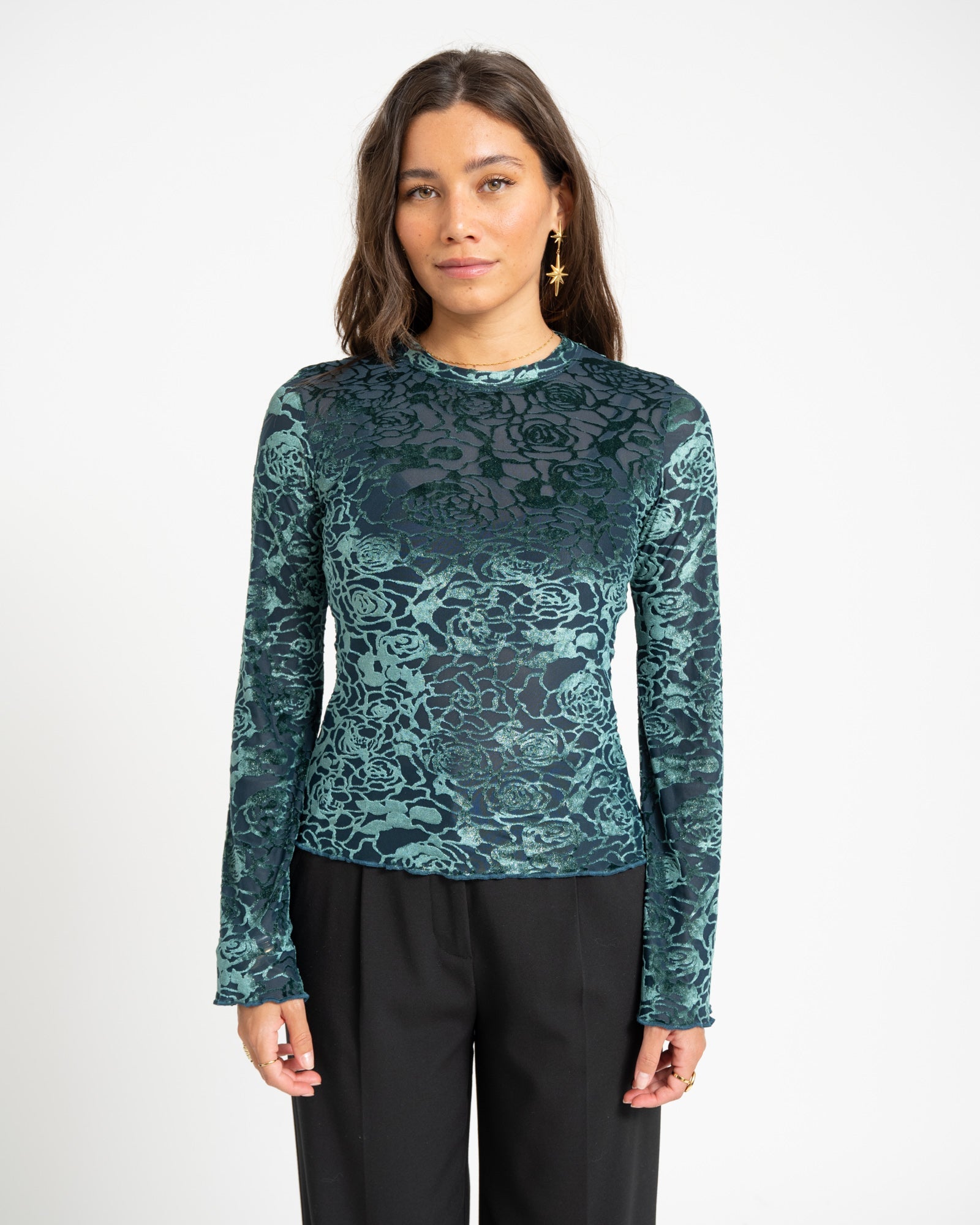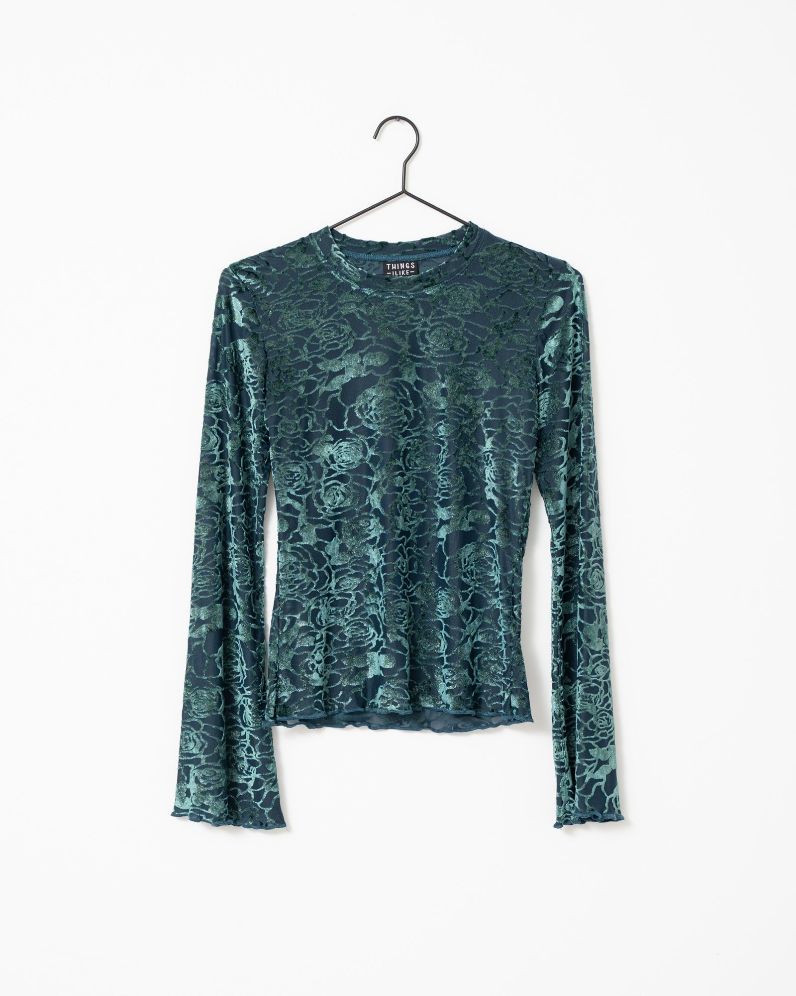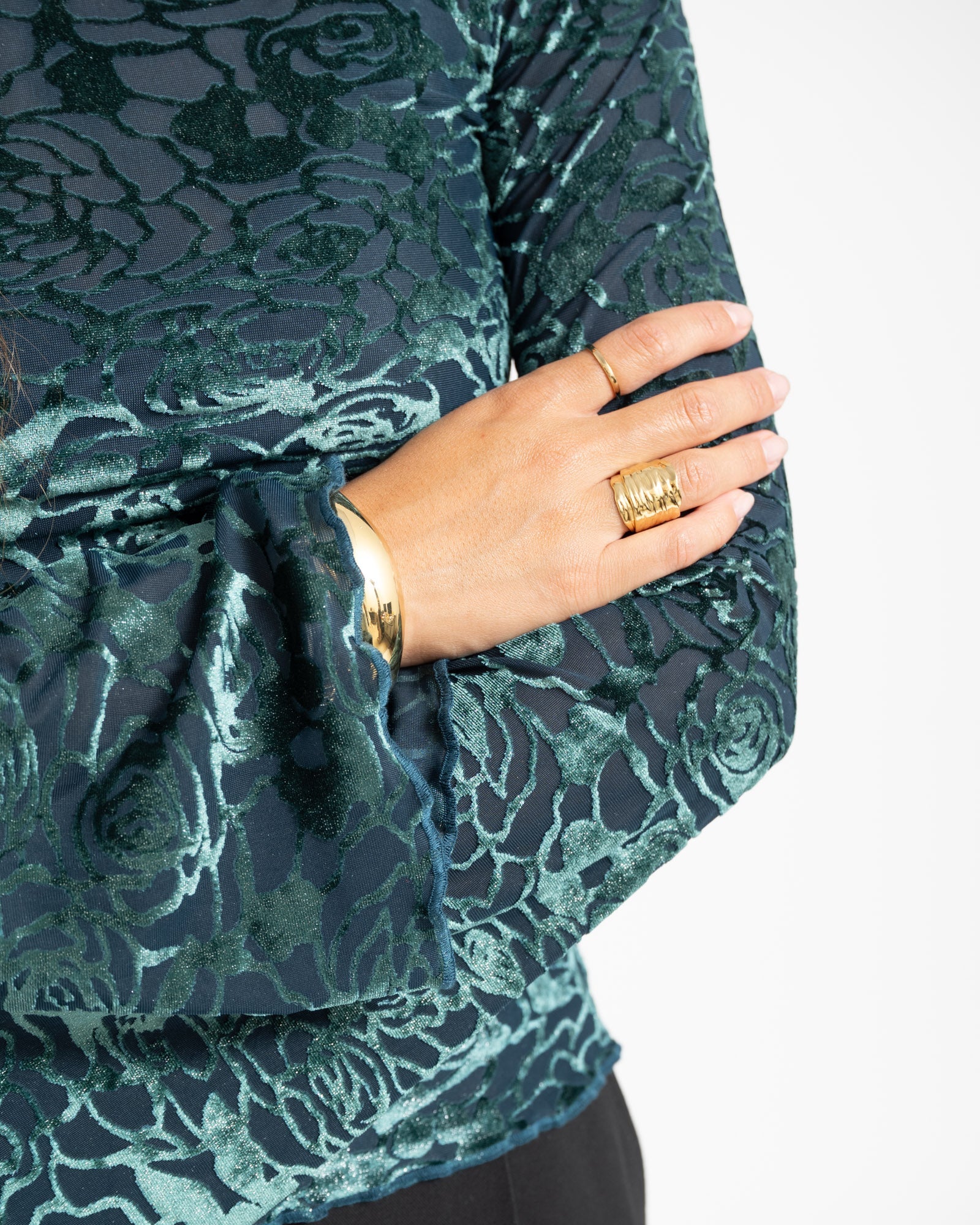 Türkisfarbenes, glänzendes Samttop mit ausgestellten Ärmeln und einem glänzenden Aufdruck.
