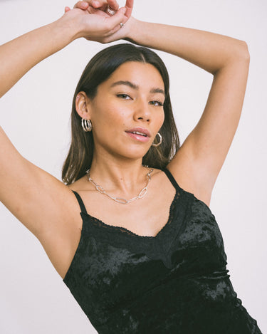 Ein Samttop mit Spitze. Auch schön mit einer Bluse oder einem Blazer kombinierbar.