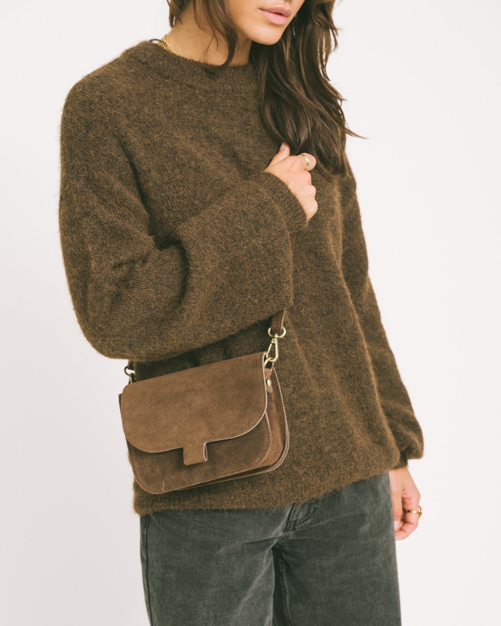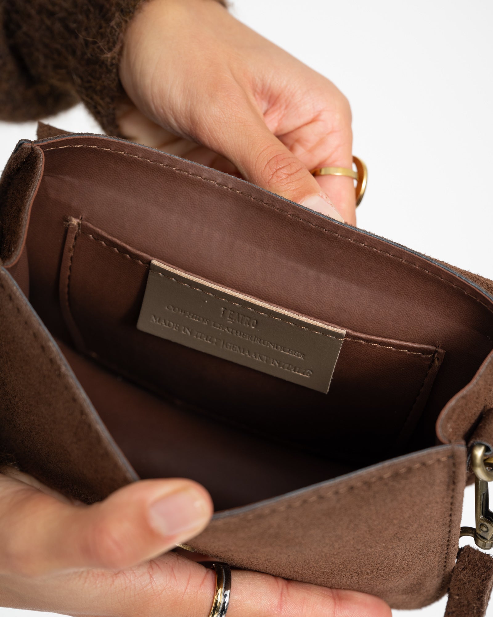 Umhängetasche aus Wildleder mit Magnetverschluss und langem verstellbarem Riemen.