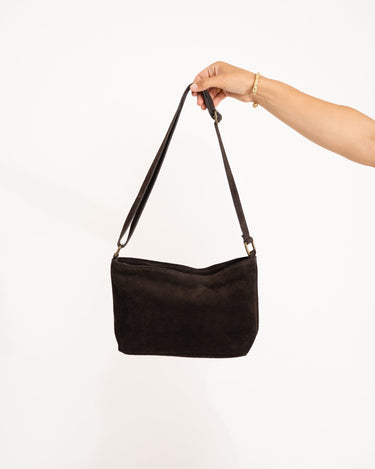Eine schöne, schlichte Umhängetasche aus Wildleder. Das Hauptfach ist mit einem Reißverschluss versehen, innen befindet sich ein kleines Reißverschlussfach. Die Tasche hat einen breiten, verstellbaren Riemen, der sich bequem über der Schulter tragen lässt.
