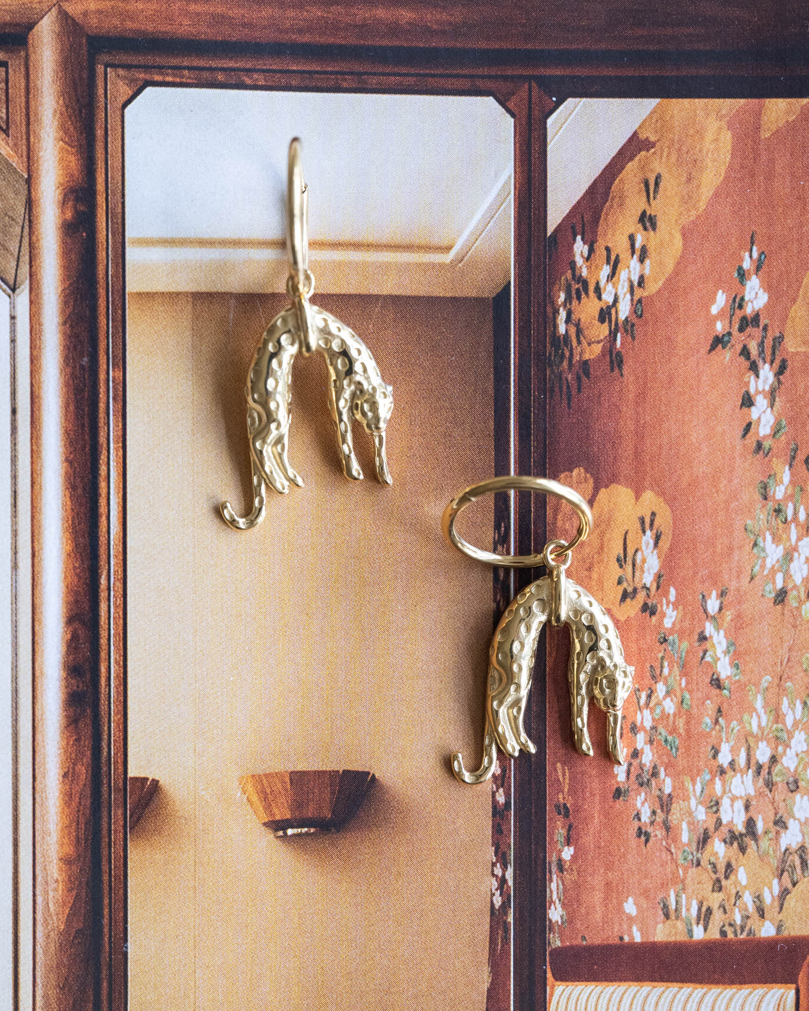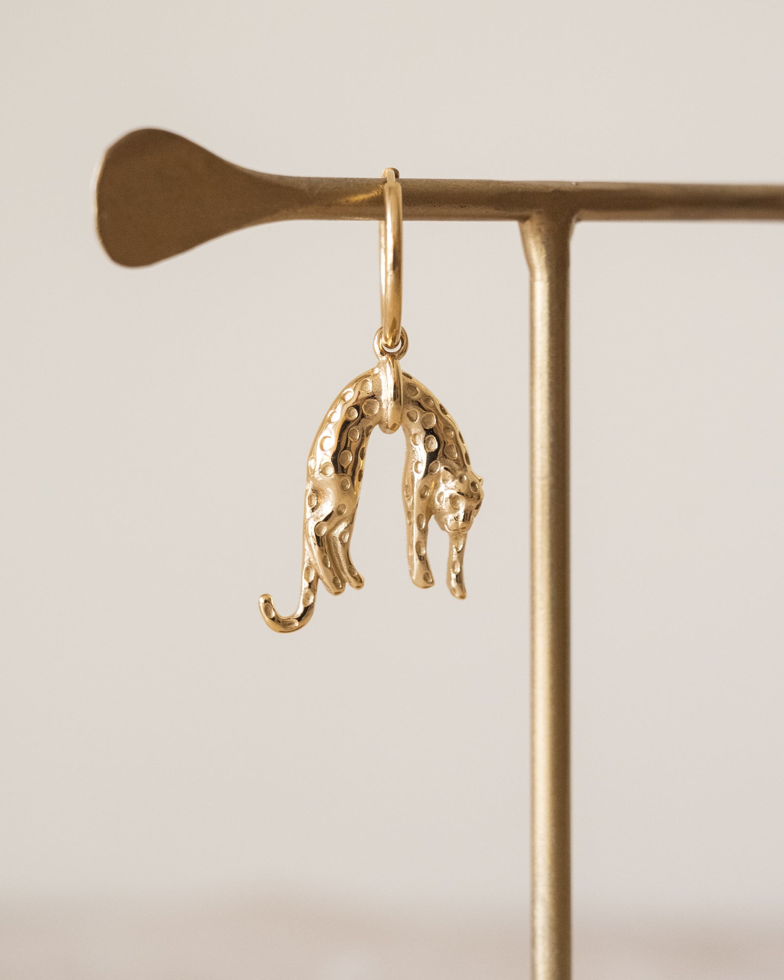 Goldener Ohrring mit hängendem „faulen“ Leoparden.