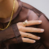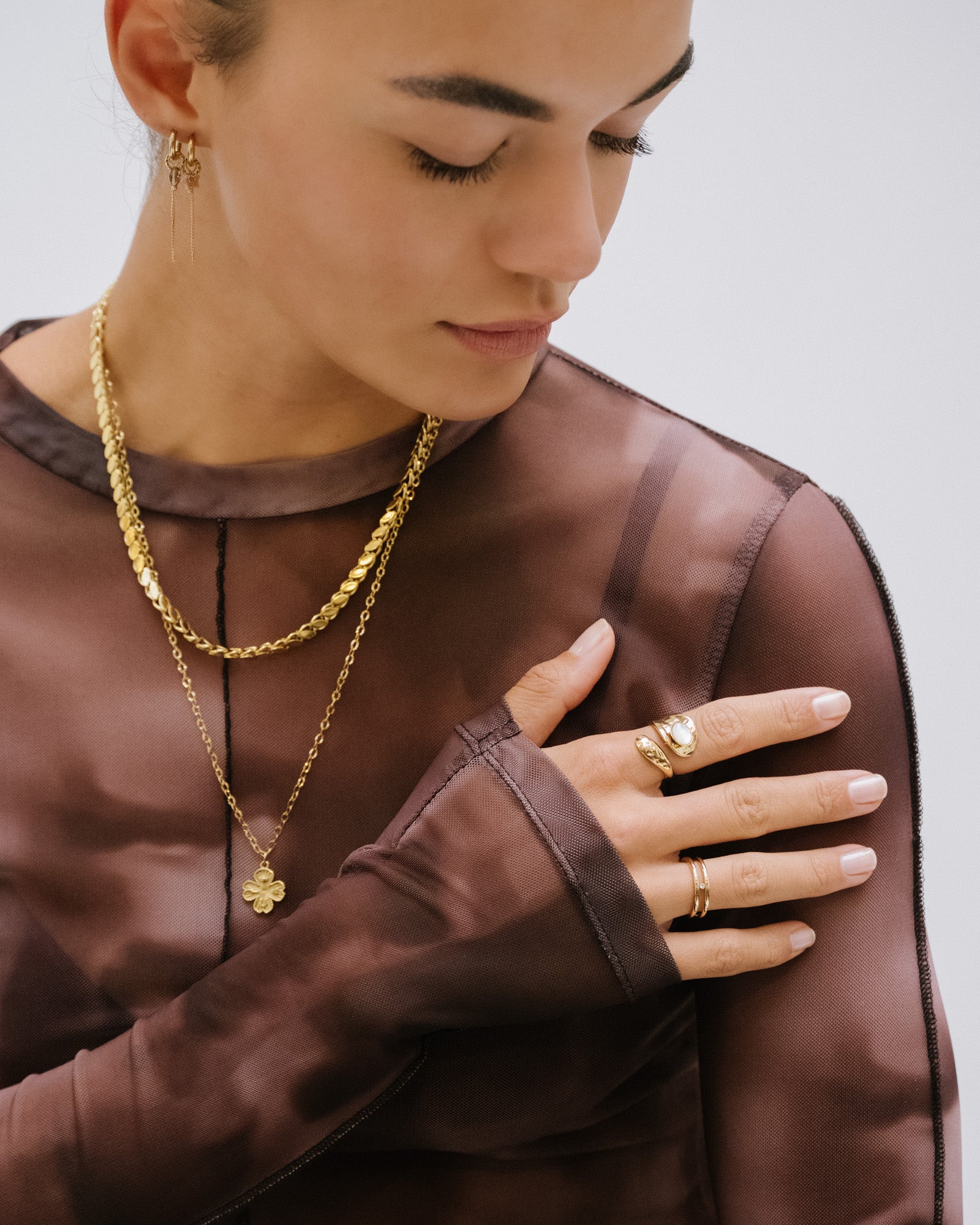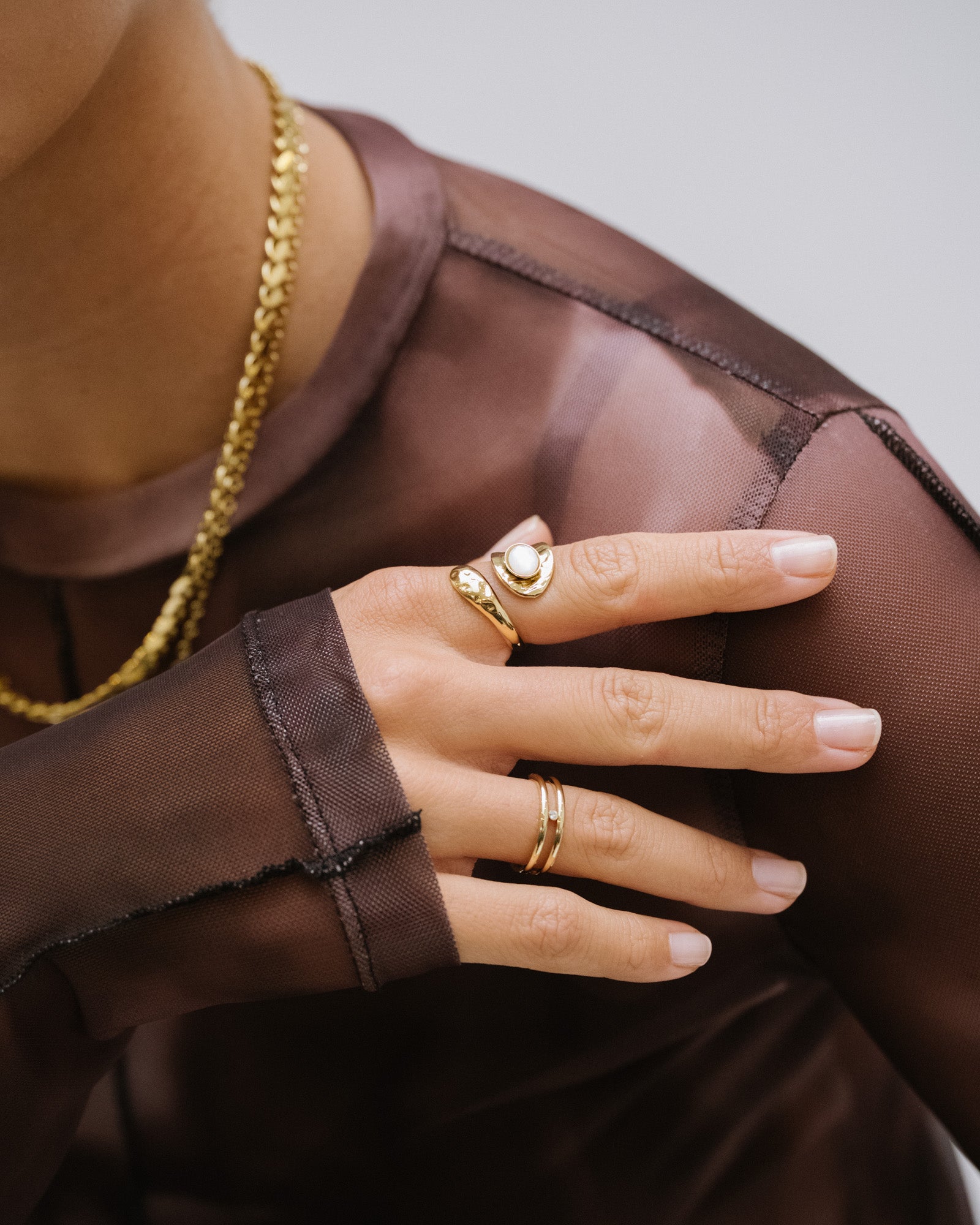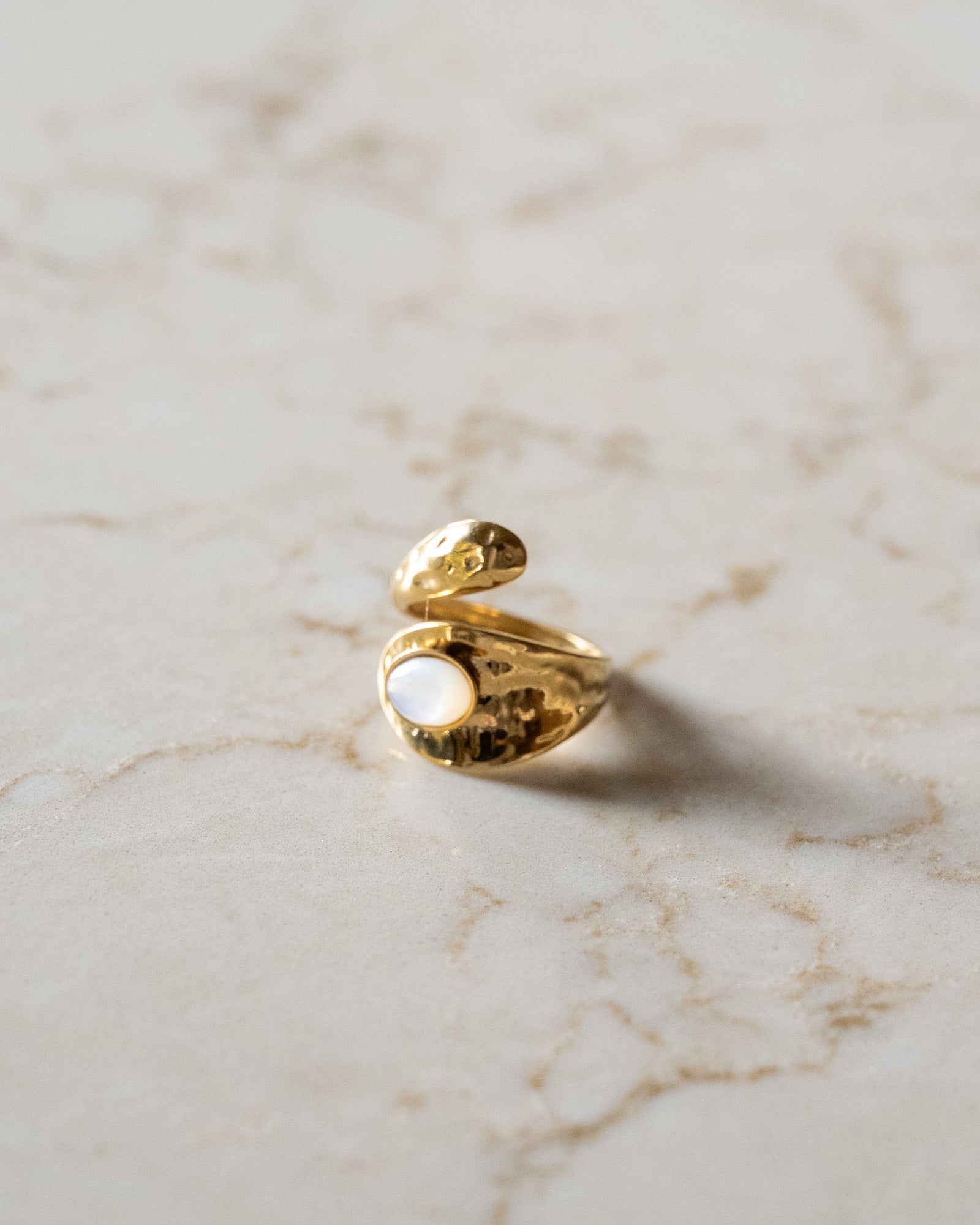 Ring mit offenem Design, einem glänzenden Perlmuttstein und einer dezent gehämmerten Oberfläche.