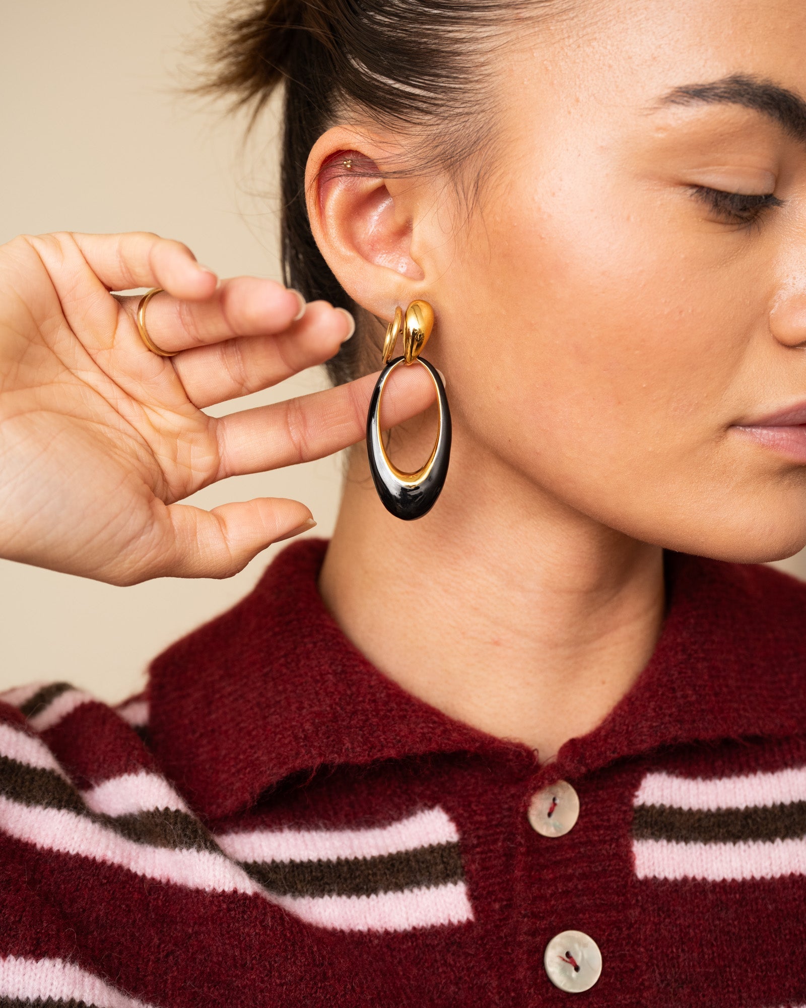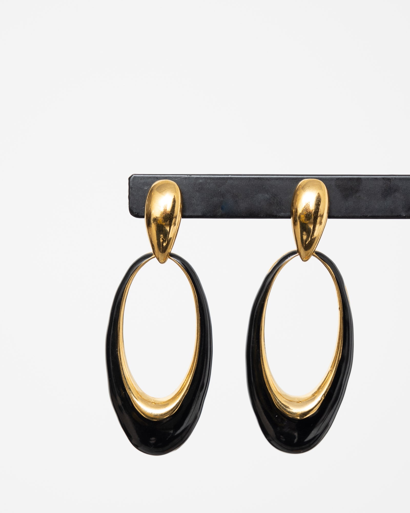 Auffällig und elegant. Diese goldfarbenen Ohrringe mit schwarzen Details verleihen jedem Outfit einen markanten Vintage-Touch.
