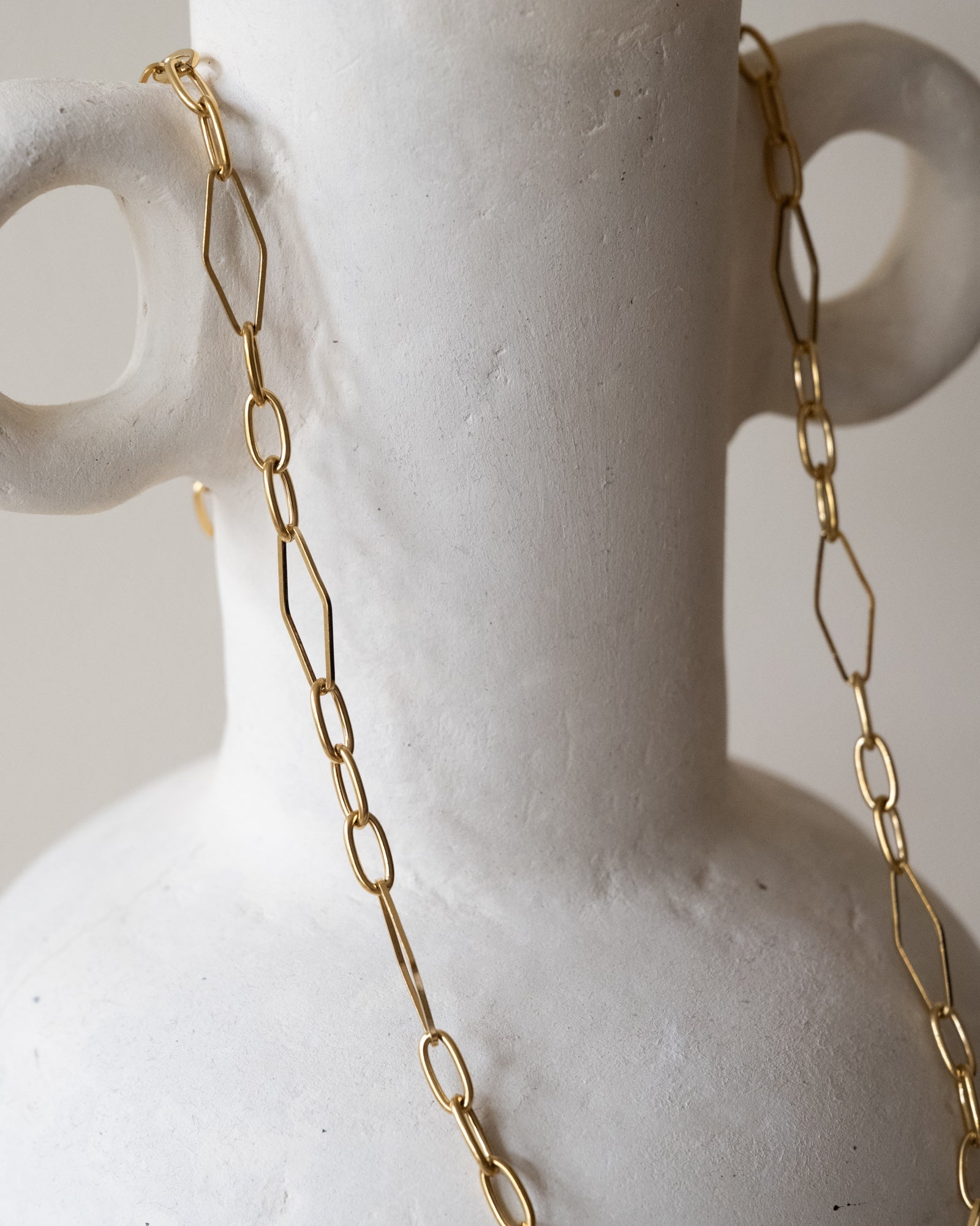 Minimalistische goudkleurige schakelketting met speelse geometrische vormen. Leuk om te combineren met onze andere kettinkjes en zo lagen te creëren in verschillende lengtes