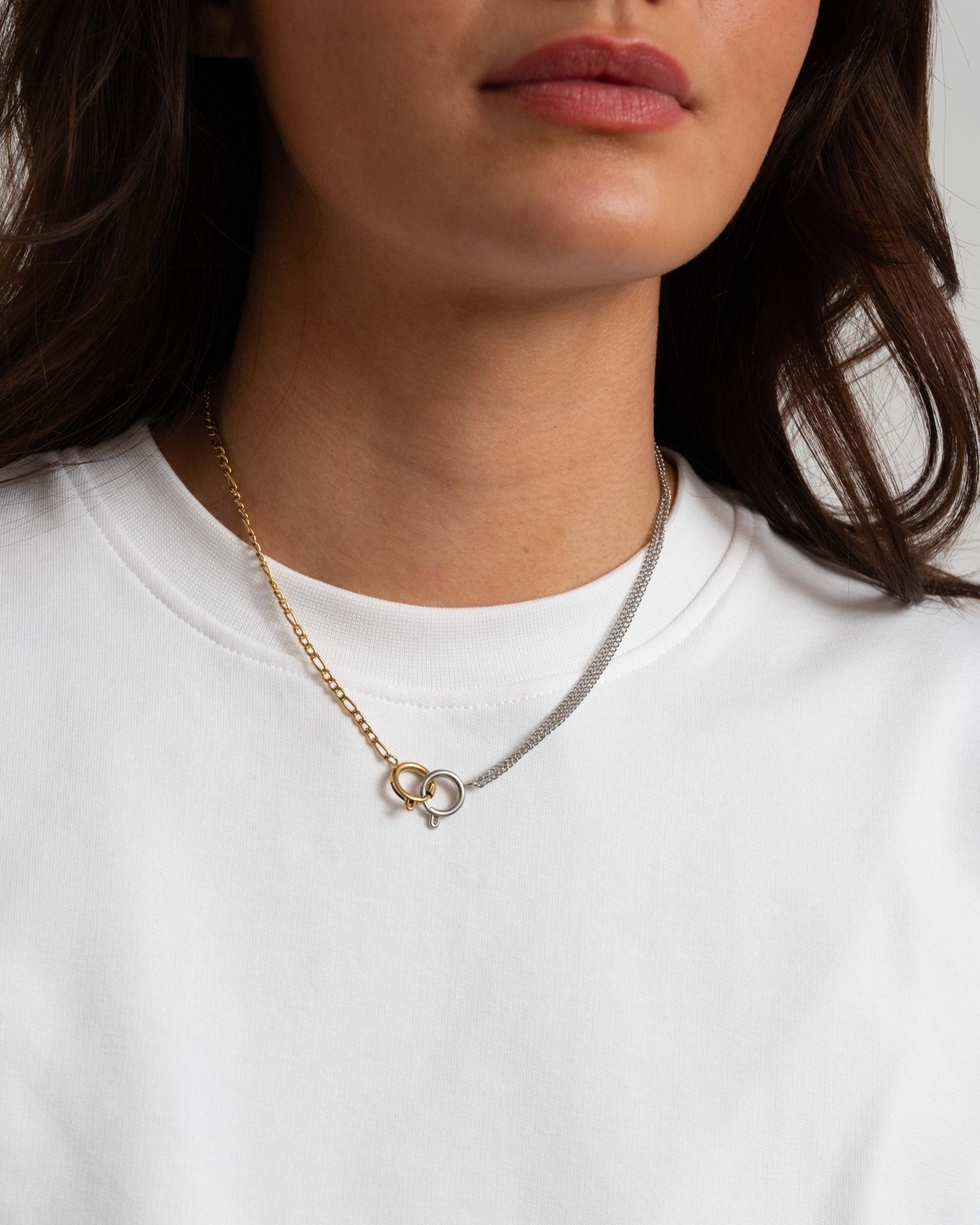 Minimalistische ketting met twee in elkaar verweven ringen, één in zilver en één in goud, aan bijpassende dubbele kettingen.