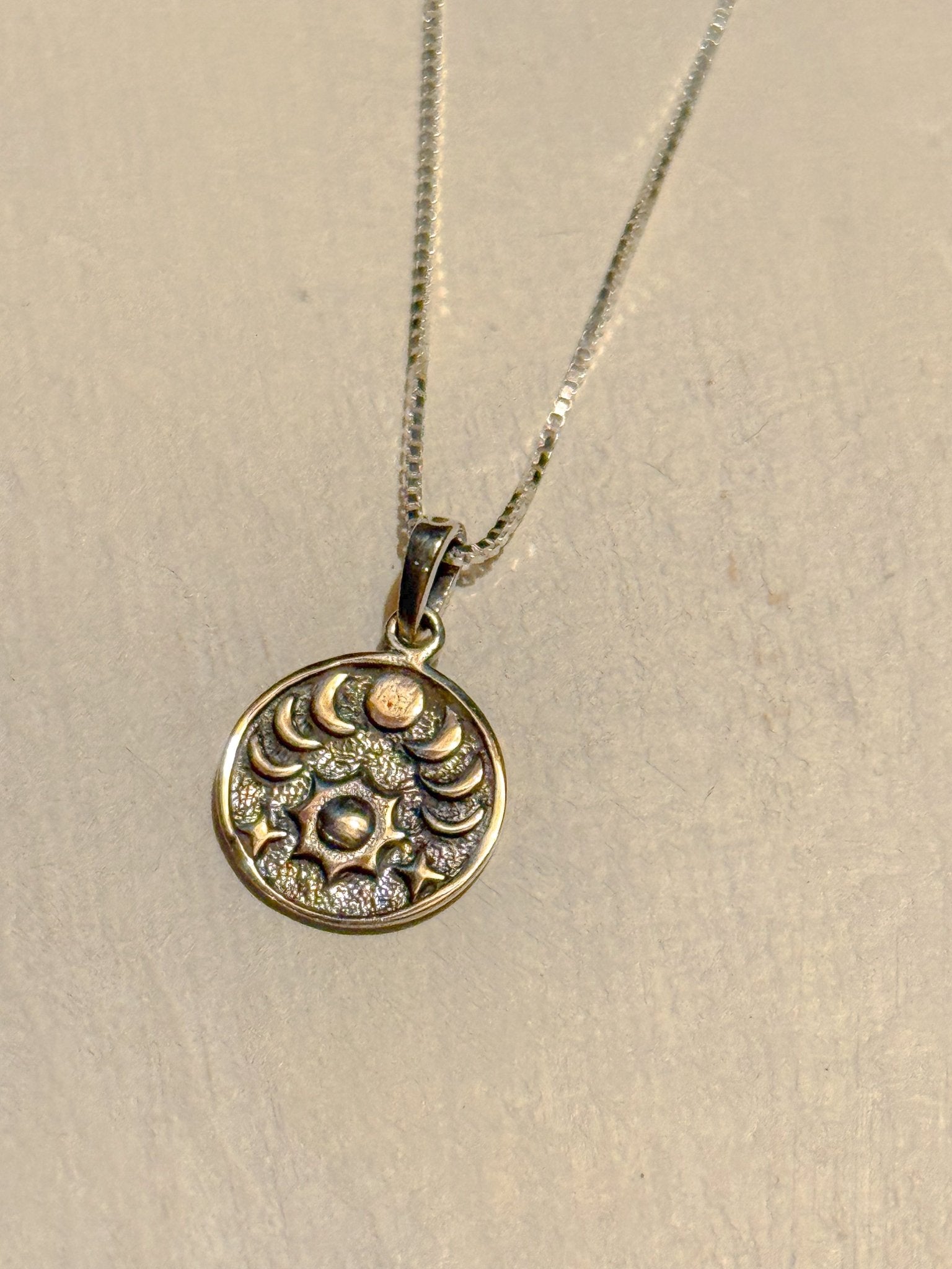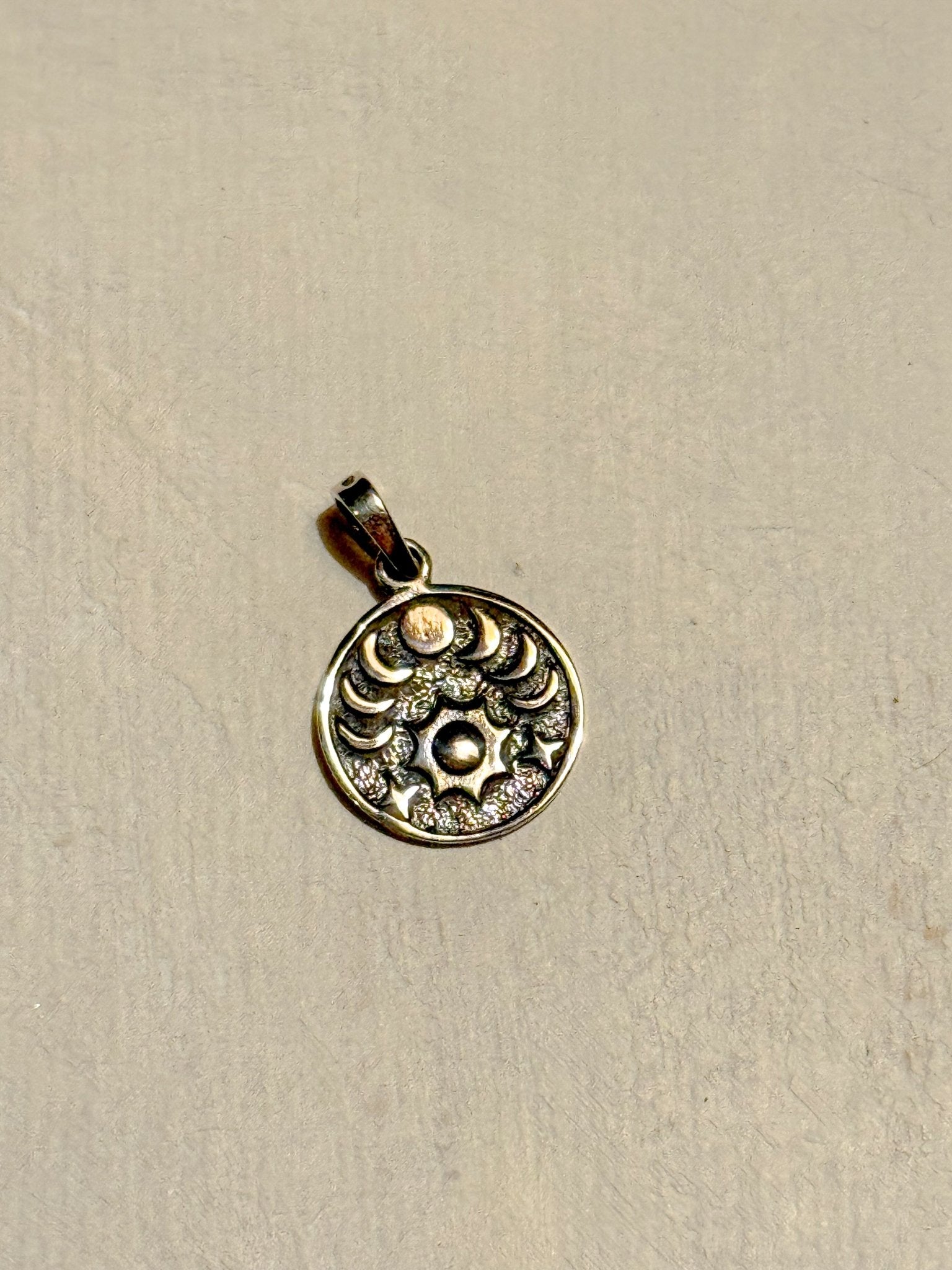 Silberner Halskettenanhänger mit Monden und Sonnen.