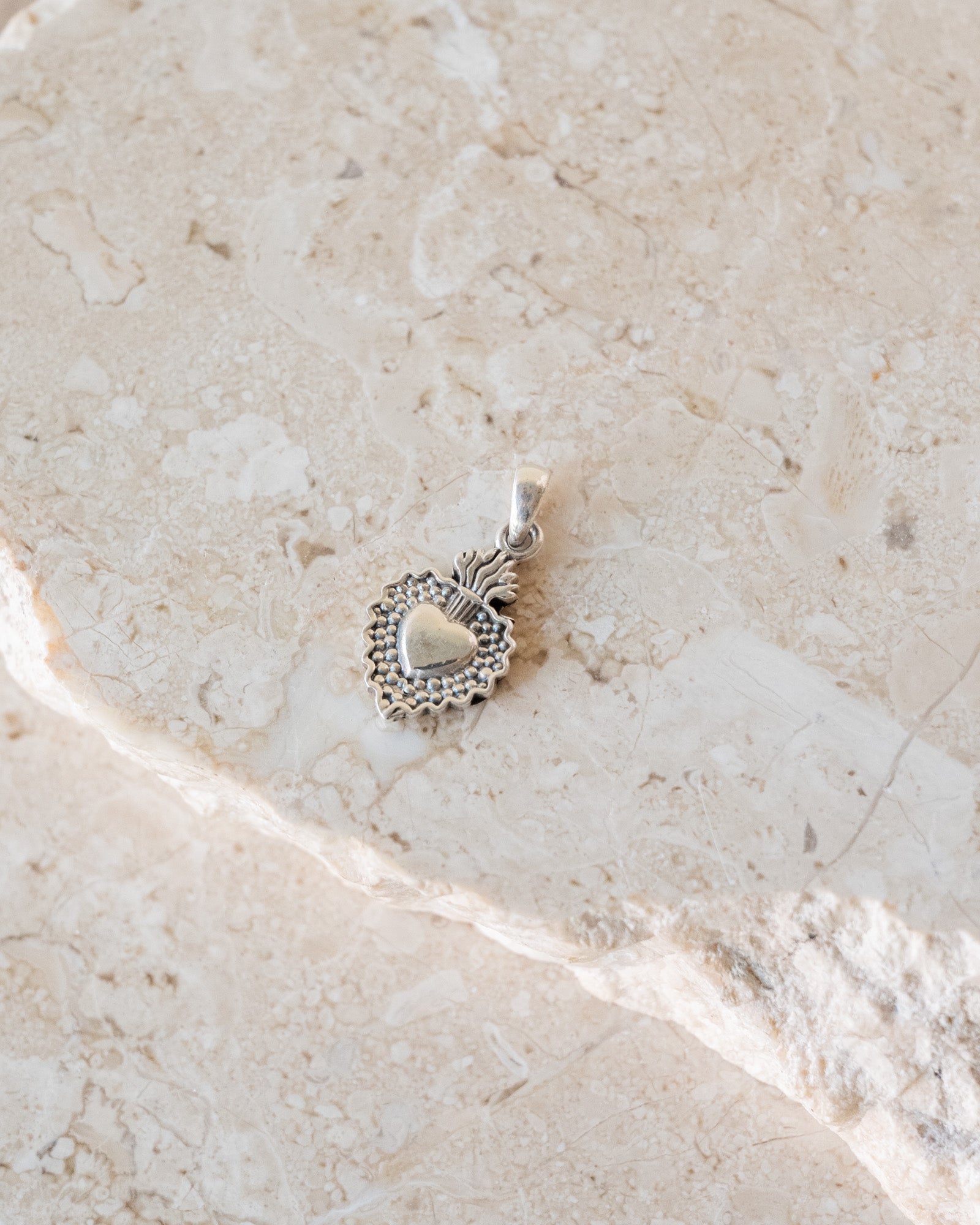 Silberner Halskettenanhänger mit einem brennenden Herzen.
