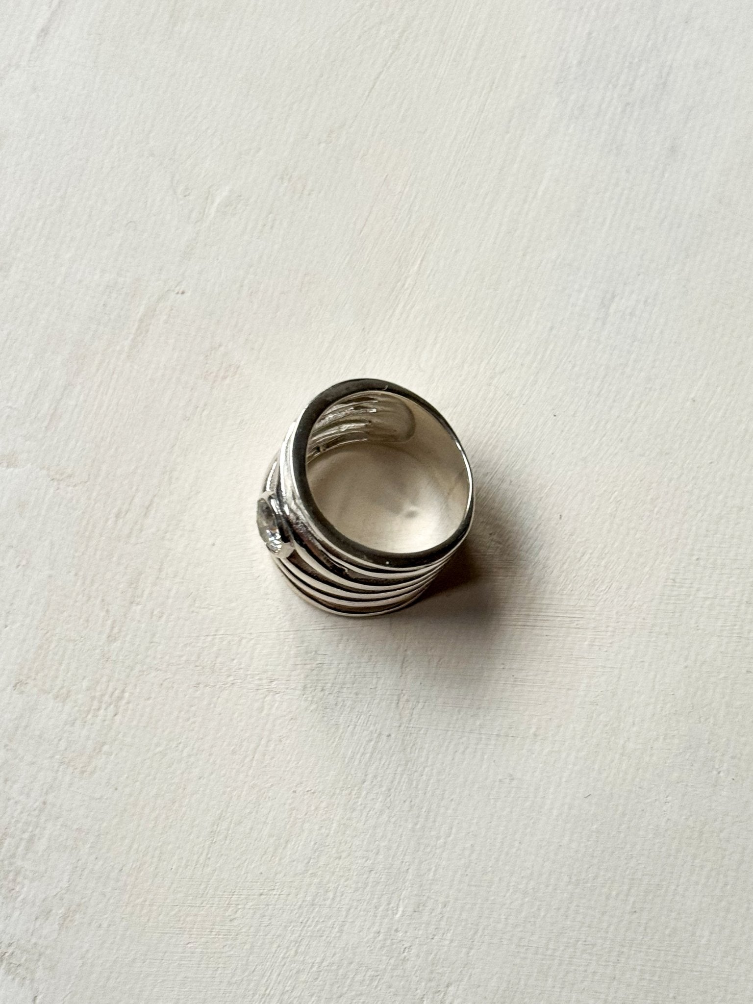 Dieser silberfarbene Ring besticht durch sein mehrlagiges, gewickeltes Design und ist mit einem funkelnden runden Stein verziert.
