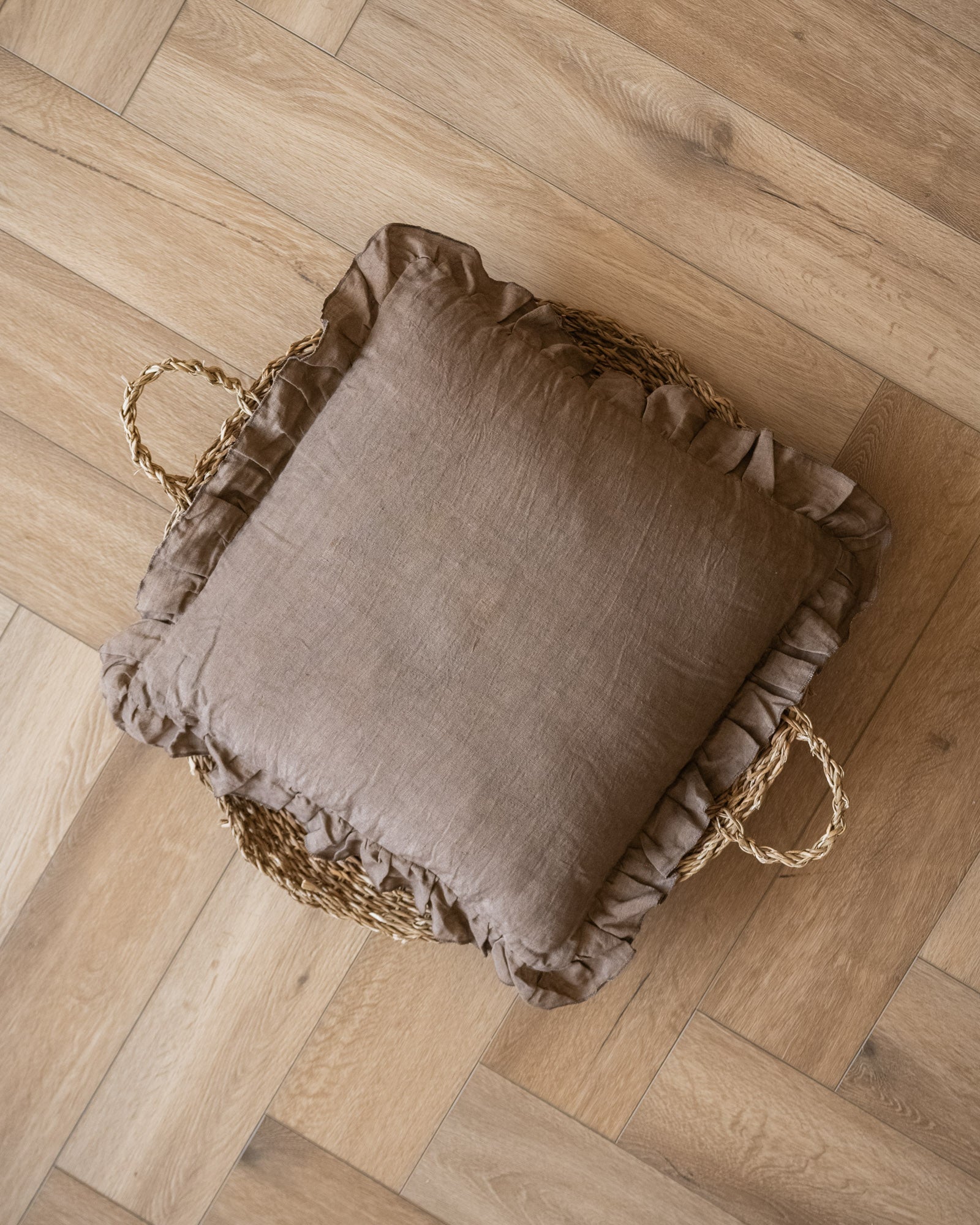 Bring elegance and warmth to your interior with Cushion Cocoa Linen Chocolate Brown. This decorative cushion features a rich chocolate brown color and a playful fringe along the sides. Perfect for combining with other cushions or as a centerpiece, it instantly becomes a stylish focal point in your living room, bedroom, or lounge area.
