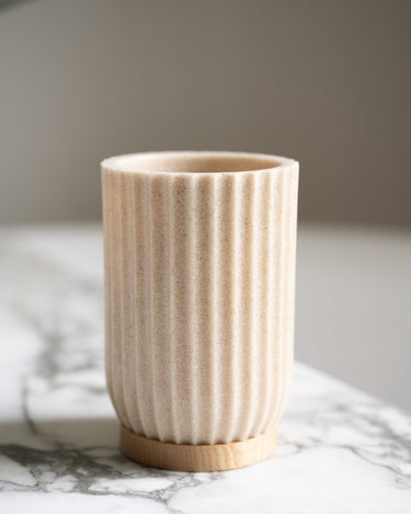 A beautiful toothbrush cup in beige color with gold and wooden details. Perfect to combine with the soap pump.