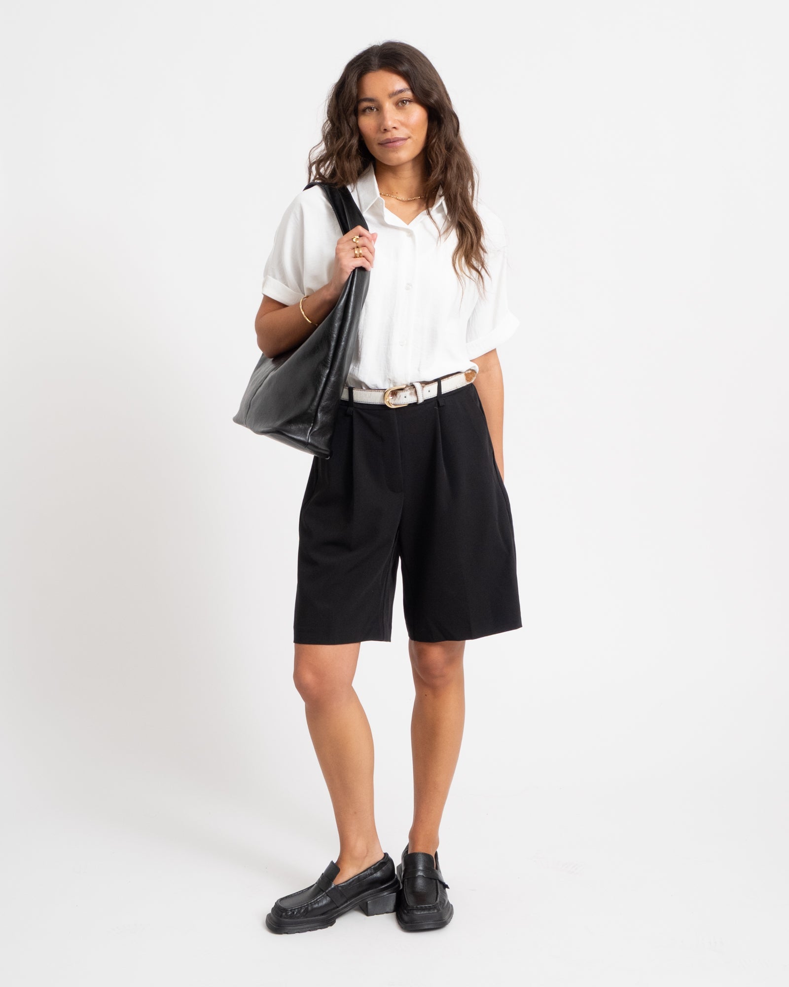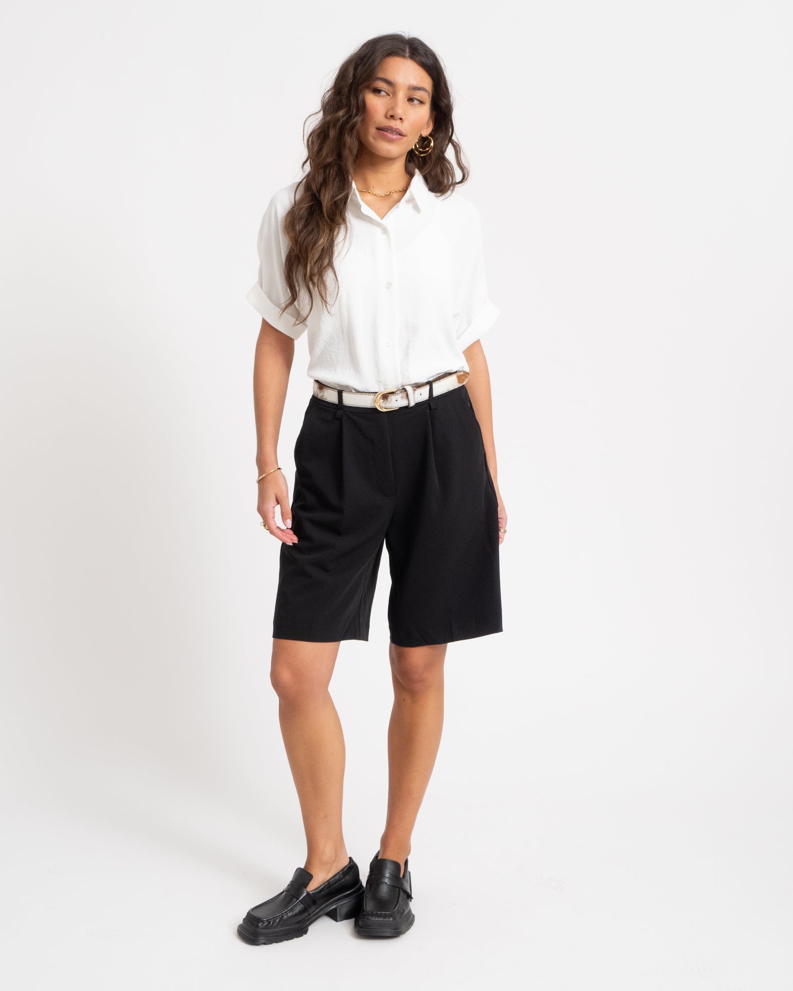 Deze cute bermuda short in zwart is een veelzijdige toevoeging aan je zomergarderobe. De short heeft een knielengte en een comfortabele fit, waardoor hij zowel casual als iets netter te stylen is.