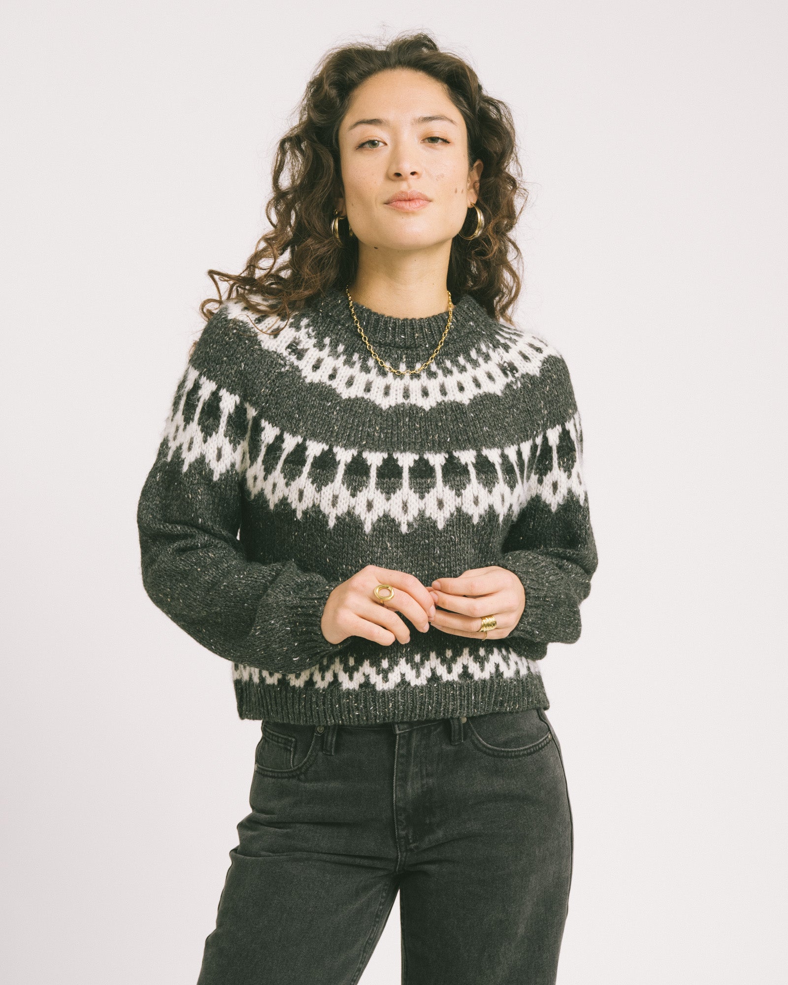 A cozy, cropped knit with a chunky structure and striking pattern.