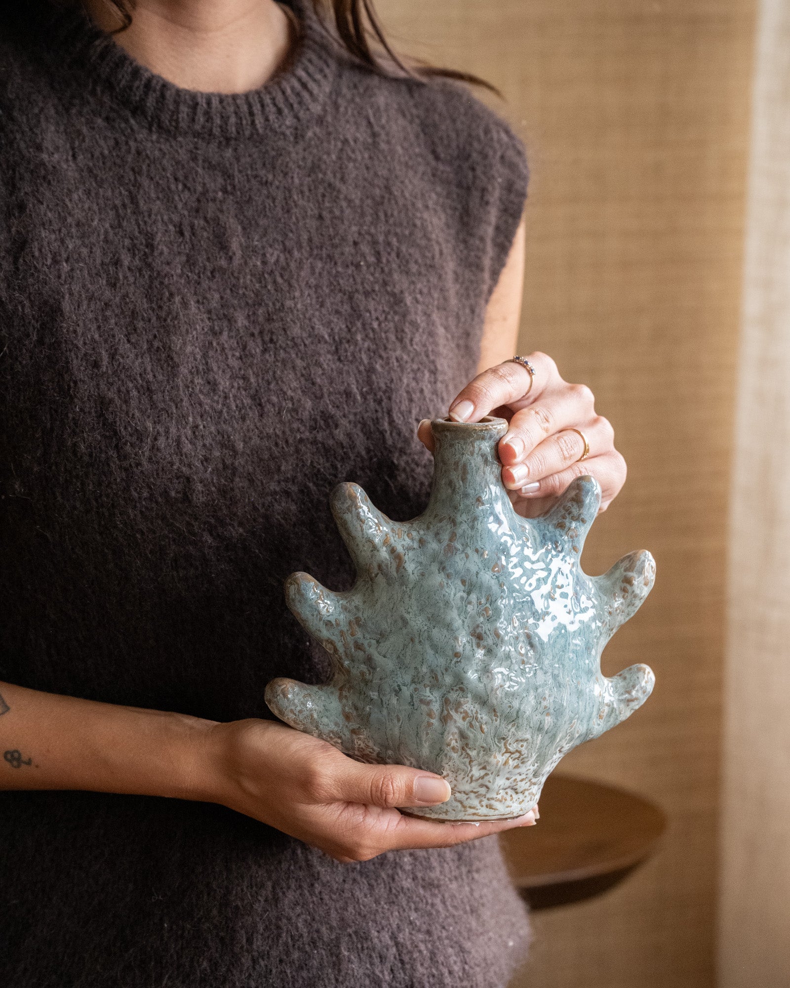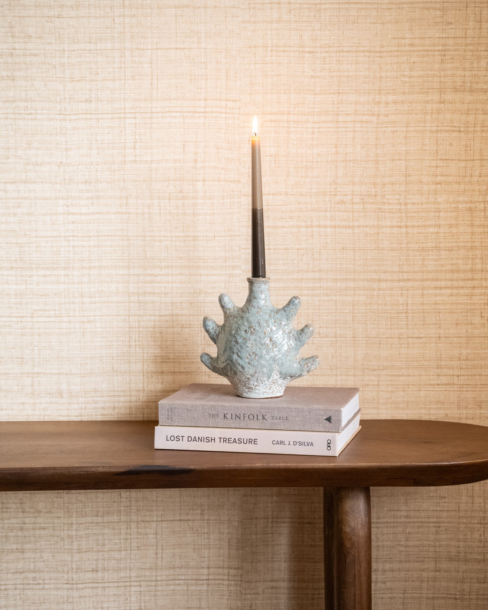 The Bridget candlestick is made of stoneware with a reactive glaze in blue and dark shades. Its curved shape makes it an atmospheric and decorative piece. Pair it with a beautiful candle!