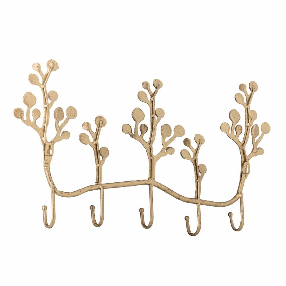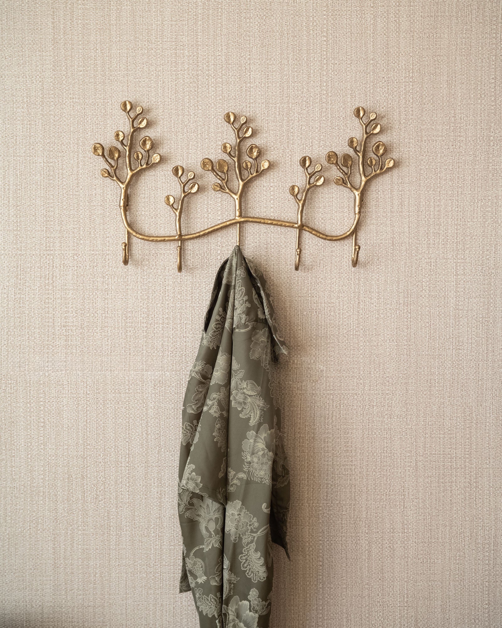 The Padova Brass Coat Rack is a stylish iron wall-mounted coat rack in a warm brass color. Its organic design, inspired by branches, adds a sculptural touch to the wall. Perfect for hanging coats, scarves, bags, or jewelry in the hallway, bedroom, or dressing room.