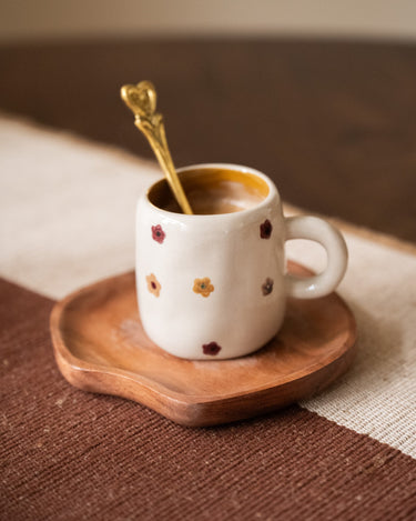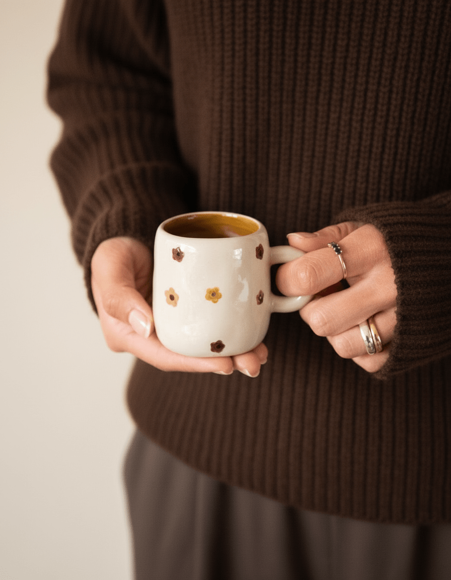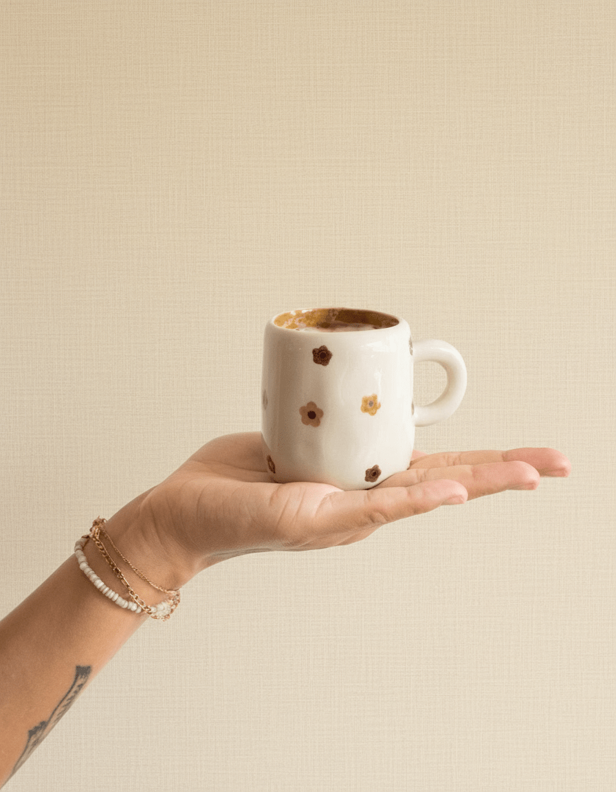 The TILTIL Small Mug Addy Flowers is a sweet, small mug with a playful shape and colorful flowers in warm hues. Perfect for an espresso, doppio, or babyccino. Small, charming, and full of character!