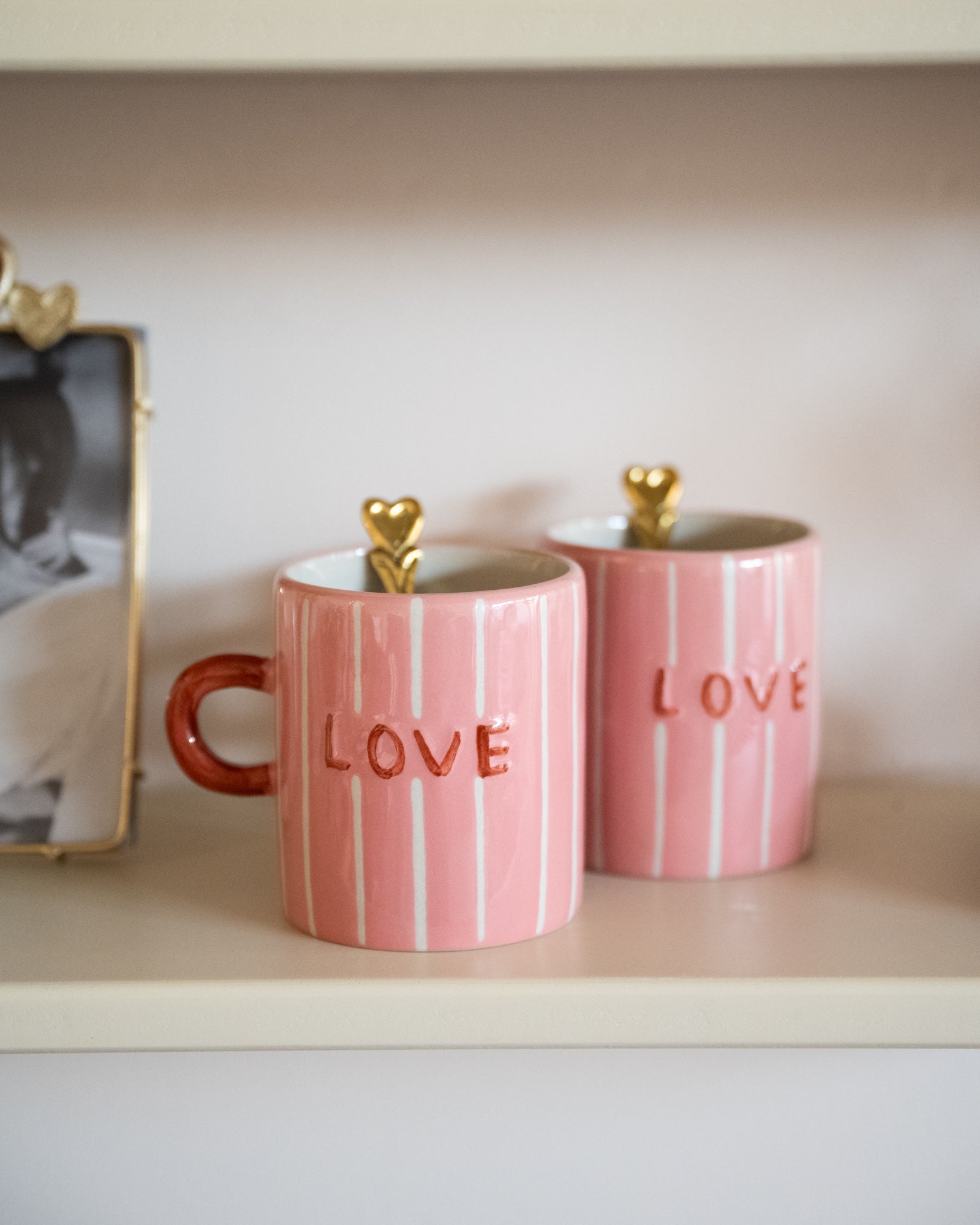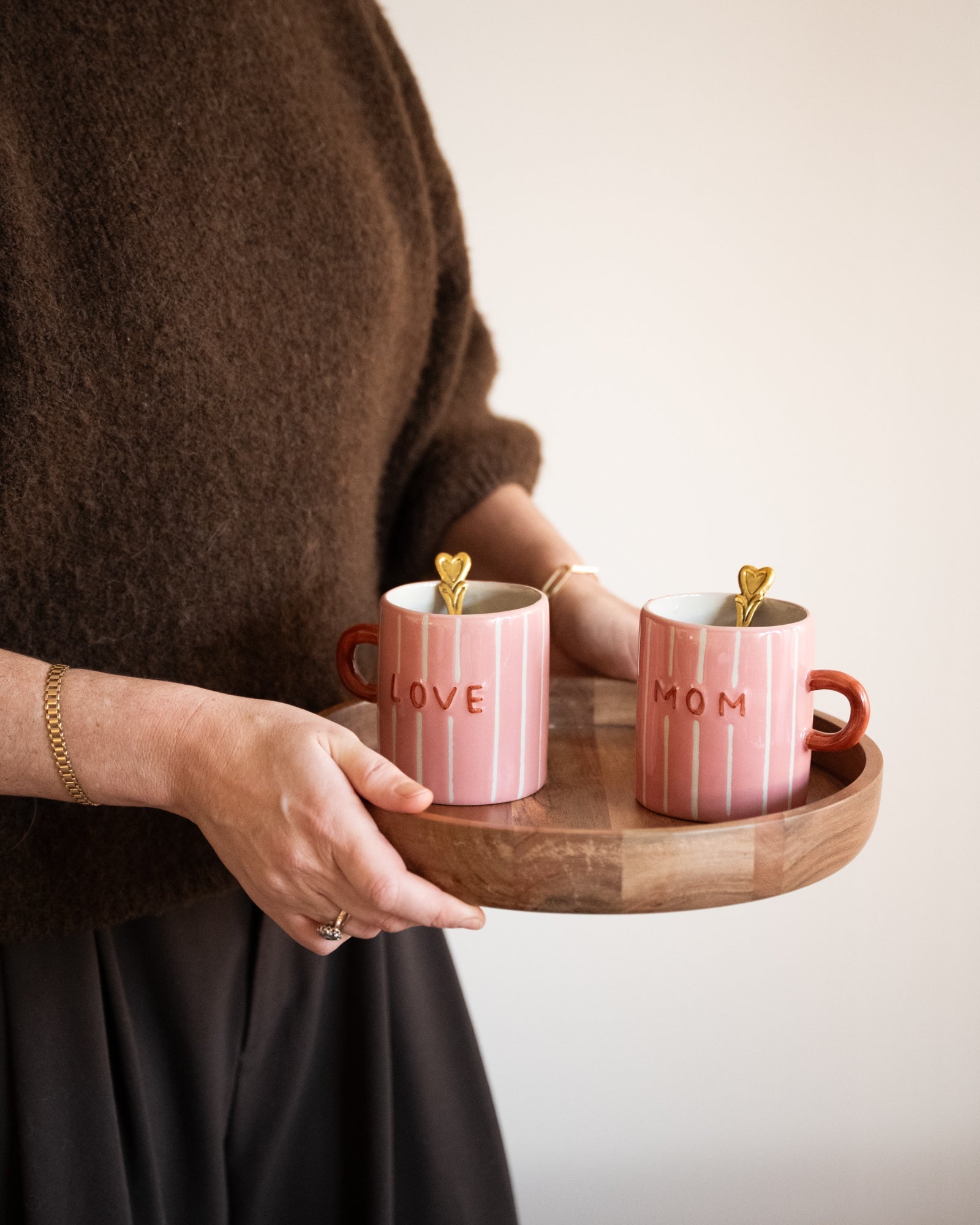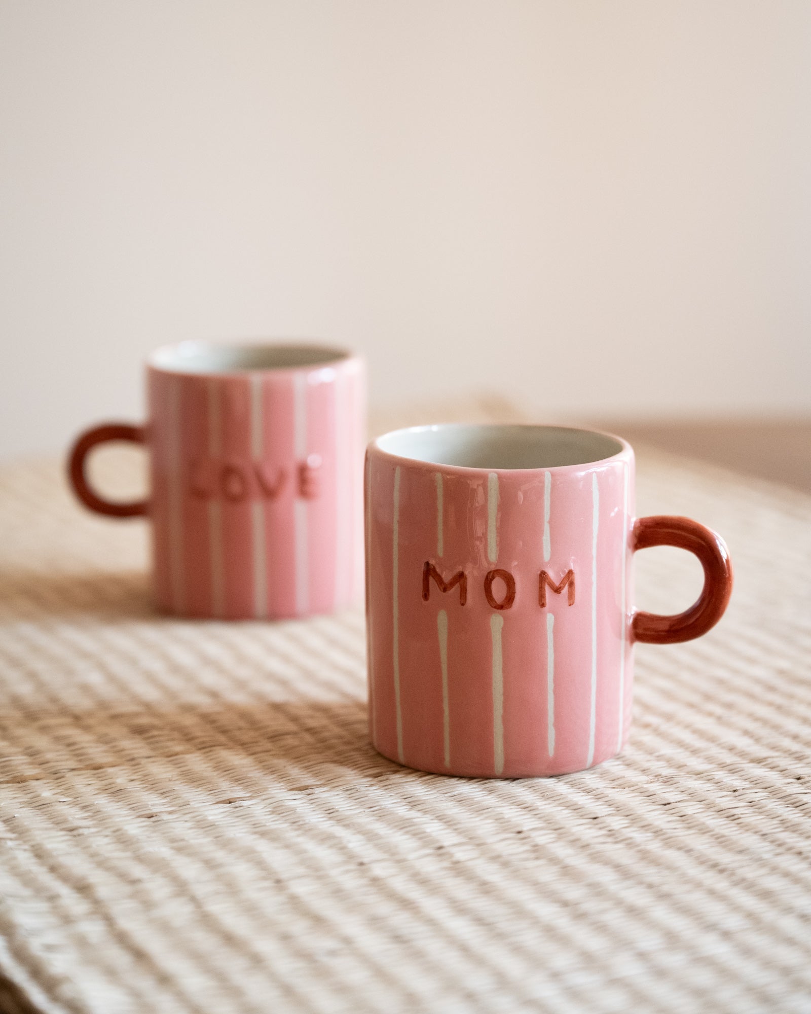 Bloomingville β Hand-painted Mug Cherish Mom is a loving stoneware mug in a soft pink with cream stripes and the text "MOM" on one side and "LOVE" on the other. Its warm look and playful design make this mug perfect for a special coffee moment or as a sweet gift. βπ
