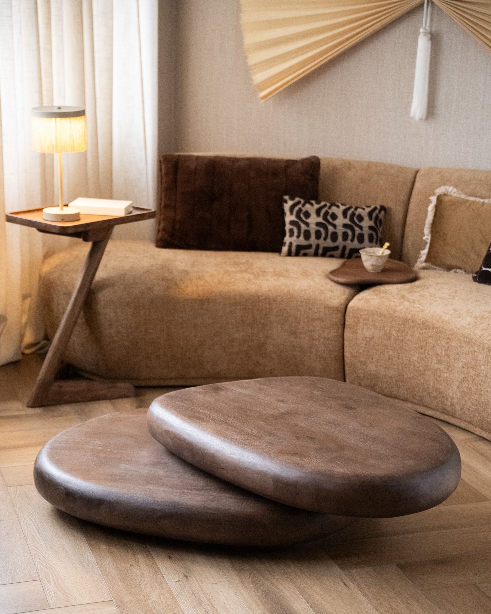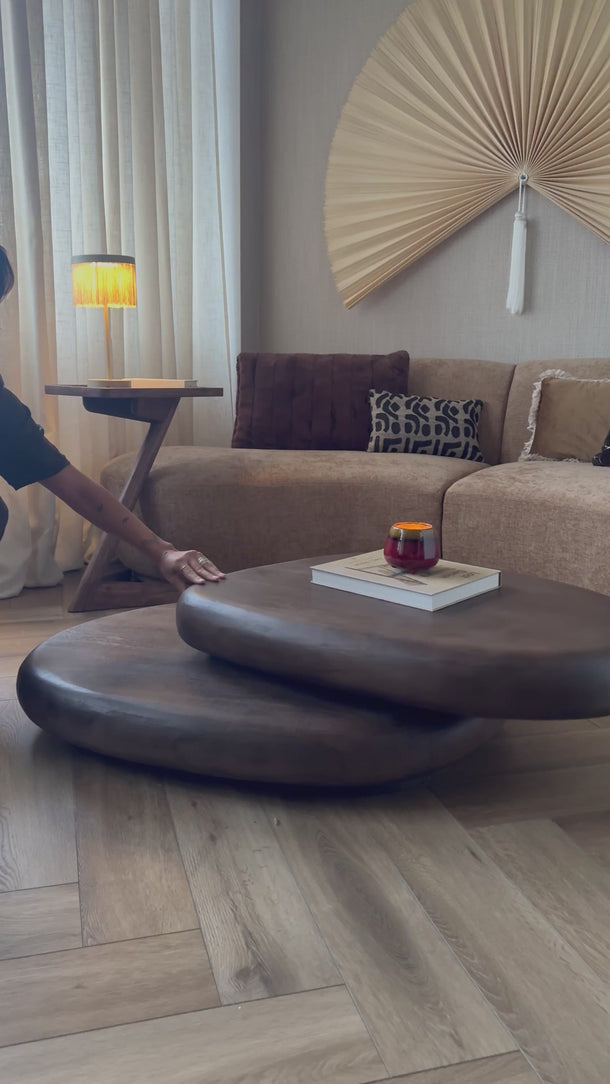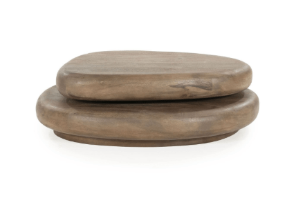 Coffee Table Nia This isn't your average table. Made of mango wood and incredibly practical: the top rotates 360 degrees! So you can easily slide it towards you for snacks, drinks, or your laptop. Organic shapes, warm wood, and a clever twist.