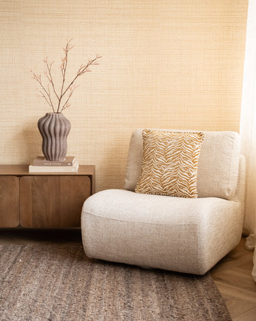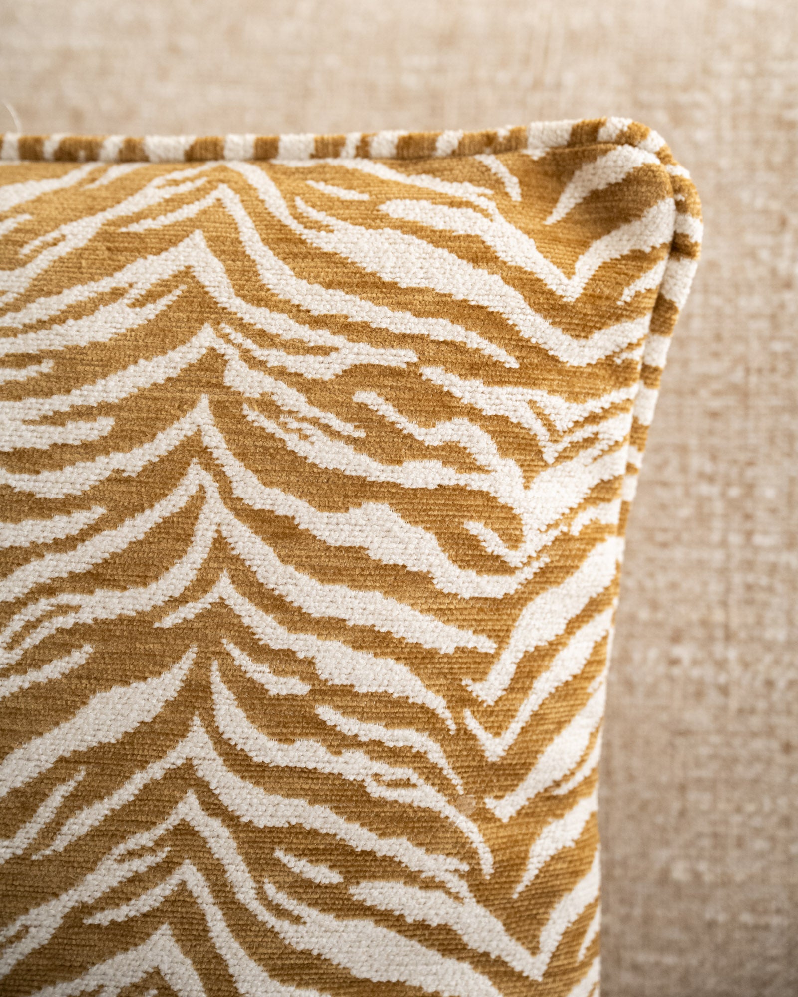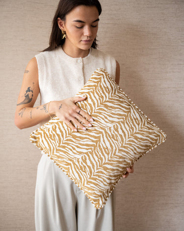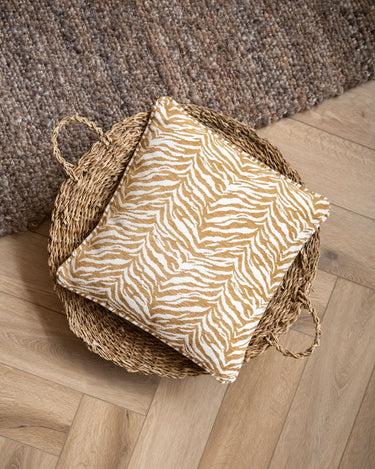 Cushion Tigra Ochre 45x45 combineert een grafisch tijgerdessin met een warme okergele kleur voor een stijlvol statement in huis. Dit sierkussen combineert moeiteloos met rustige basics en andere structuren voor een gelaagde, cosy look op je bank of fauteuil. Perfect om je zithoek nét dat beetje extra karakter te geven.
