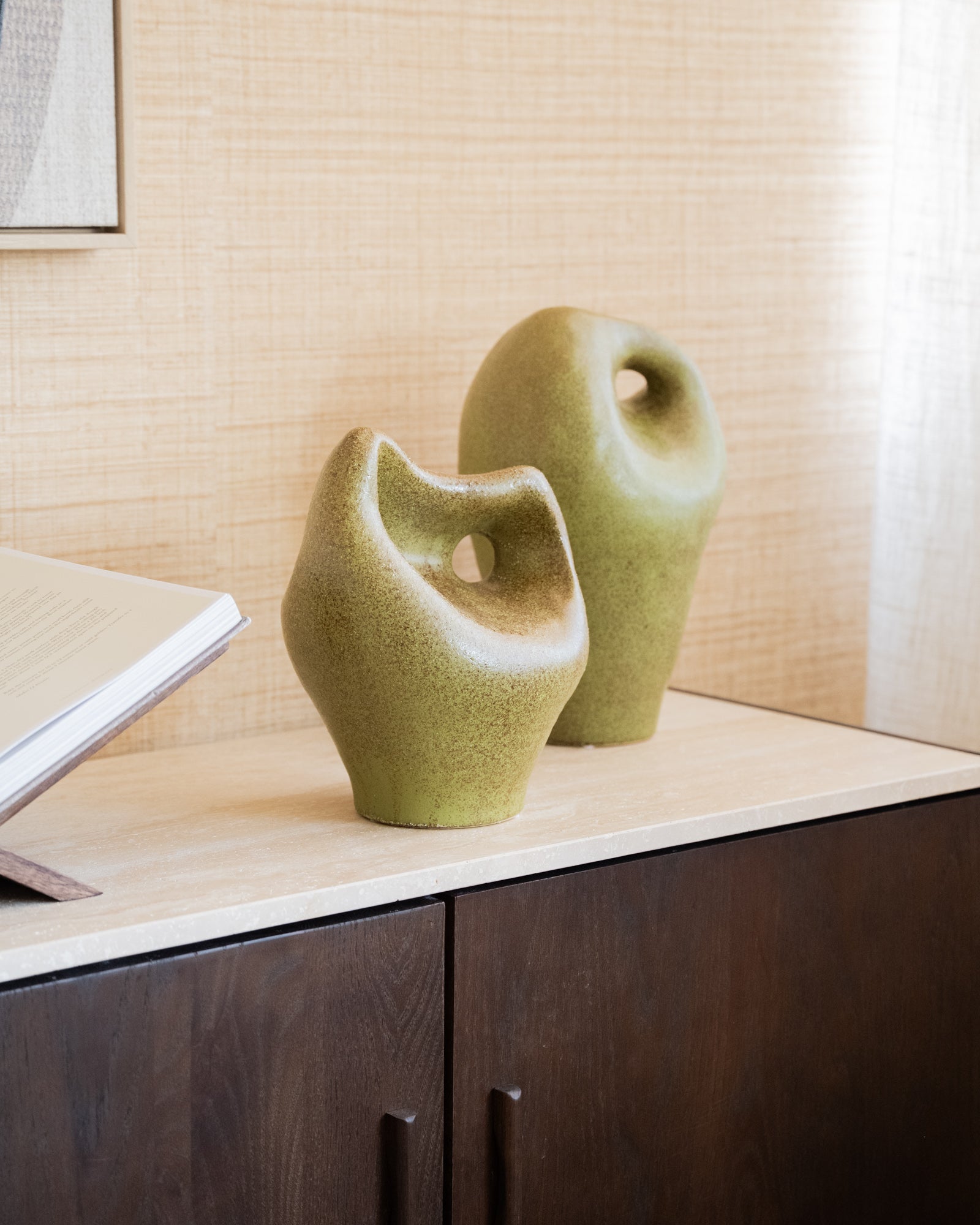 This earthenware decorative piece with a sand glaze in a trendy matcha green shade instantly adds character to your interior. Available in two versions, you can combine them or style them separately as a subtle eye-catcher.