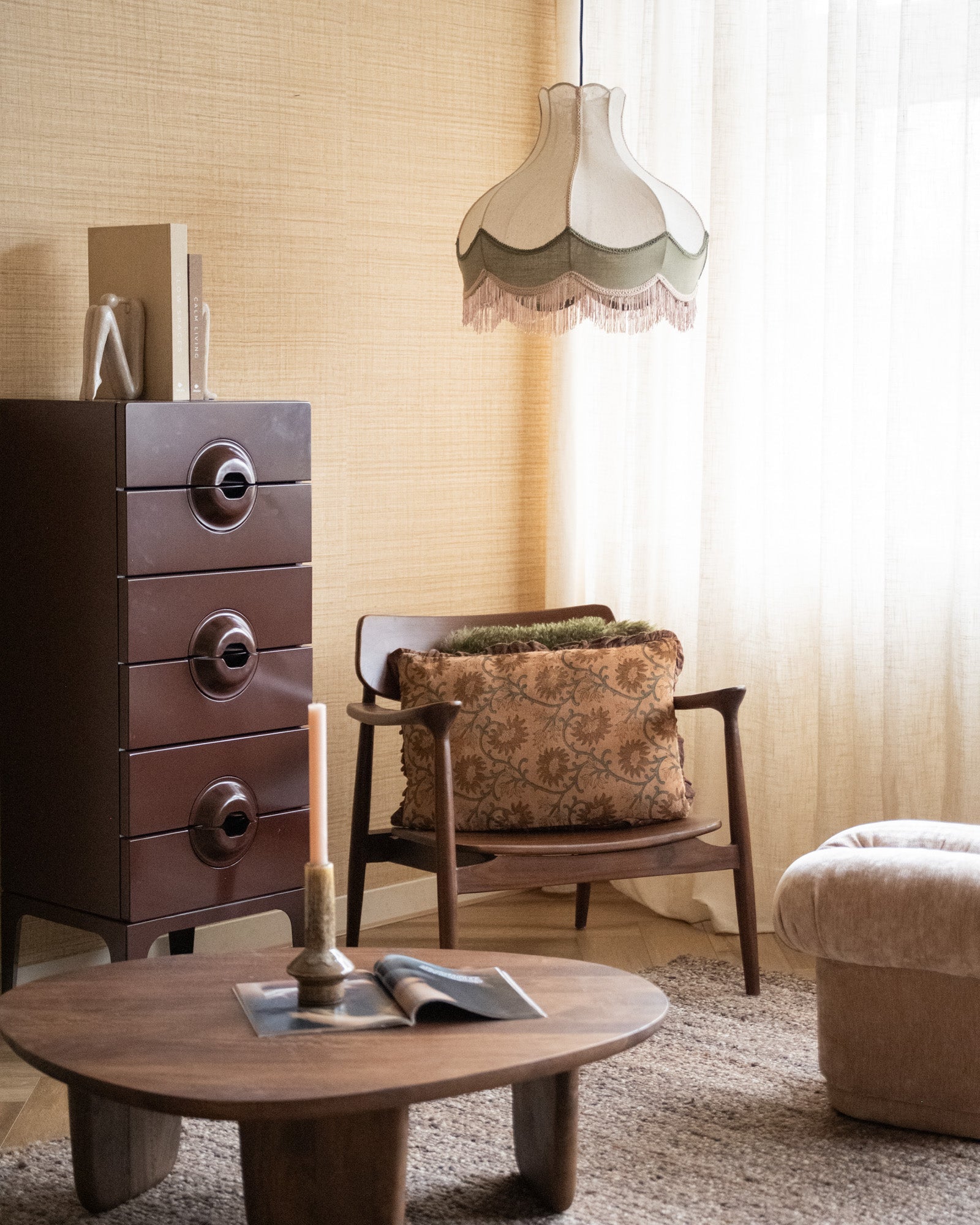 The Fringaloo Green Pendant Lamp instantly creates a cozy atmosphere in your home with its soft green hue, fabric shade, and playful fringes. The vintage-inspired design provides warm, diffused light above the dining table, in the hallway, or bedroom. A real eye-catcher for a cozy and characterful interior.