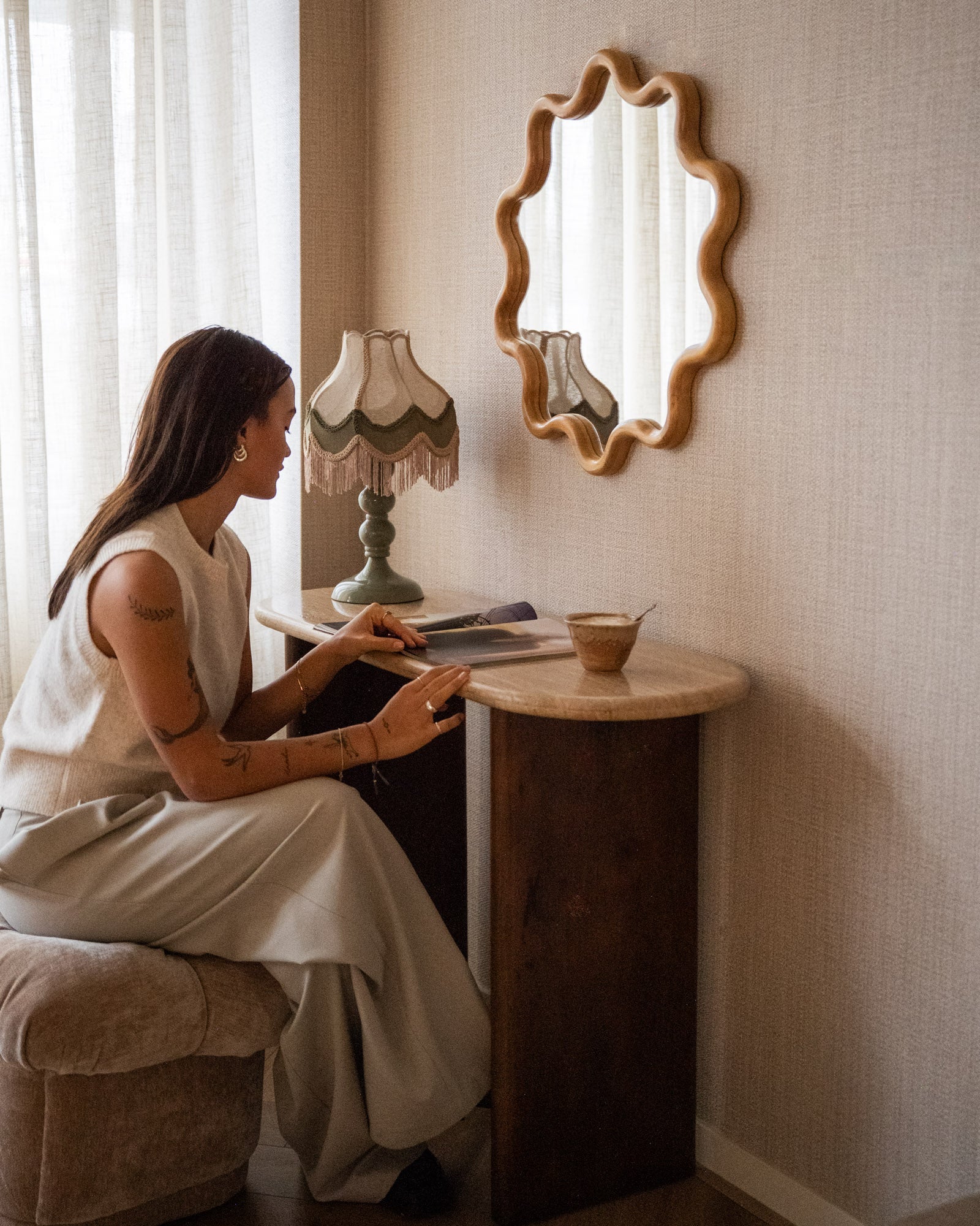 The Fringaloo Green Table Lamp instantly brings ambiance to your home with its vintage look and playful fringes. The green base combined with the fabric shade creates warm, diffused light and a cozy, characterful look. Perfect as a table lamp on a dresser, bedside table, or open shelf for a soft and stylish accent.
