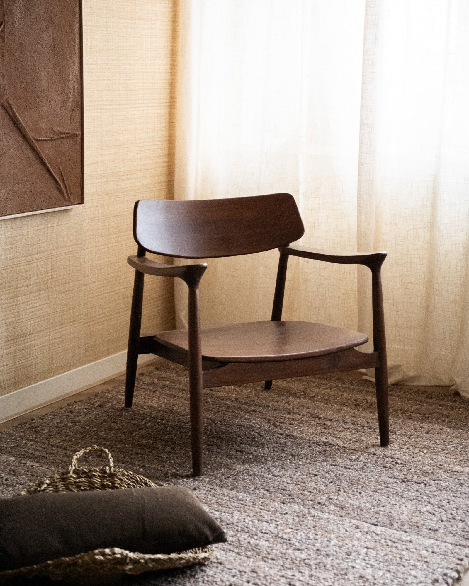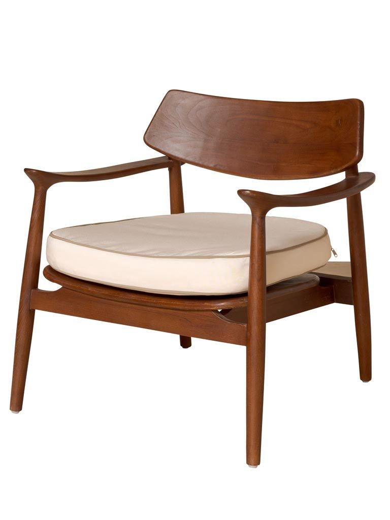 The Mocha Caicos armchair is a stylish teak lounge chair, finished in a warm mocha shade with a cream cushion. Its organic silhouette and soft curves give this armchair that perfect Japandi look: minimalist, warm, and comforting.