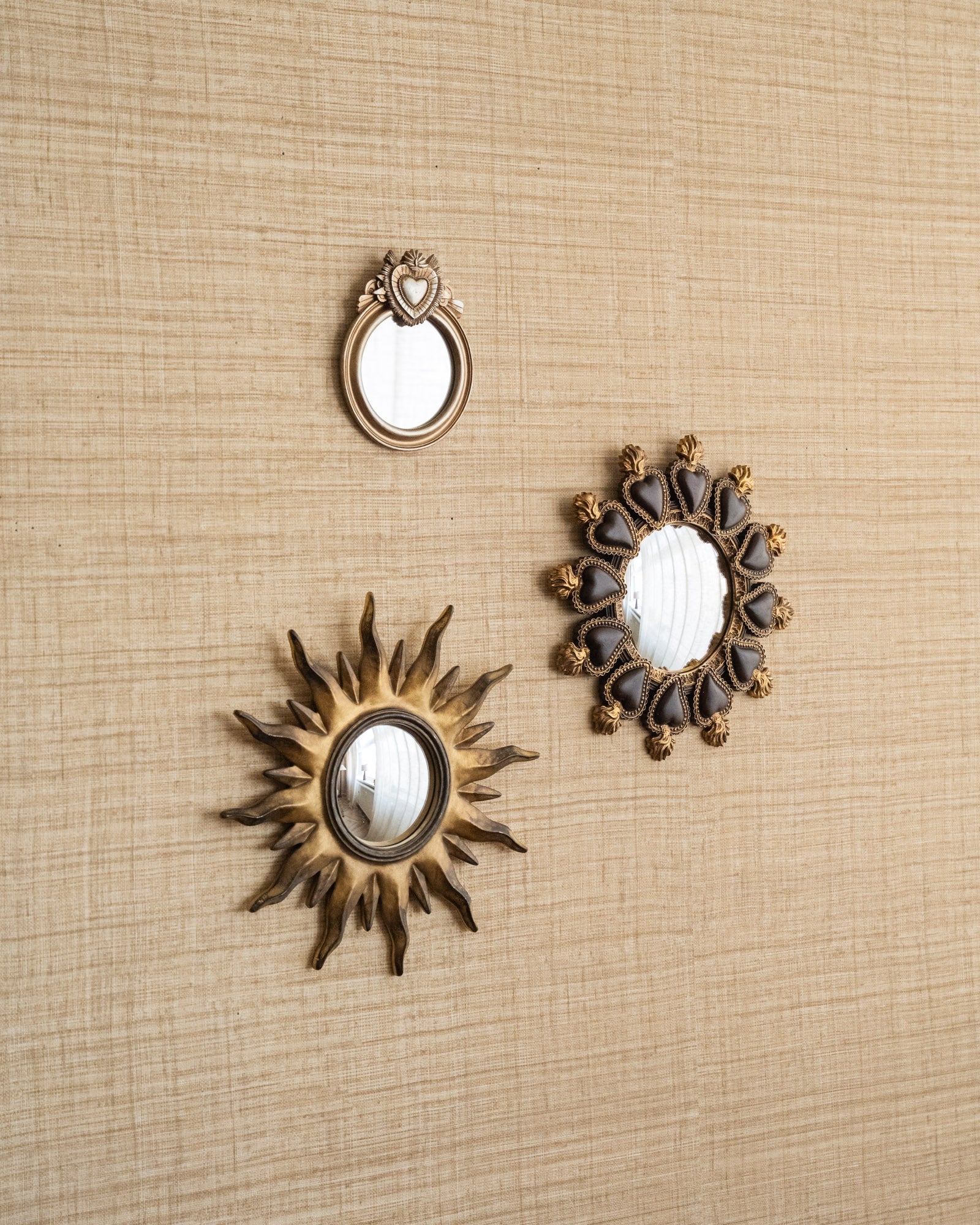 The Mirror Devotio Hearts Brown is a unique wall mirror with a decorative design of small hearts around the mirror. The warm brown and gold tones give it a charming, vintage look. Perfect as a stylish detail on your wall, for example, in the hallway, bedroom, or as part of a playful mirrored wall.