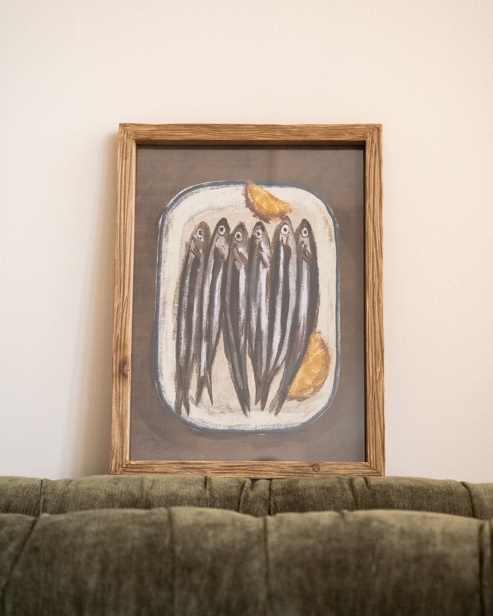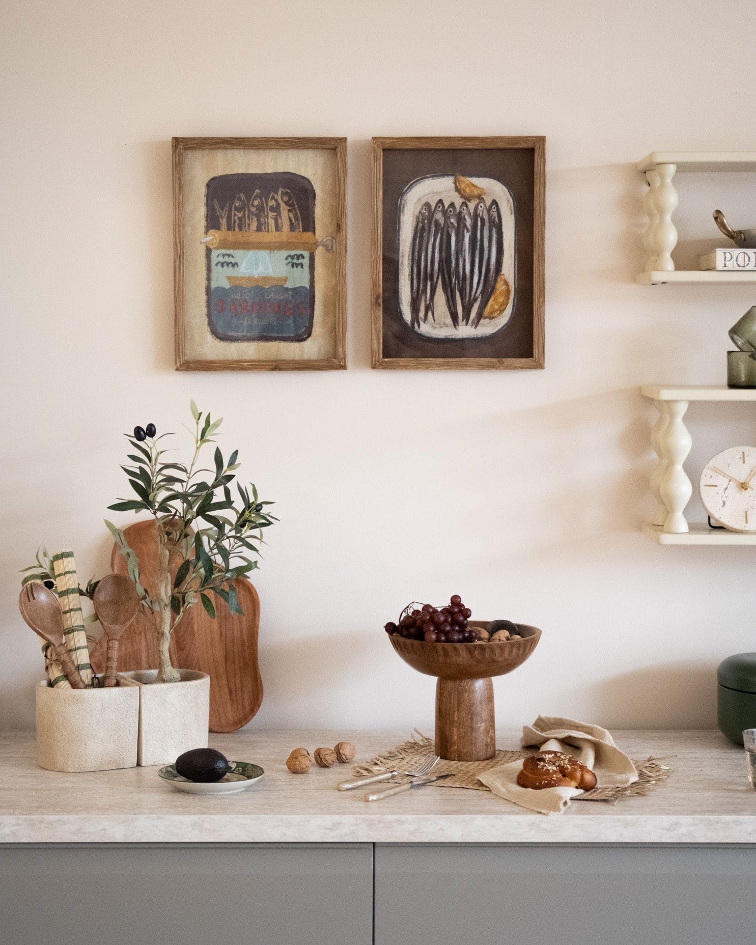 Wall Art Sardines brings a playful, Mediterranean vibe to your interior. The sardine illustrations and warm earth tones give this wall art an artistic, cozy feel. Perfect for the kitchen, dining room, or as a subtle statement piece. Available in two versions, they're especially fun to combine for a stylish and unique duo.