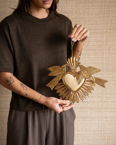 The Wall Deco Heart Birds is a real eye-catcher that brings love and light to your interior. With its golden hue, radiant heart shape, and graceful birds, this wall decoration has a unique, almost vintage look. Hang it solo on the wall or combine it with other wall objects for a playful effect. Perfect for anyone who appreciates unique details and a touch of bohemian charm in their home.