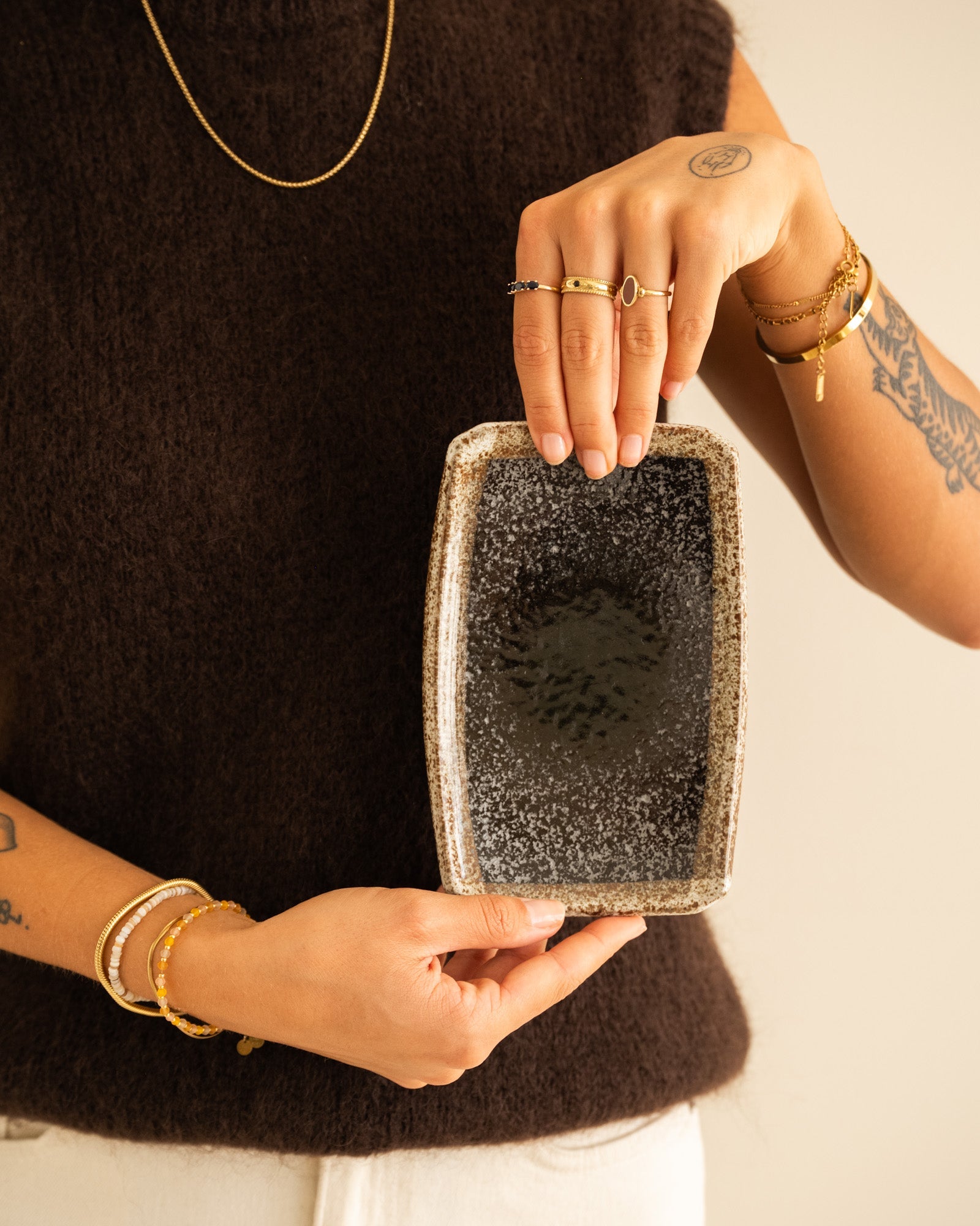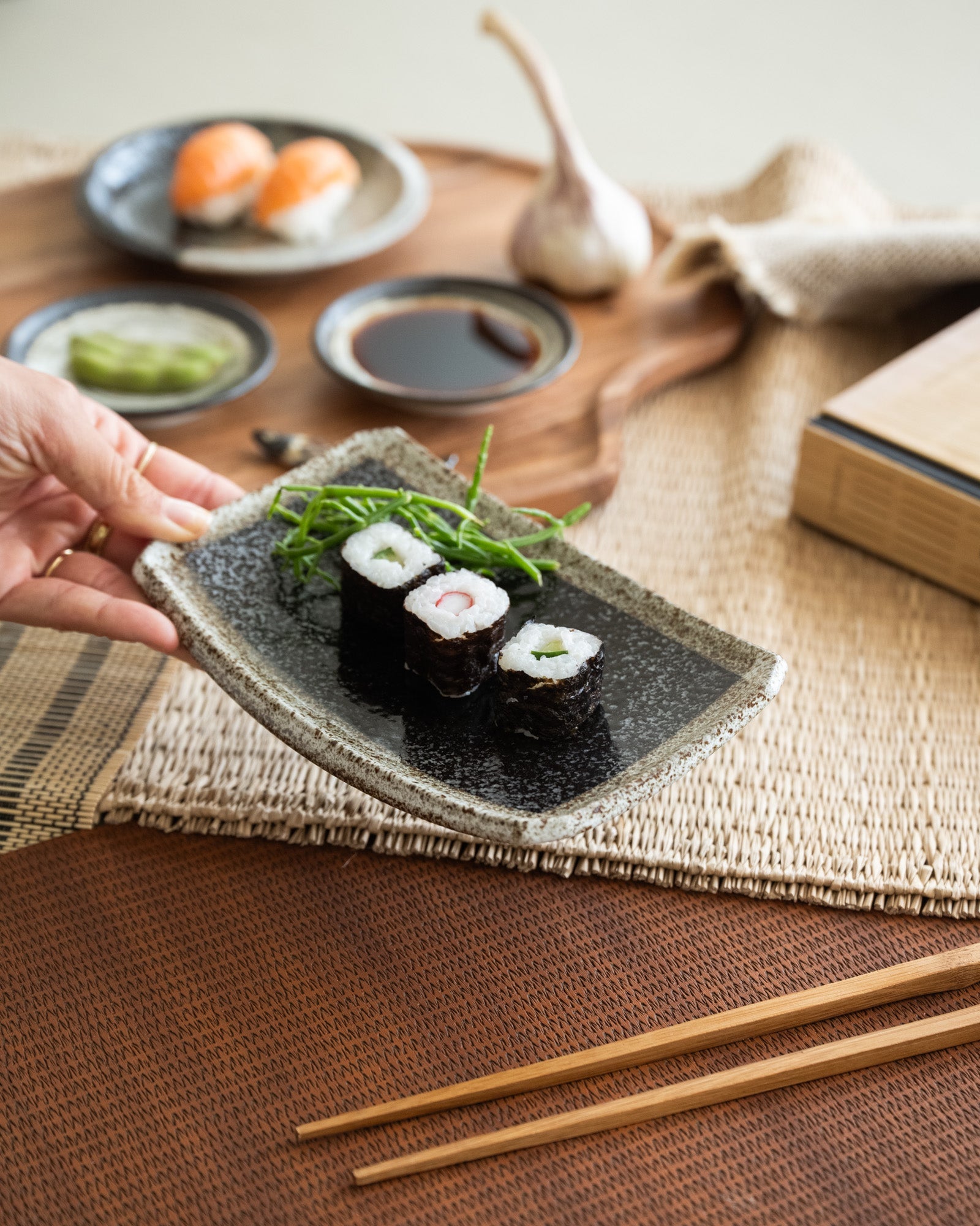 An elegant, handmade plate with a subtly curved shape. Perfect for serving sushi, sashimi, appetizers, or small desserts. The deep sheen of the glaze and the earthy rim give the plate a refined, artisanal look.