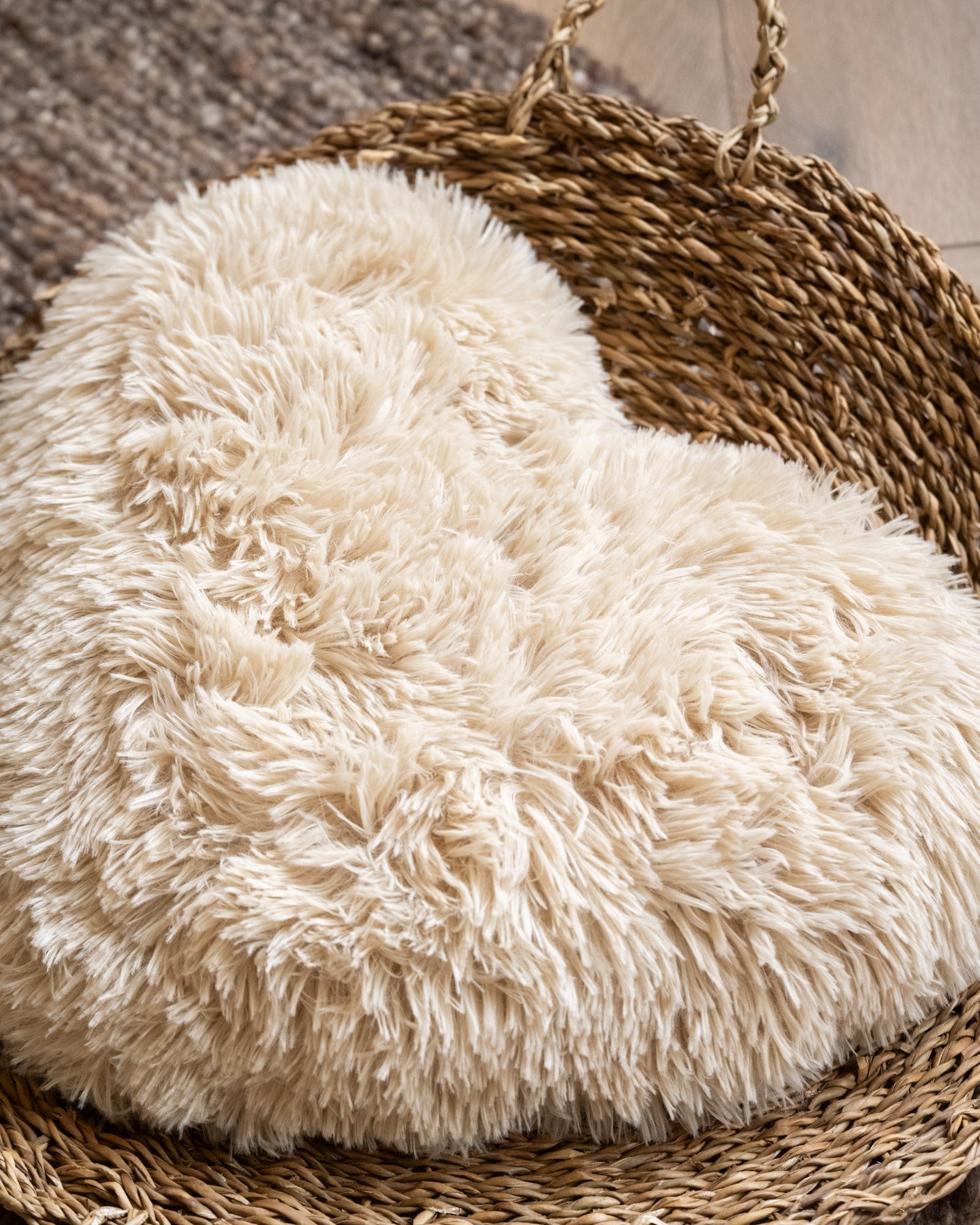 Cushion Heart Furry Beige is a wonderfully soft, heart-shaped cushion that instantly adds warmth and coziness to your interior. The fluffy texture and neutral beige color make this decorative cushion perfect for your sofa, bed, or armchair. A playful eye-catcher that effortlessly complements both modern and cozy interiors.