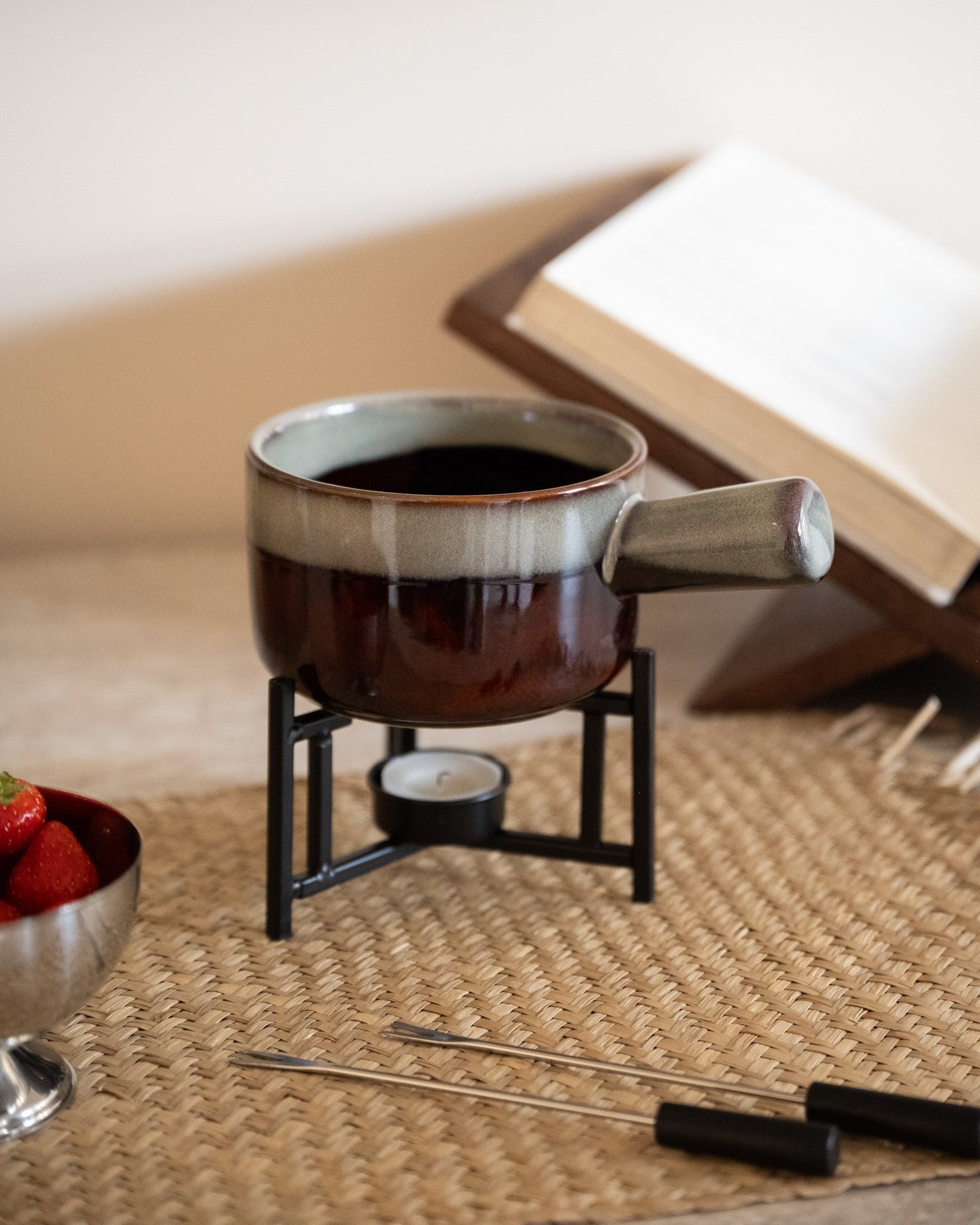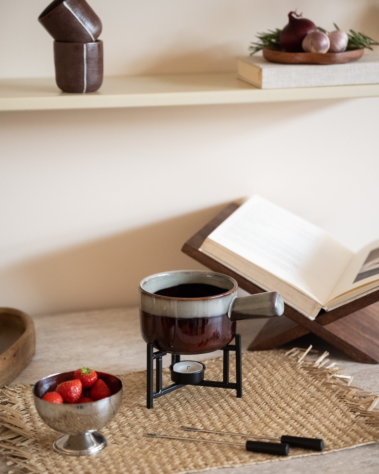 Make your drinks or dinner extra cozy with this ceramic fondue pot. Melt delicious cheese or chocolate in the pot and enjoy a delicious fondue together. Thanks to the practical handle, the pot is easy to move, and its warm, natural look makes it a perfect fit for any interior.