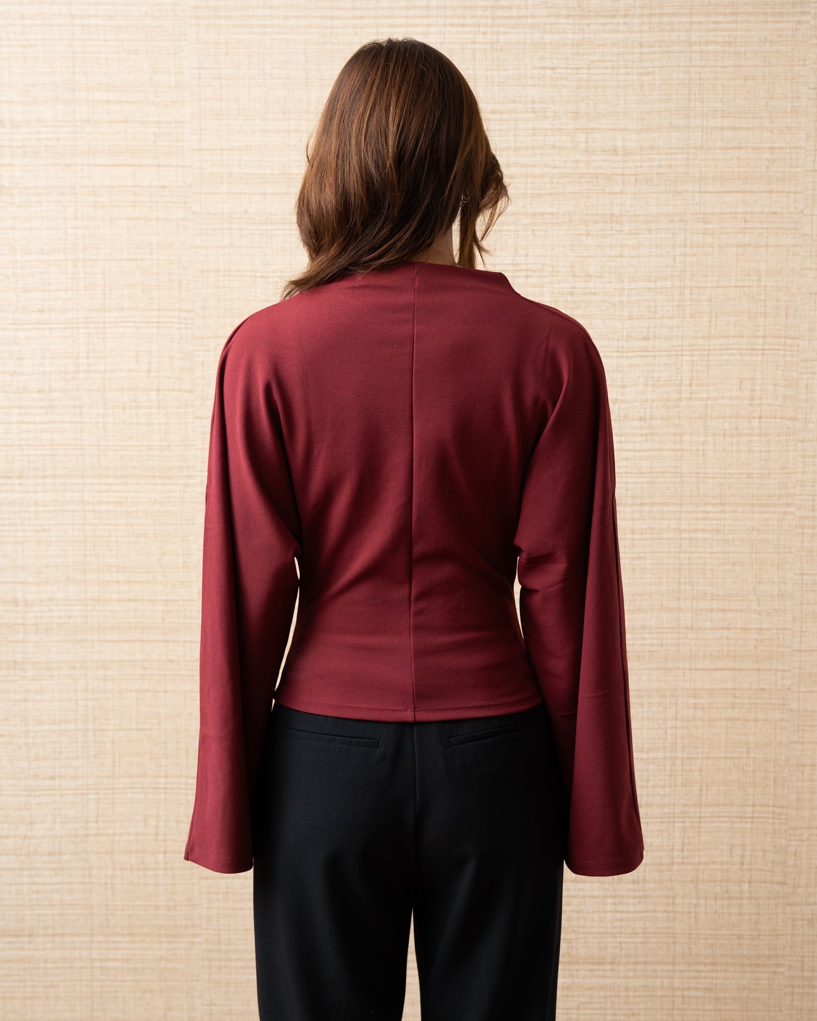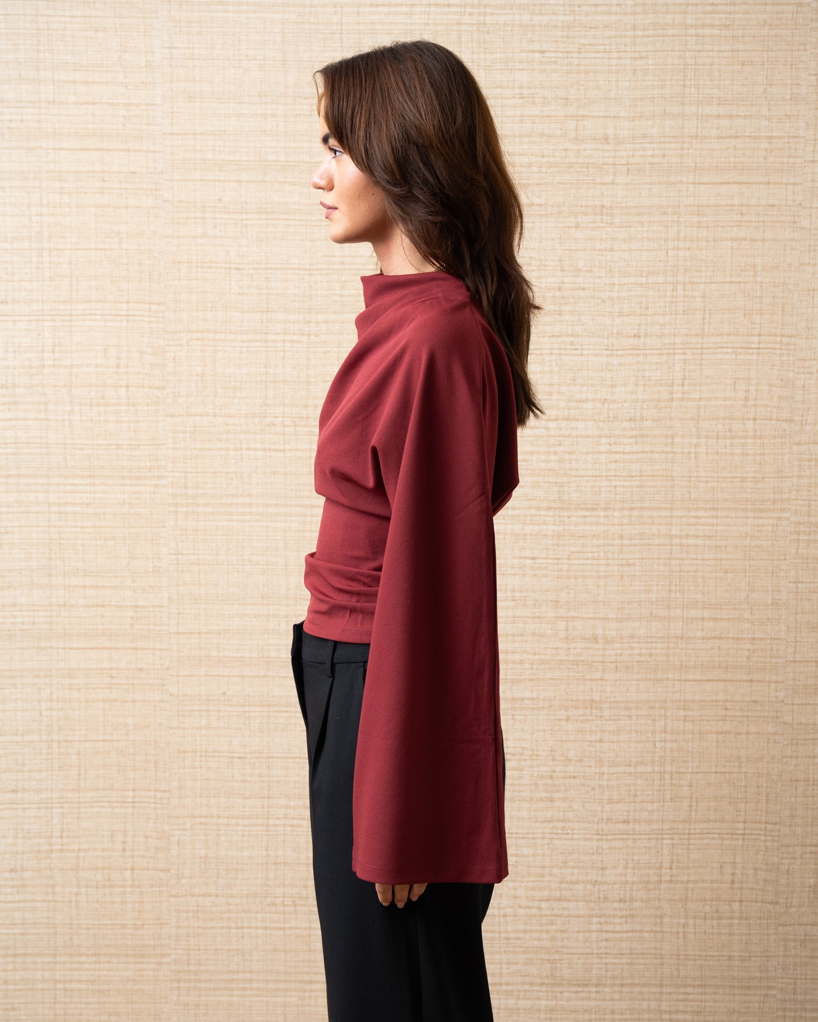 This top exudes elegance and modernity. The deep burgundy color creates a warm, luxurious look, while the light pleats create a playful effect. The wide sleeves create an airy silhouette, contrasting with the fitted waist that beautifully accentuates the shape. Perfect with formal trousers or a skirt for a chic, contemporary look. Also available in black.