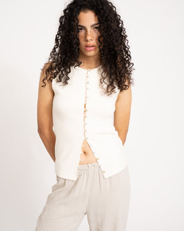 Made from a comfy knit, it's sleeveless and has a slightly longer fit that gives it just that casual feel. The small buttons at the front make it subtle and refined. Our tip: leave a few bottom buttons undone for a playful slit.