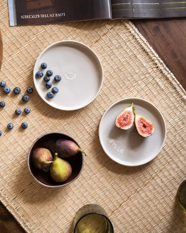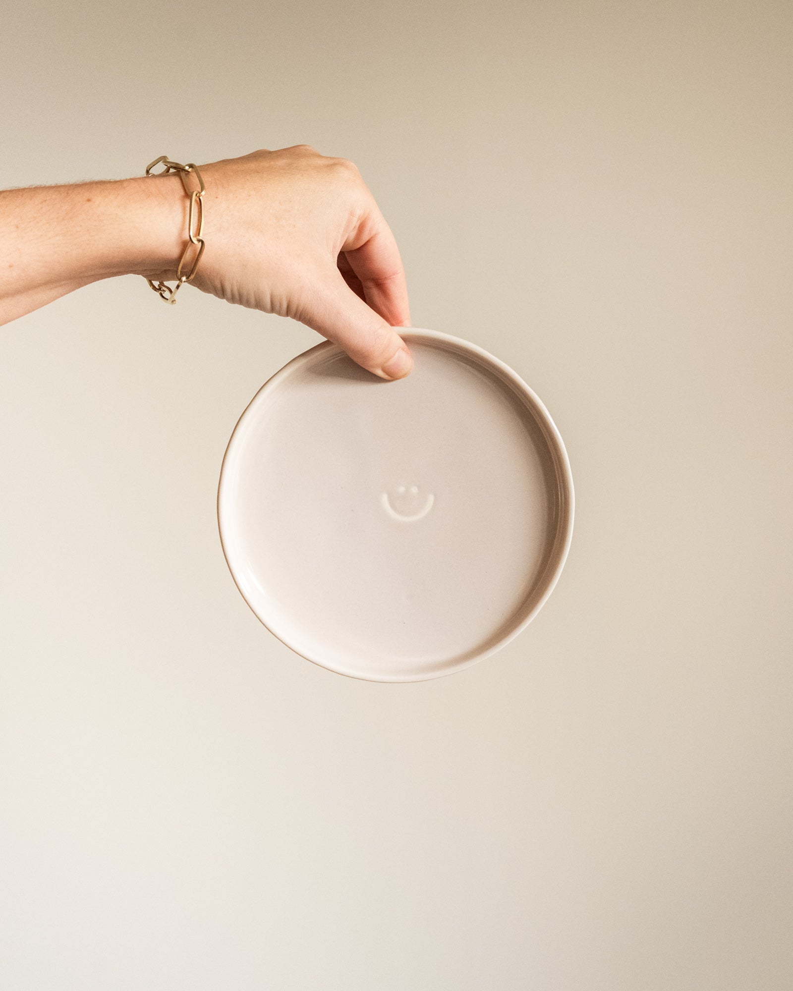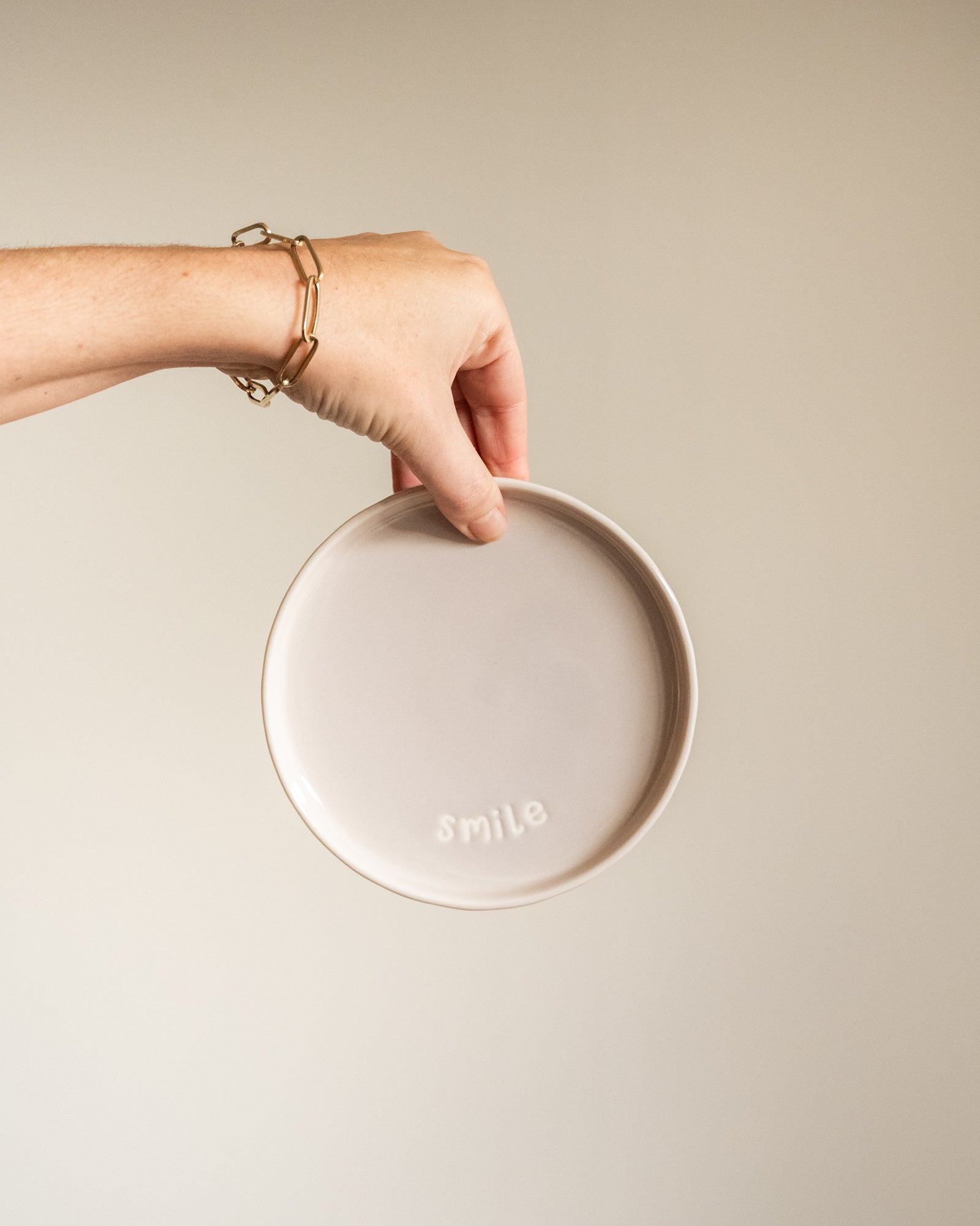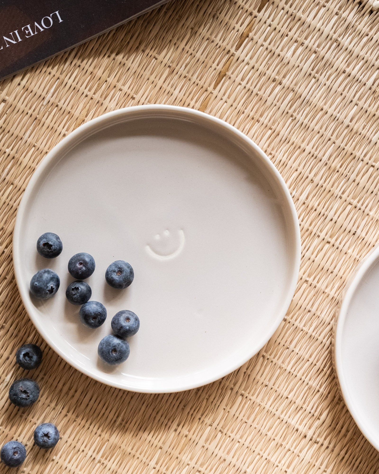 This set of two plates will instantly bring a smile to your table. One plate features a subtle smiley face design, the other the word "smile." Perfect for breakfast, cake, or small snacks.