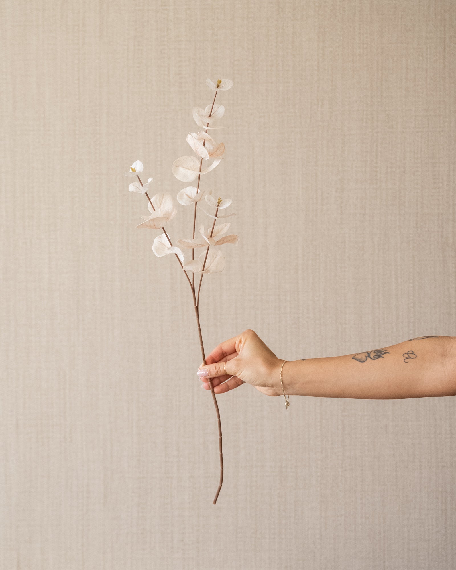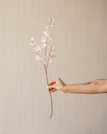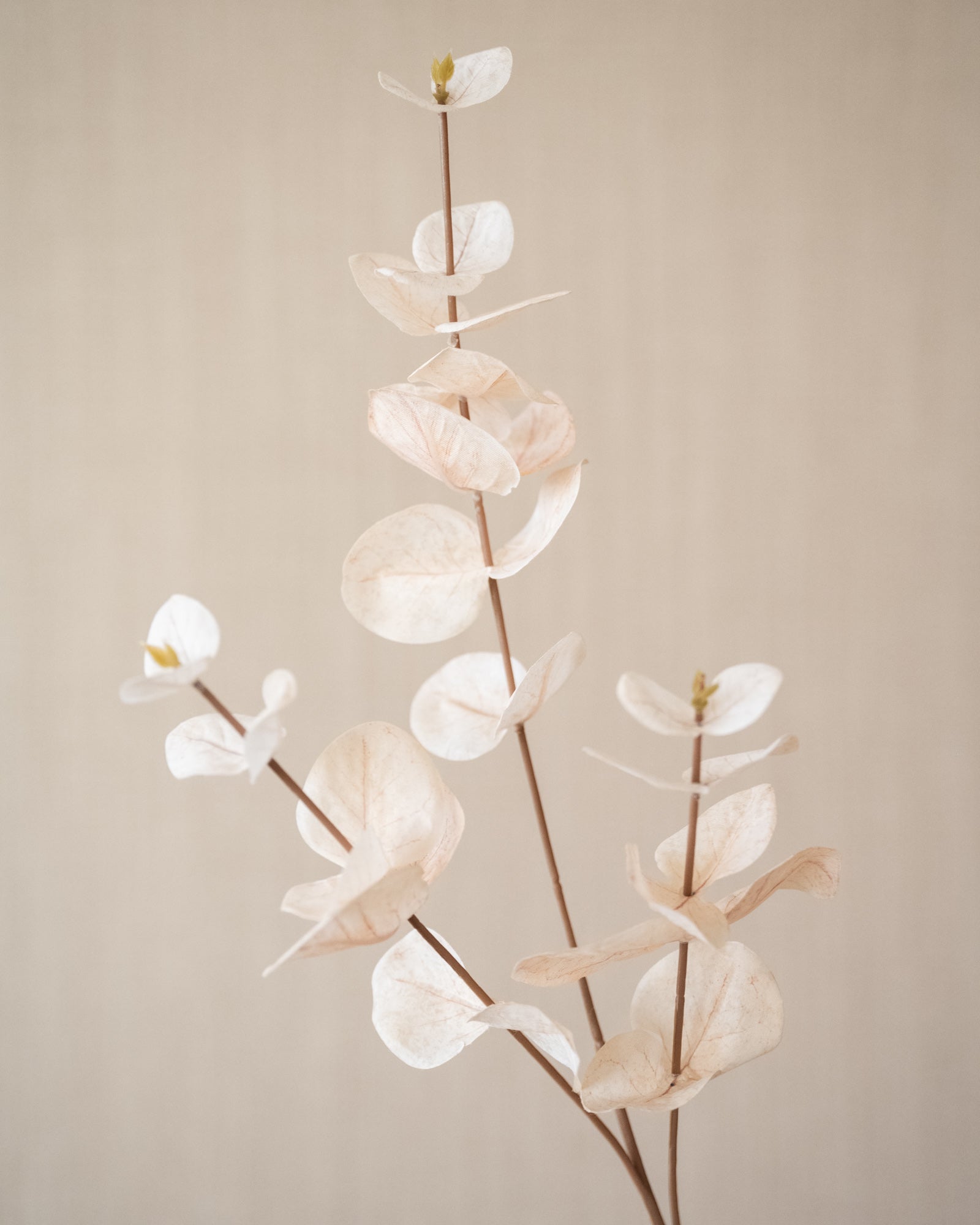 Faux Flower Eucalyptus Beige brings peace and softness to your interior with its light beige hue and delicate eucalyptus leaves. Its lifelike appearance makes this artificial branch perfect for a vase on a table, an open shelving unit, or as a subtle accent in a warm, neutral interior. It looks beautiful on its own, but also pairs beautifully with other faux flowers.