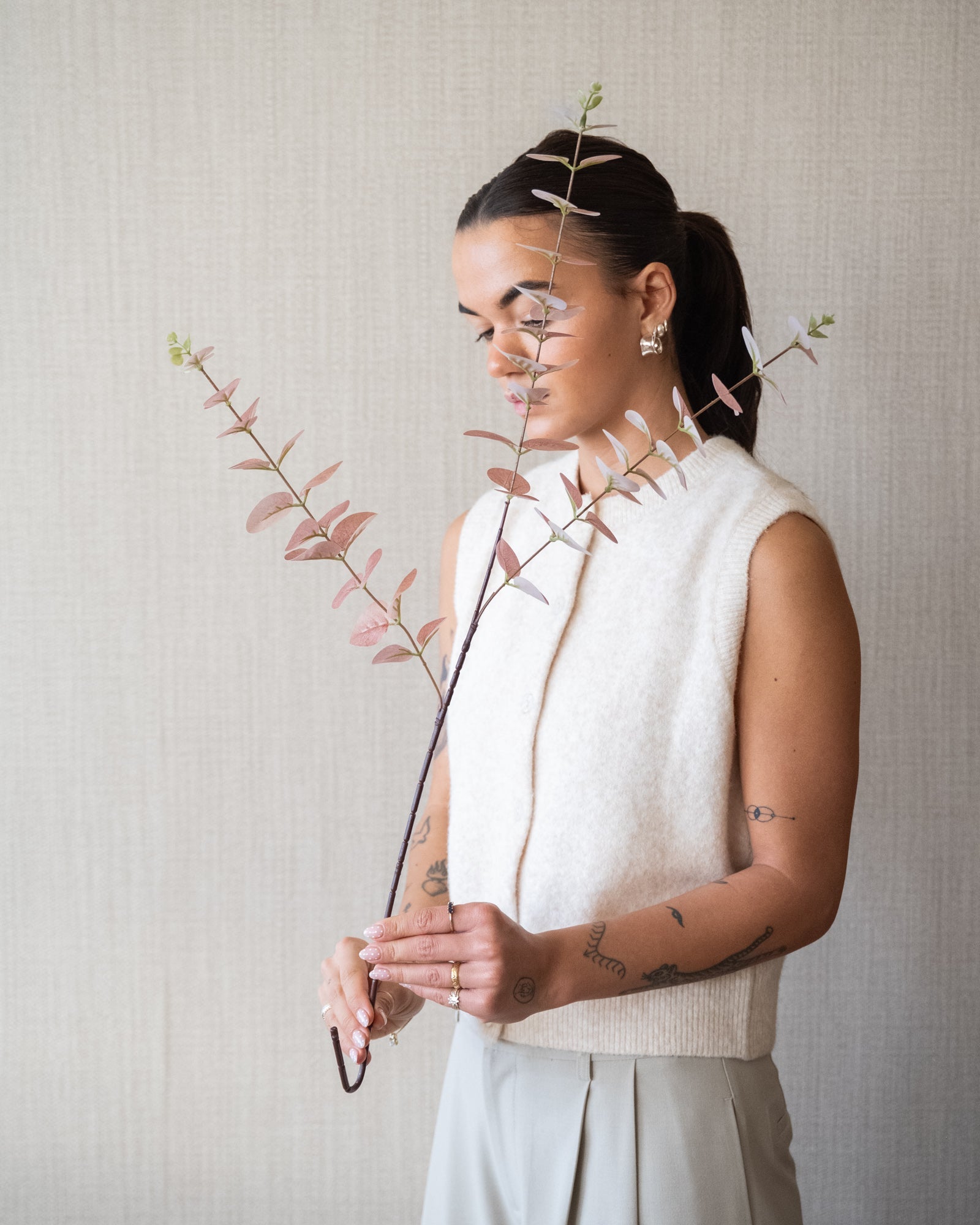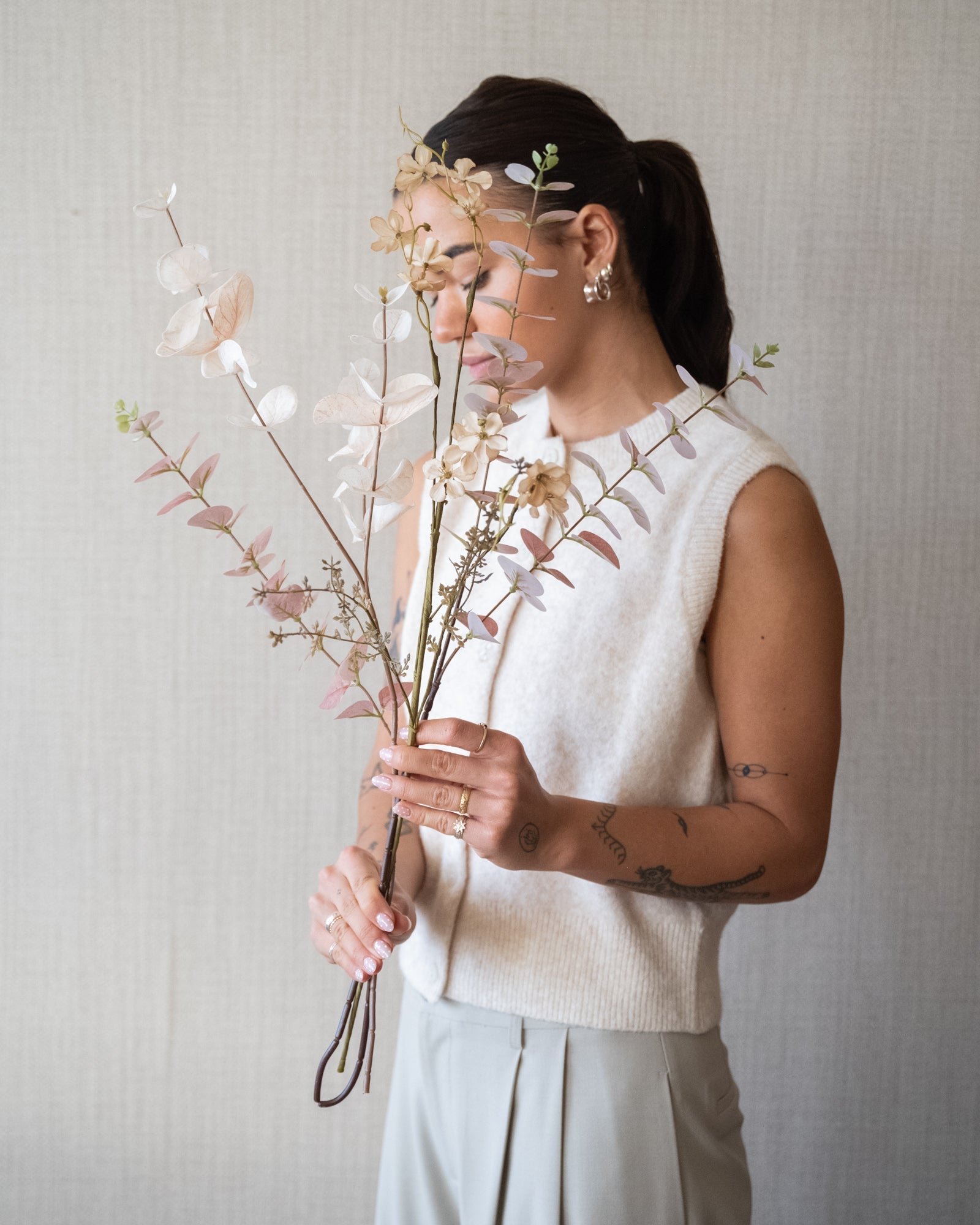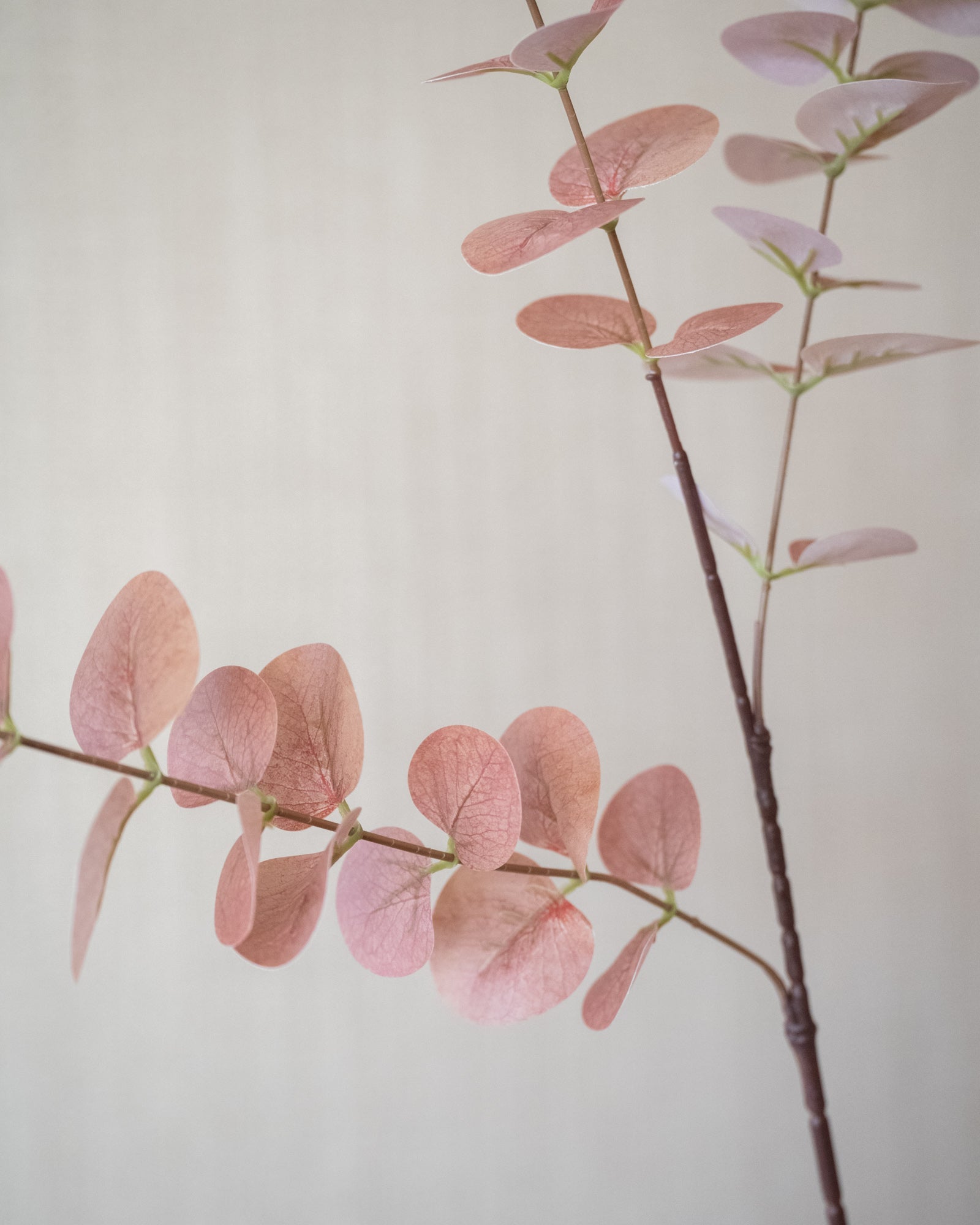 This faux eucalyptus branch in rosewood tones brings a soft, natural ambiance to your home. The subtle blend of powder pink, dusty green, and warm earth tones gives any interior a calm, refined look. Perfect as a single branch in a vase or combined in a larger bouquet, it's enduringly beautiful and completely maintenance-free.