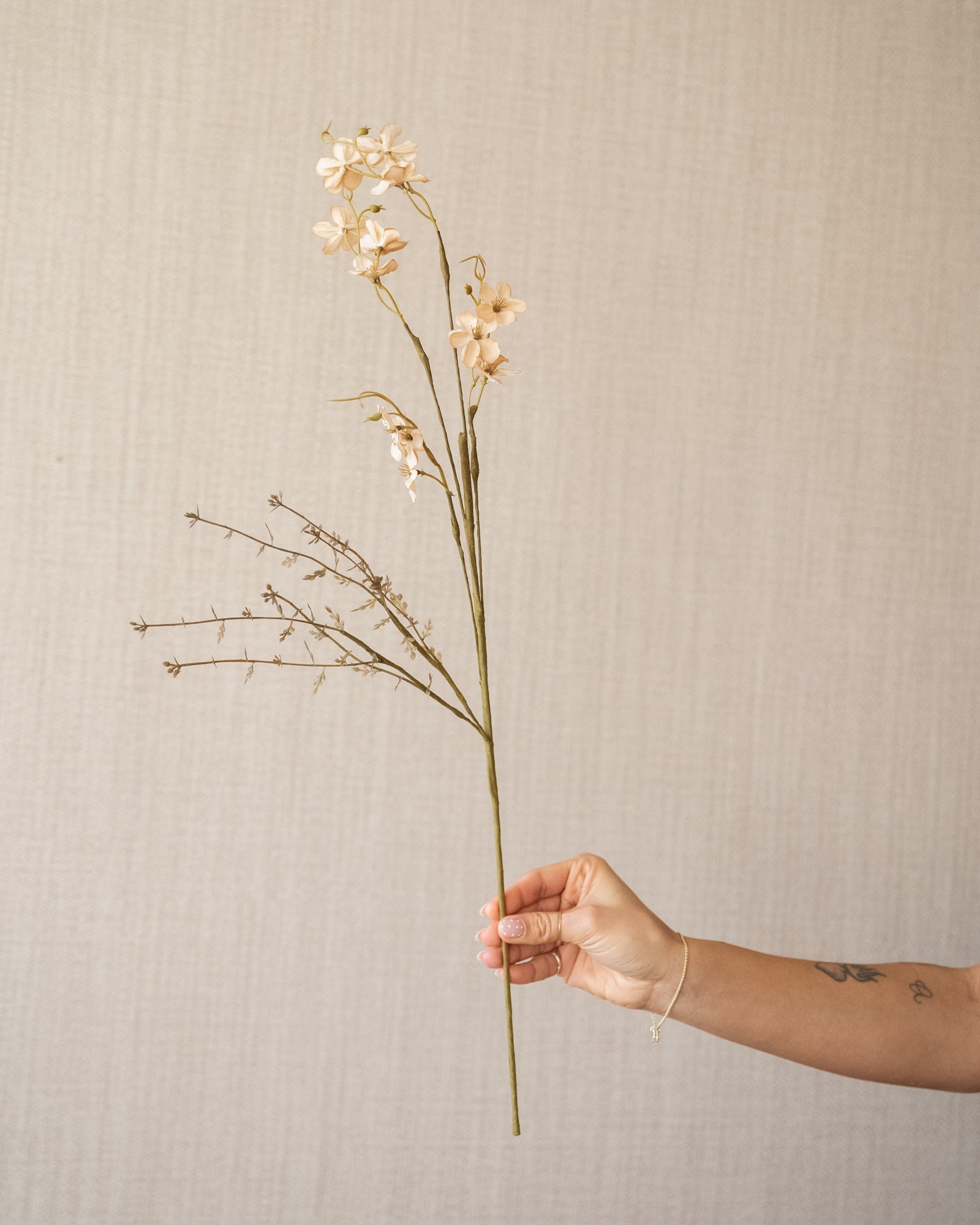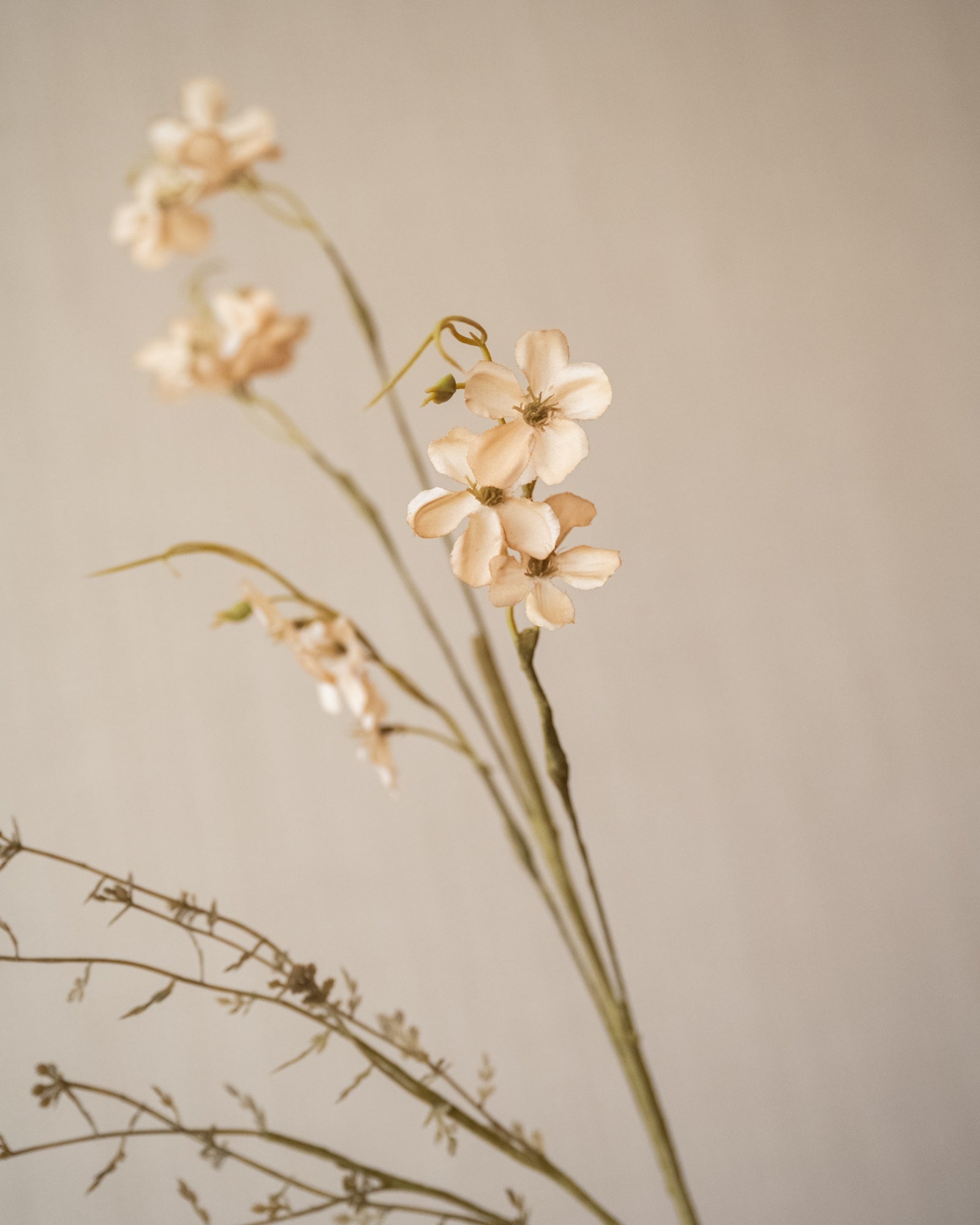 The Faux Flower Jasmine Beige has a refined look with soft flowers and a natural beige hue. This artificial flower brings a calm, elegant atmosphere to your home and is perfect for styling solo or combining in a light bouquet. It looks beautiful in a vase on a table, a dresser, or an open shelf.