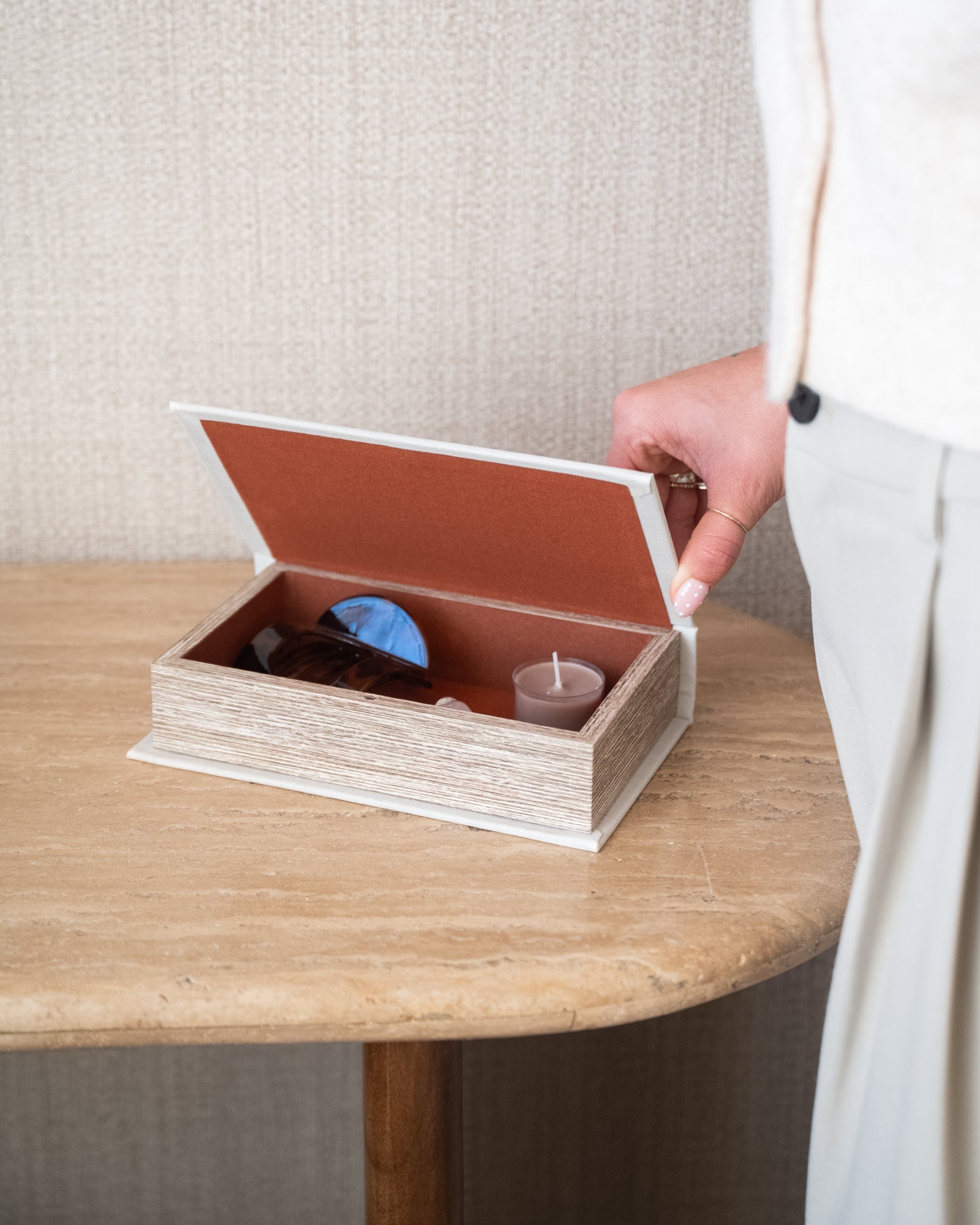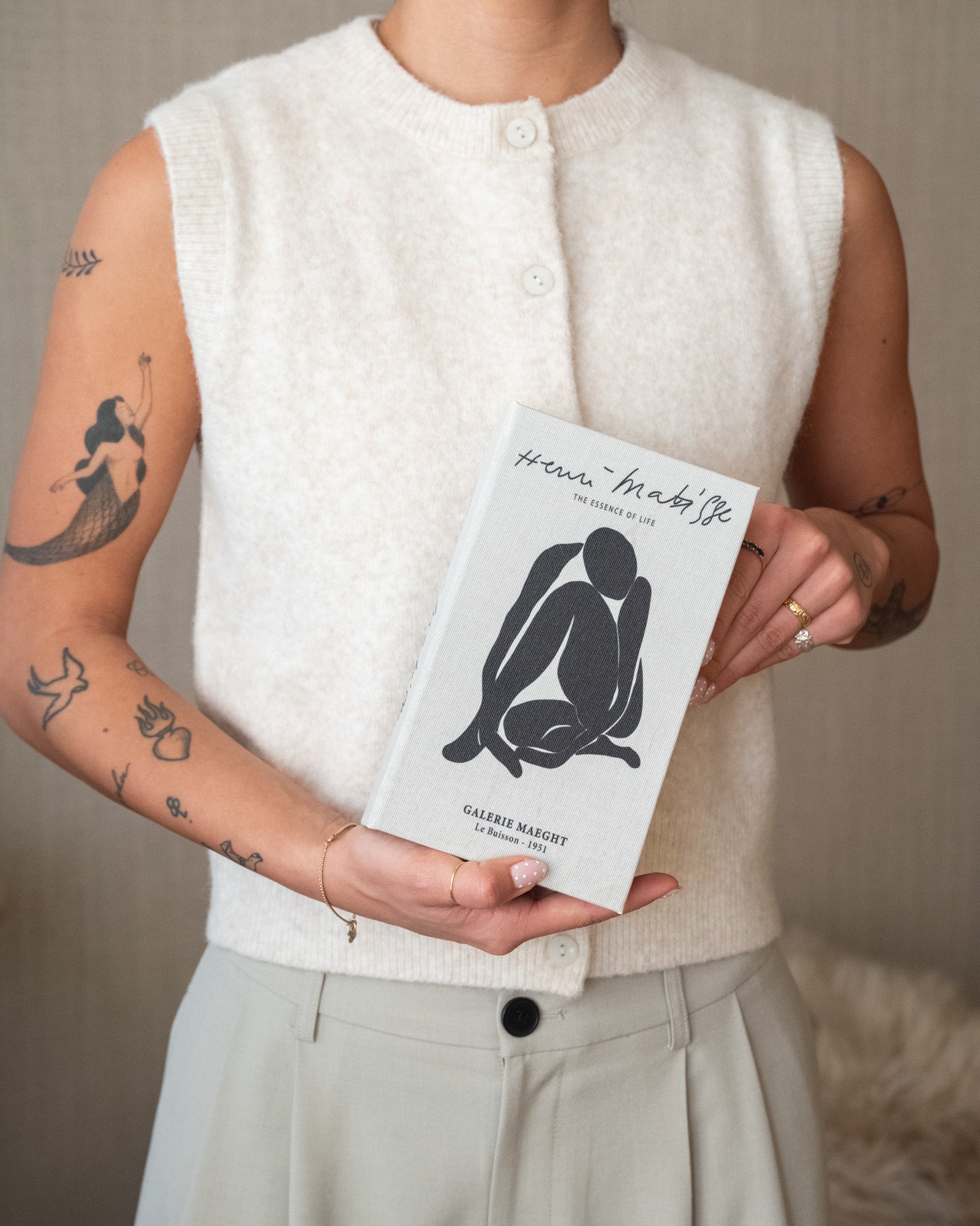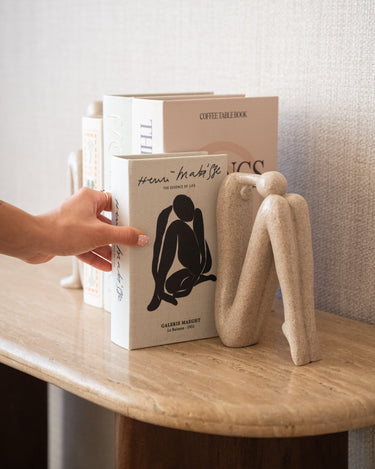 The Henri Matisse Storage Book is a decorative book-shaped storage box inspired by the work of Henri Matisse. The soft off-white hue and graphic illustration create a timeless, artistic look. Perfect for storing small items, it also adds a stylish touch to a shelf, sideboard, or coffee table.