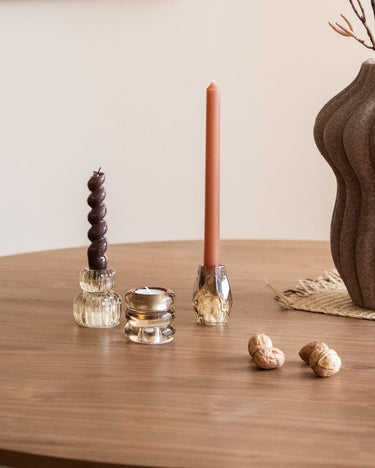 This set of three smoked brown glass candlesticks instantly creates a warm, inviting atmosphere. The organic shapes and subtle ribbed texture give each piece its own unique character, while the warm smoky brown hue creates a soft, inviting glow. They look beautiful grouped together on a table, sideboard, or open shelf, but also stand out enough to be styled individually.