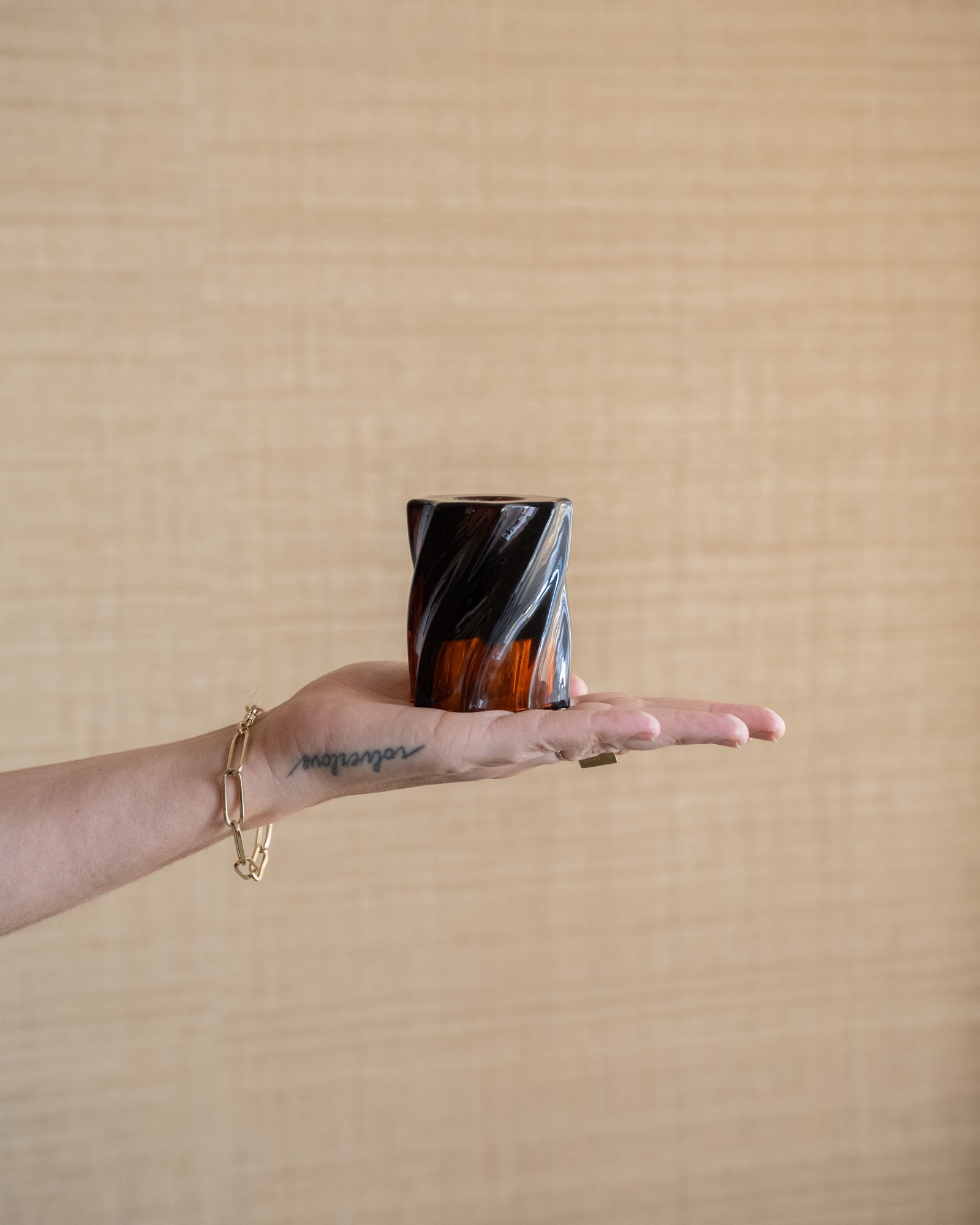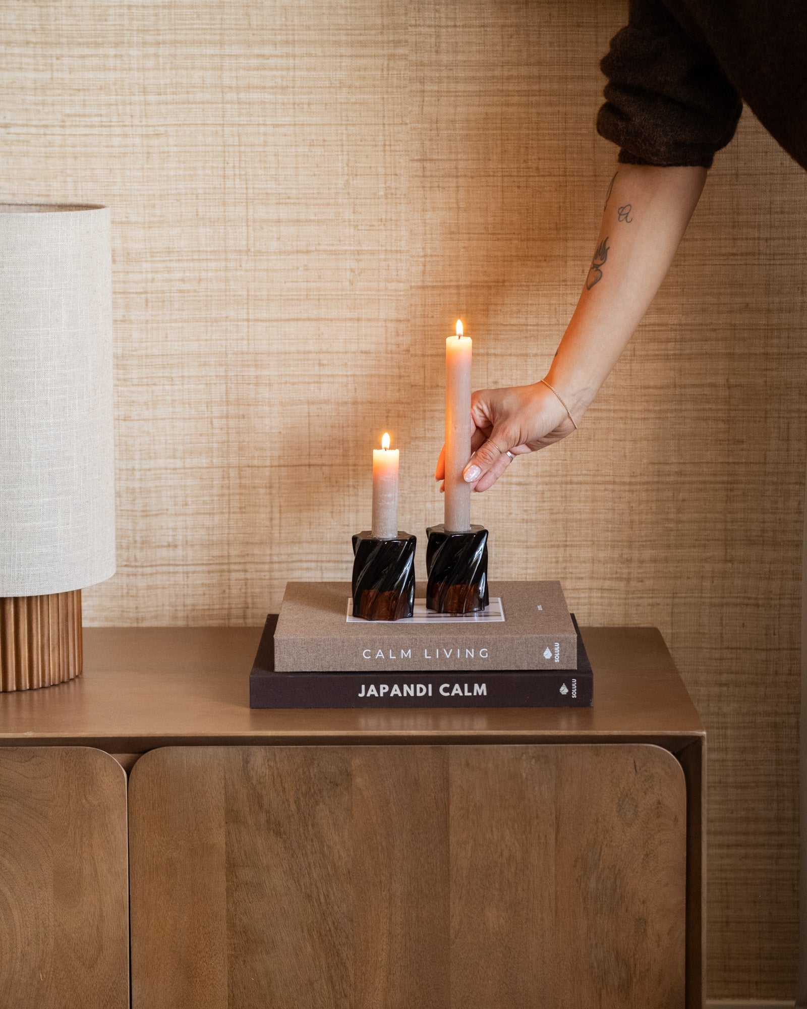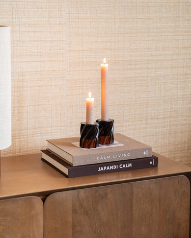 This glass candlestick with a swirl design brings warmth and character to your interior. The deep brown tones and swirled effect create a charming accent on a sideboard, coffee table, or open shelf. Beautiful on their own or combined as a set for added ambiance.