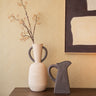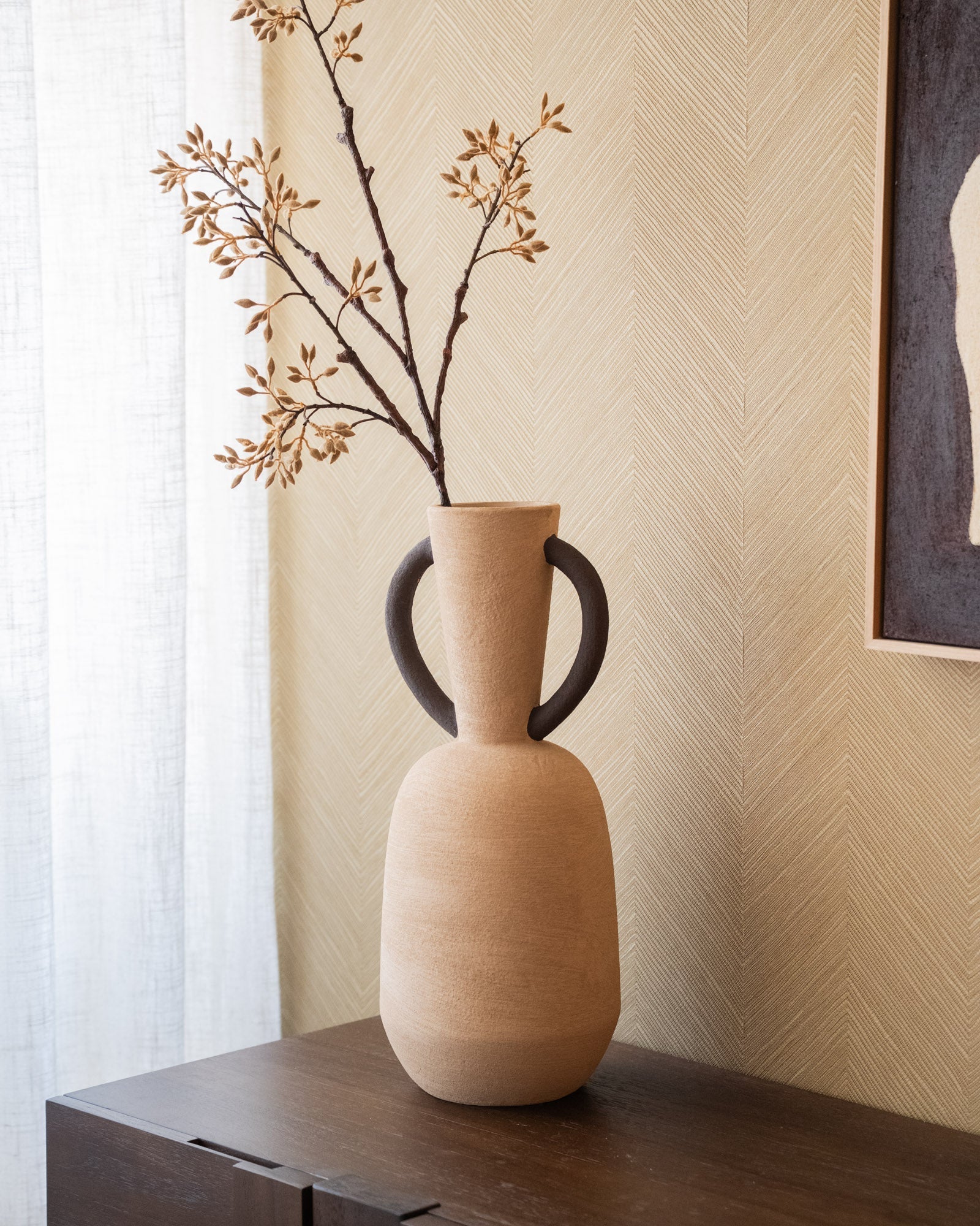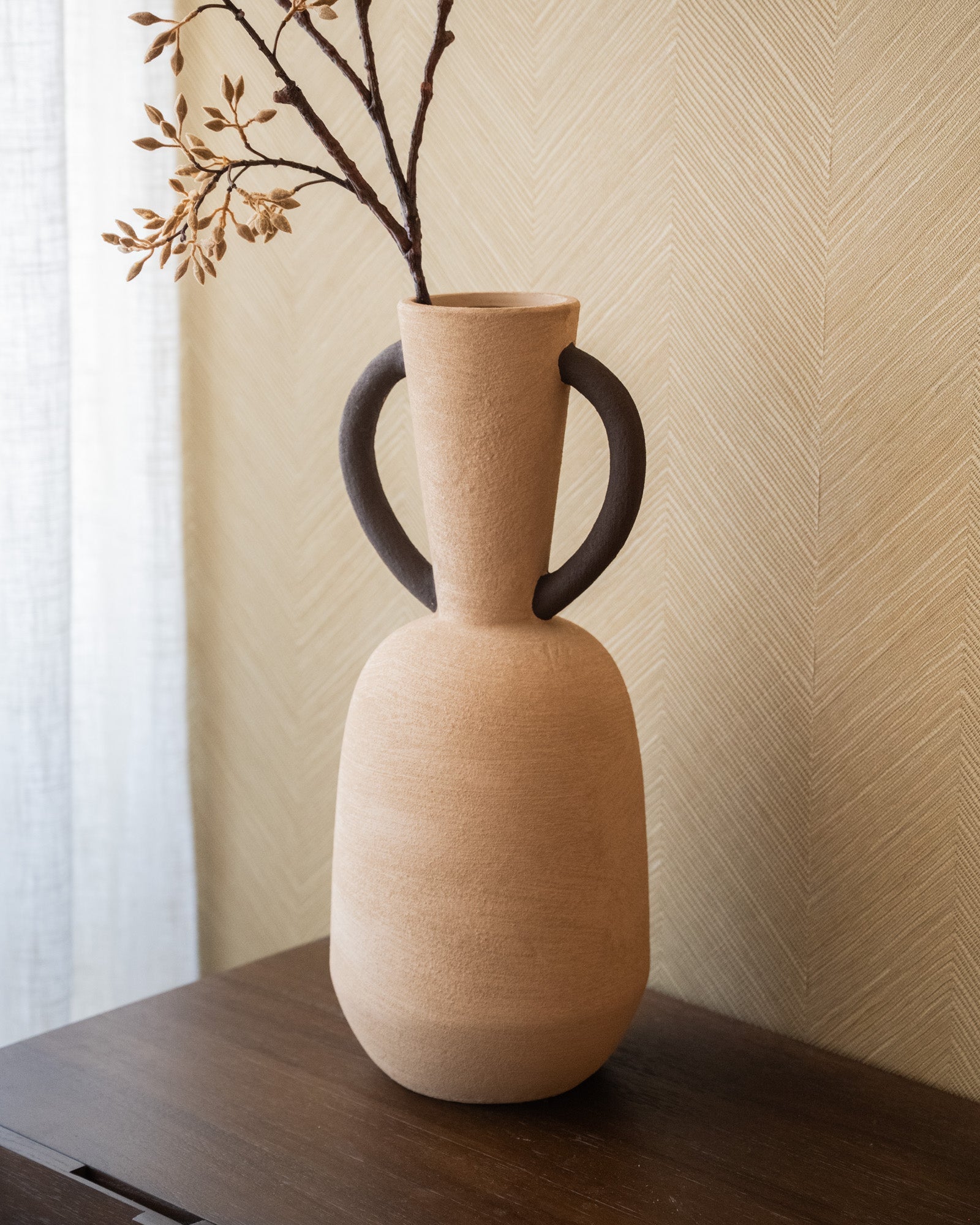 The Handmade Deco Vase Malvasia Beige is a stylish ceramic vase with a soft beige hue and sculptural double handles. The matte, slightly rough finish creates a natural and timeless look. Perfect for a Japanese, modern, or earthy interior.