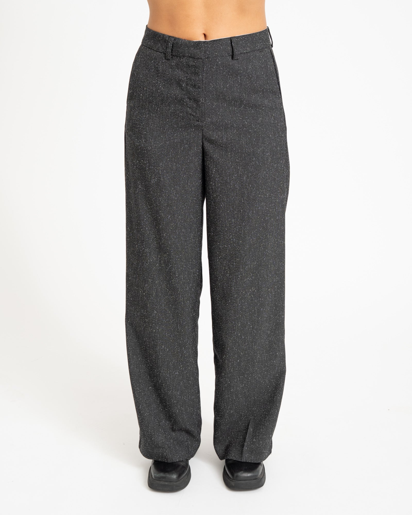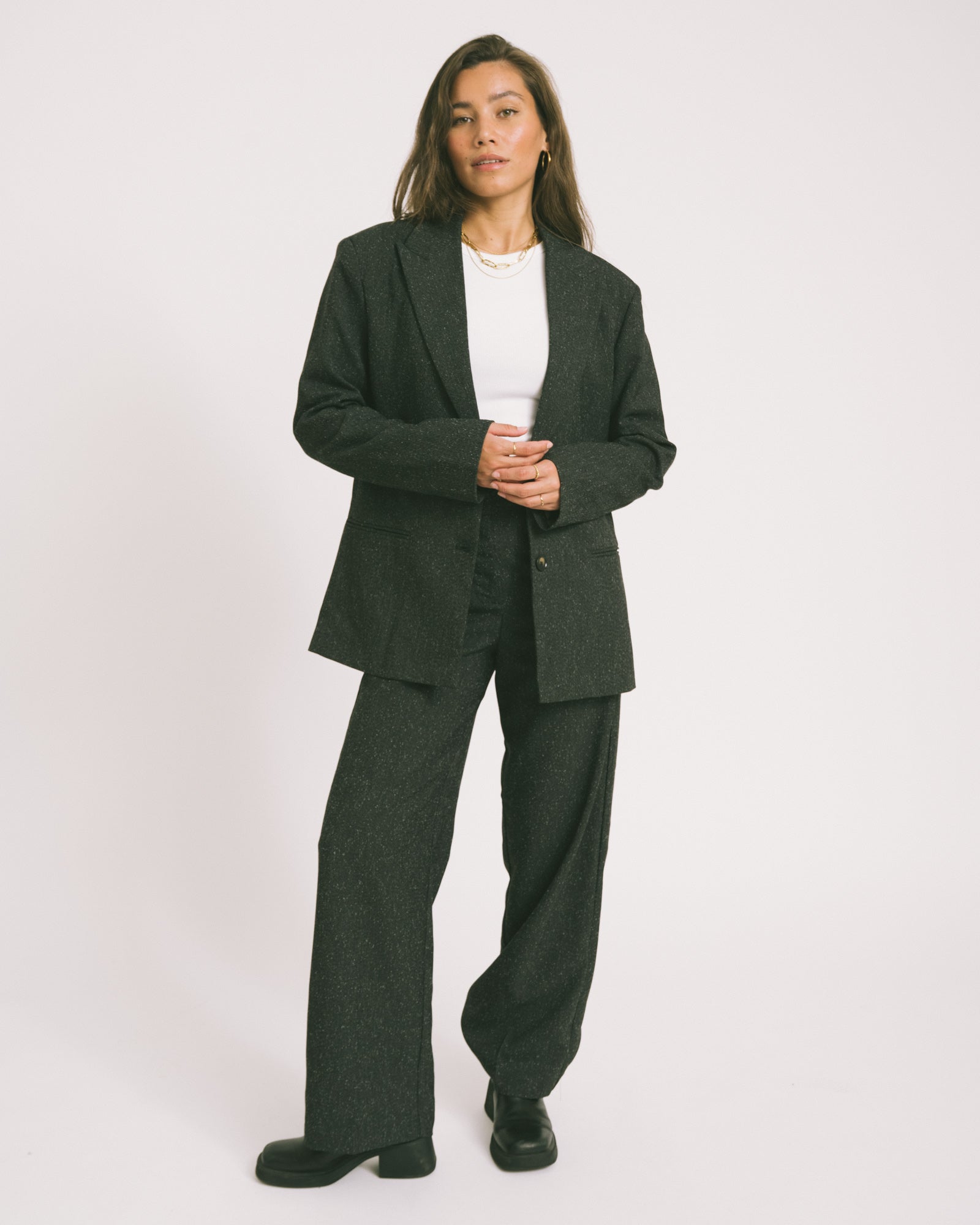 The Ellis Pants have a relaxed, wide-leg fit in a subtle salt and pepper blend. Comfortable and stylish at the same time. Wear them alone with a knit or tee, or pair them with the Ellis Blazer for a powerful suit.