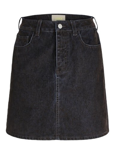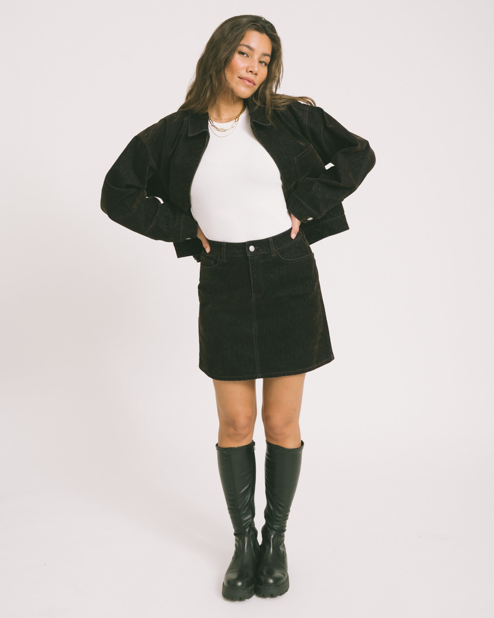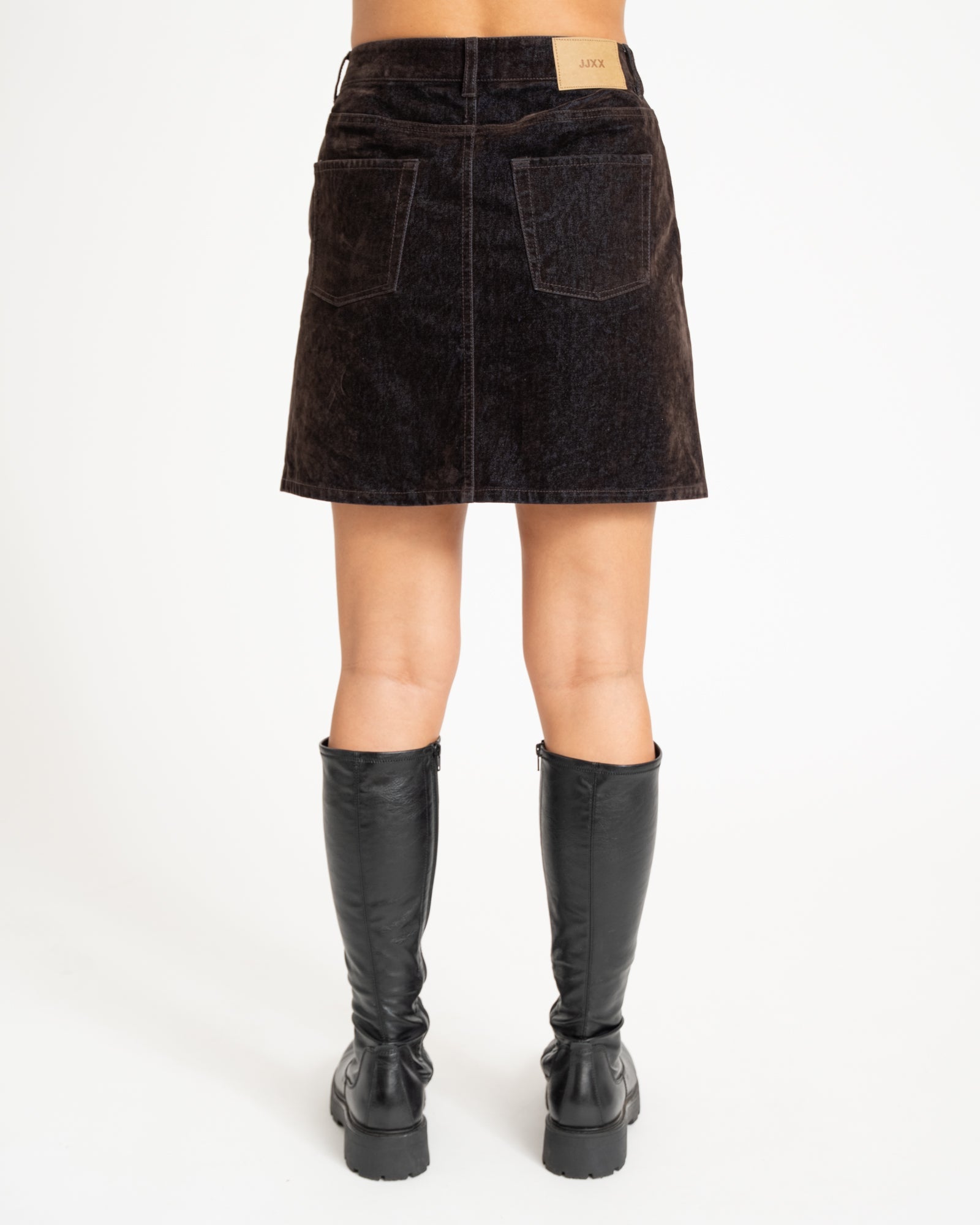 This Short Denim Skirt is a versatile mini skirt that can be worn both edgy and feminine. Made of brown denim with a flock finish and a flattering straight fit.
