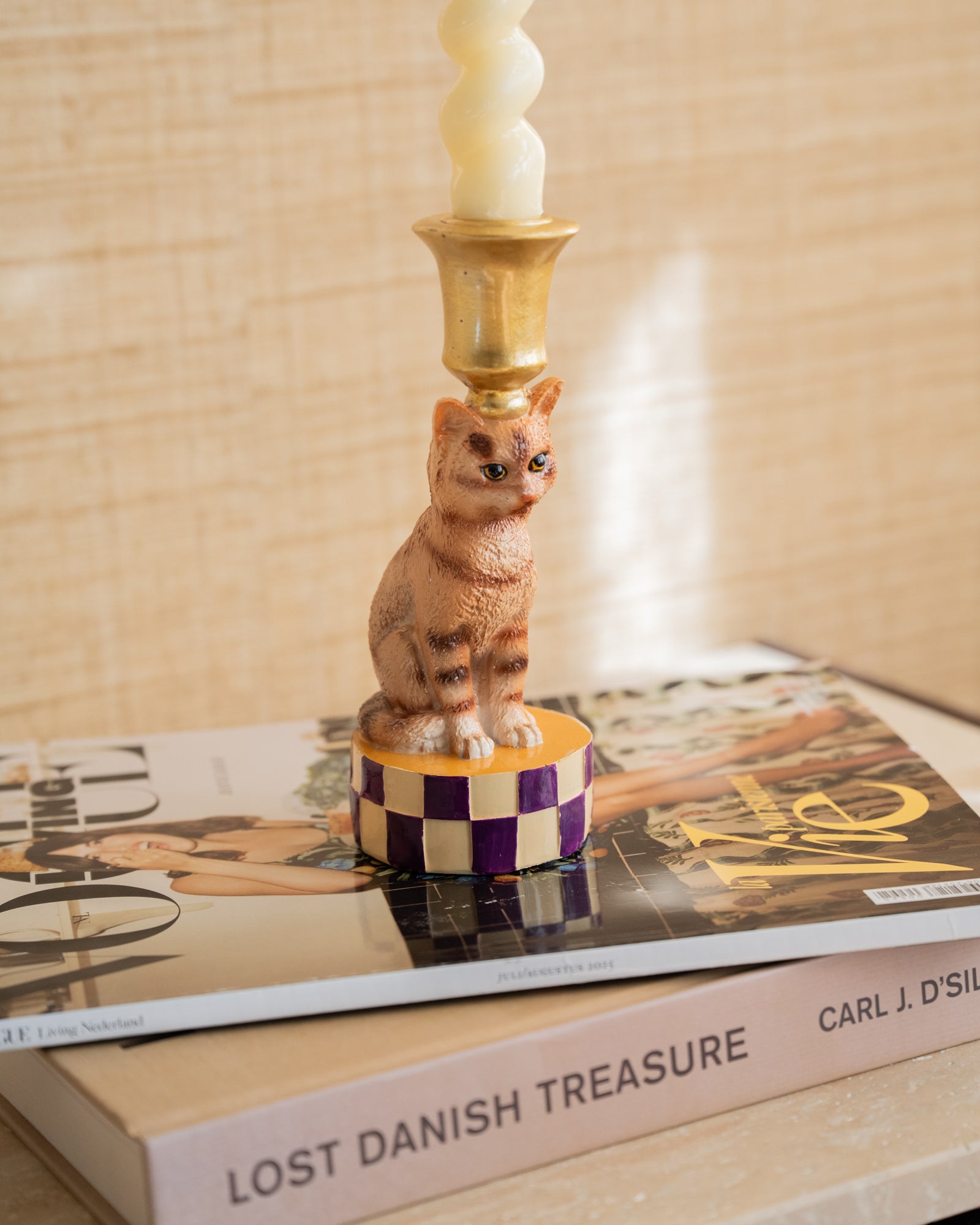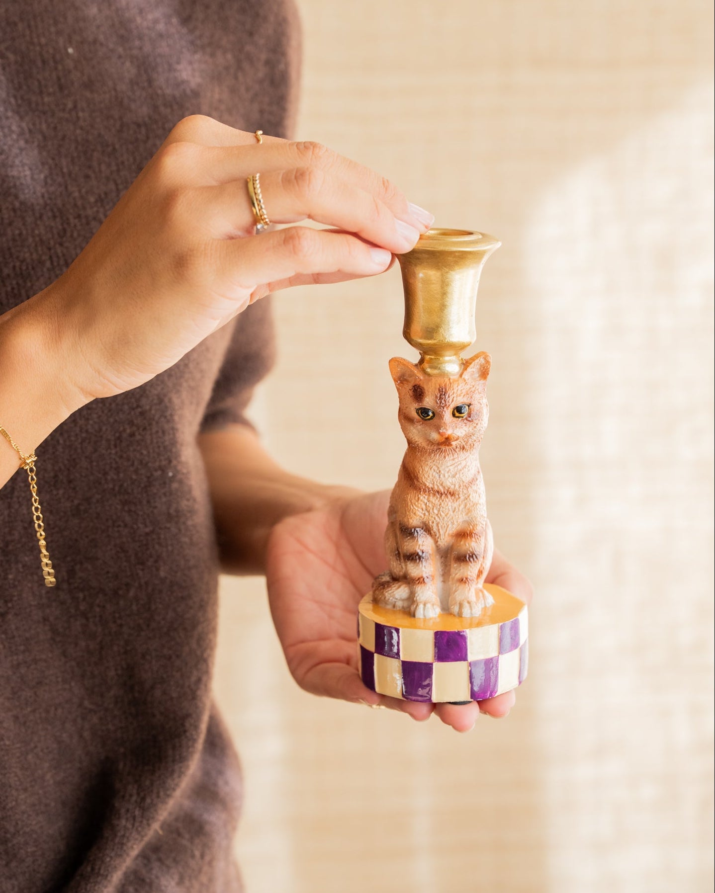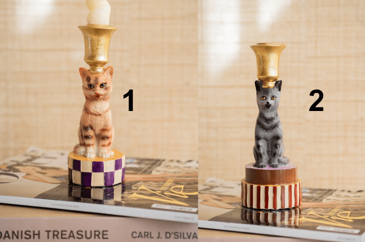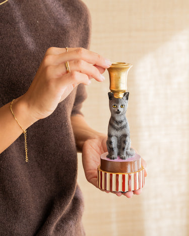Bring playfulness and character into your home with the handmade Candle Holder Cat. Available in orange or gray, with a gold-colored base, these unique candlesticks are real eye-catchers that add style and warmth to any interior.